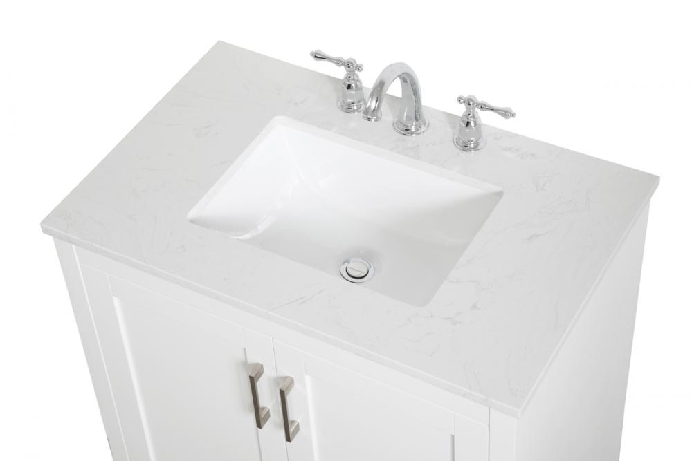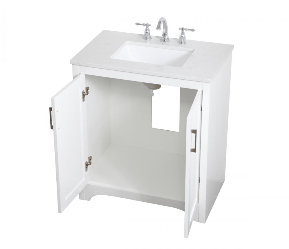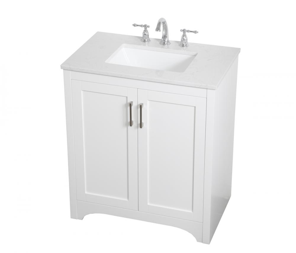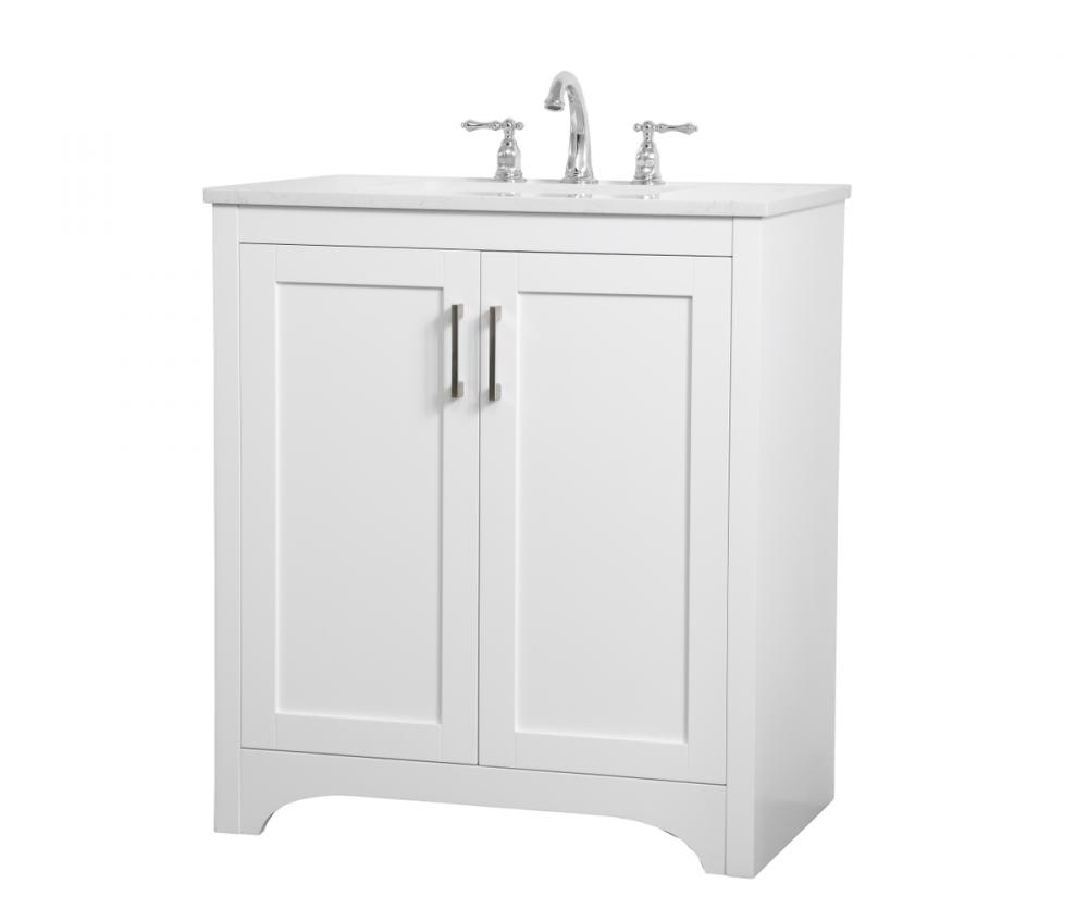 The refined simplicity of this 30" white finish vanity creates a peaceful, yet stylish, atmosphere. Its traditional modernity adds a mature beauty that will elevate any bathroom or powder room--the Calacatta engineered marble counter top adds refined luxe while the brushed nickel handle bars open the two cabinet doors, revealing ample storage space to store and hide away an assortment of bathroom essentials. Whether your home is large or small, this vanity will surely fit in well.