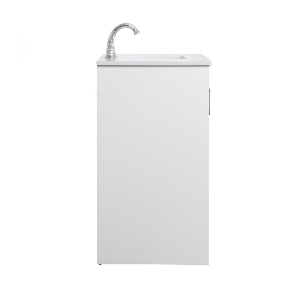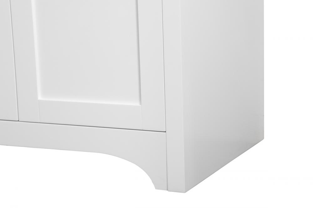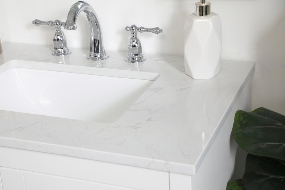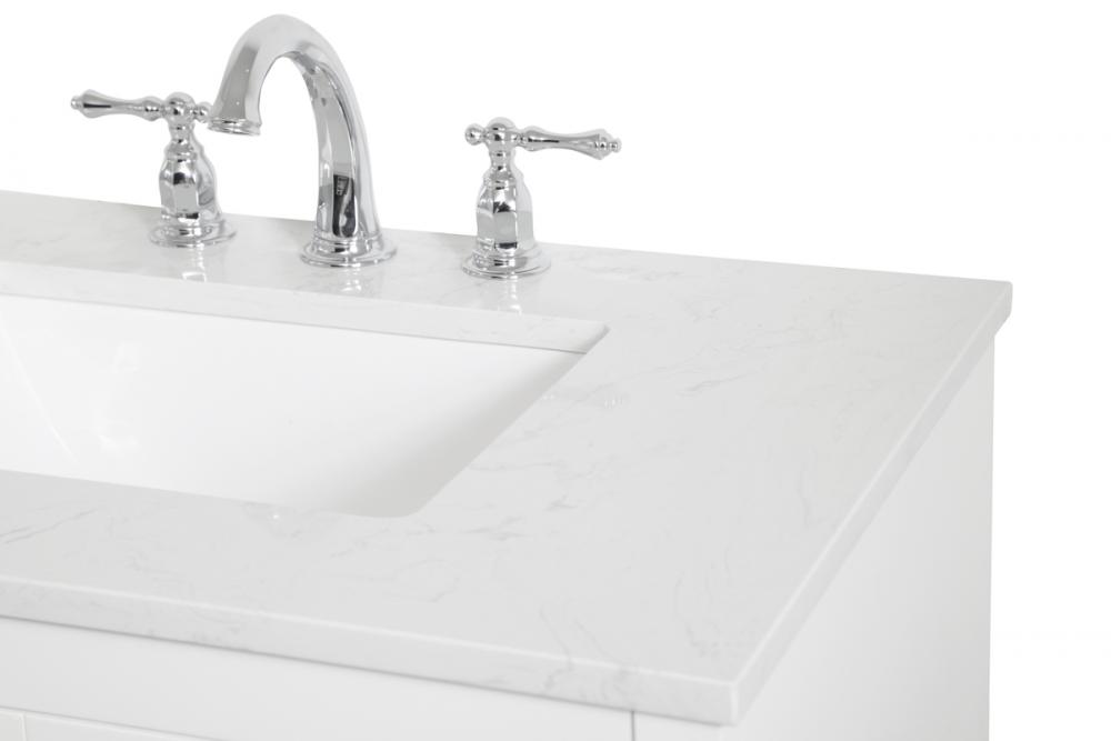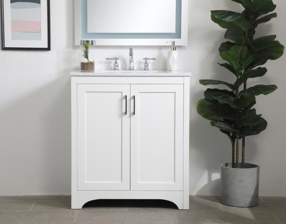 The refined simplicity of this 30" white finish vanity creates a peaceful, yet stylish, atmosphere. Its traditional modernity adds a mature beauty that will elevate any bathroom or powder room--the Calacatta engineered marble counter top adds refined luxe while the brushed nickel handle bars open the two cabinet doors, revealing ample storage space to store and hide away an assortment of bathroom essentials. Whether your home is large or small, this vanity will surely fit in well.