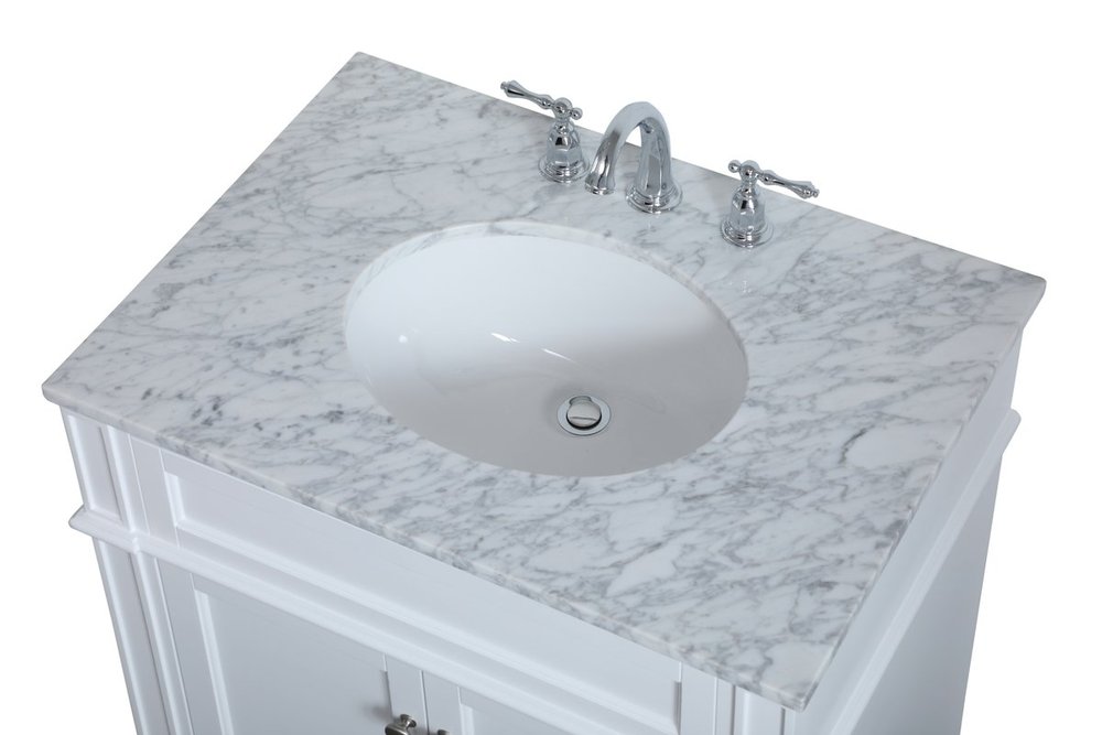 Modern sophistication is defined within the urbane white finish and brushed steel knobs of this compact vanity. Its length makes it the perfect addition to any sized home, and saves space with its storage area hidden behind the double cabinet doors. Topped with a Carrara white marble counter top and a porcelain sink, this design will add everlasting class to your bathroom and powder room.