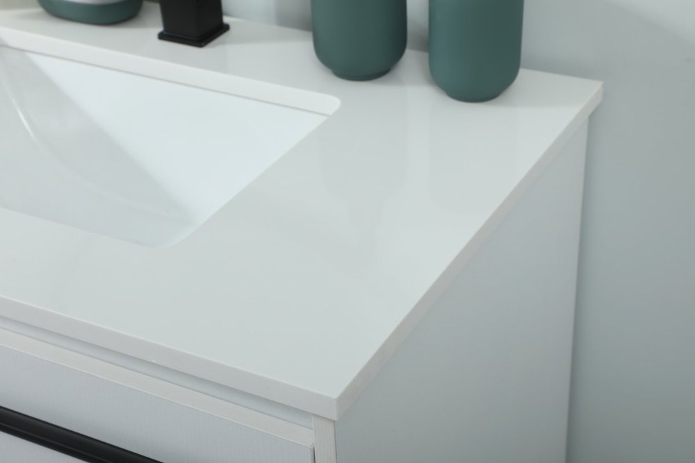 Comes with an undermount porcelain sink and durable ivory white engineered marble stone top