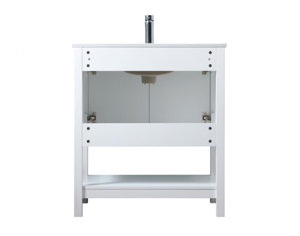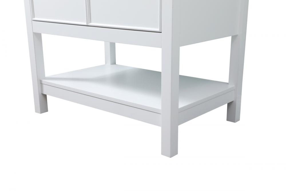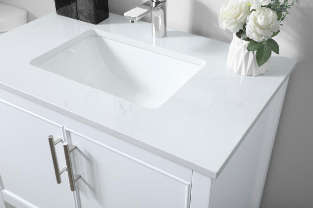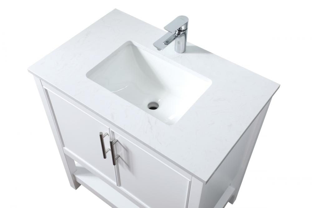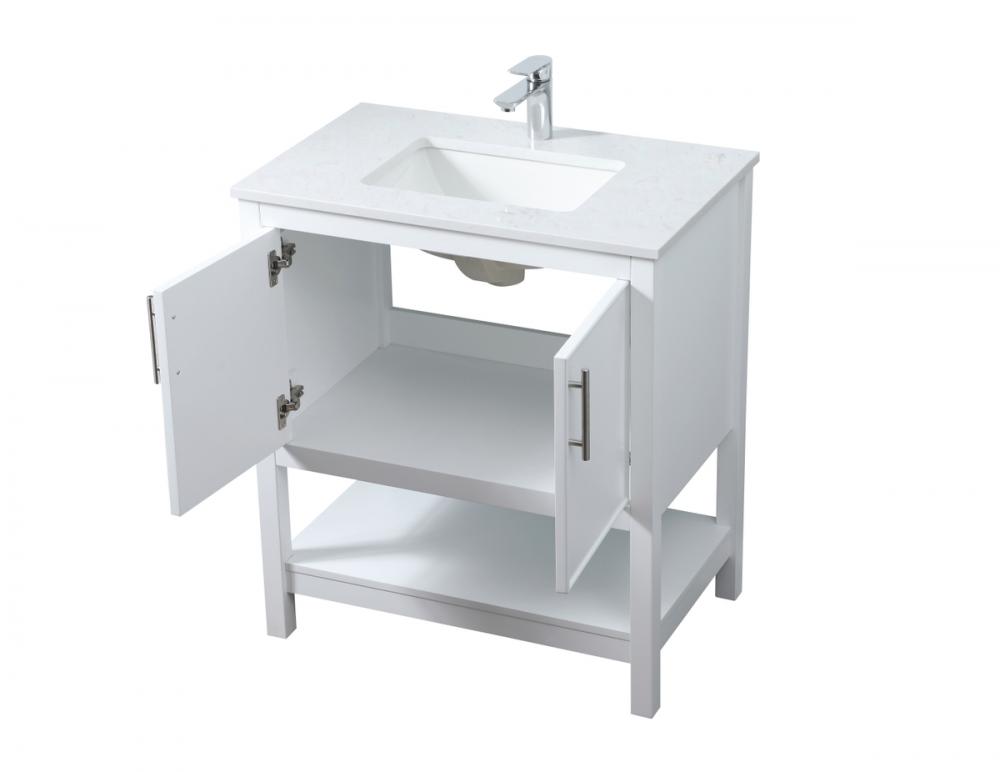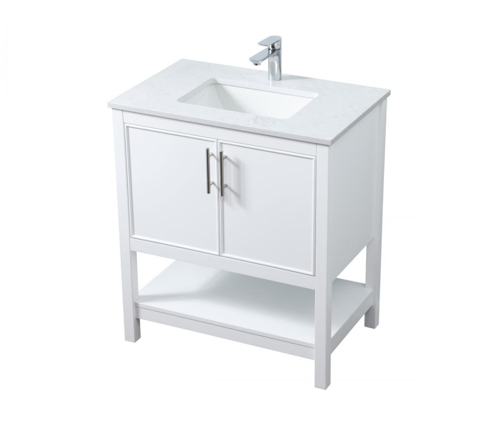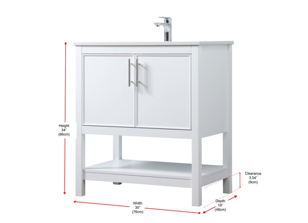 Experience the epitome of modern elegance with our meticulously crafted 30-inch vanity. Boasting a chic straight edge cut and an engineered marble top, this design features one functional cabinet with two soft-close doors, ensuring seamless and stylish access to ample storage. The vanity is complemented by a sophisticated undermount porcelain sink, merging style with practicality for an elevated bathroom experience. Adorned with two sleek pulls and featuring a lower open shelf, it seamlessly combines contemporary aesthetics with functional design. Additionally, the single pre-drilled hole allows for easy faucet personalization, adding a final touch of elegance to your unique bathroom. Redefine your space with this versatile and stylish addition.