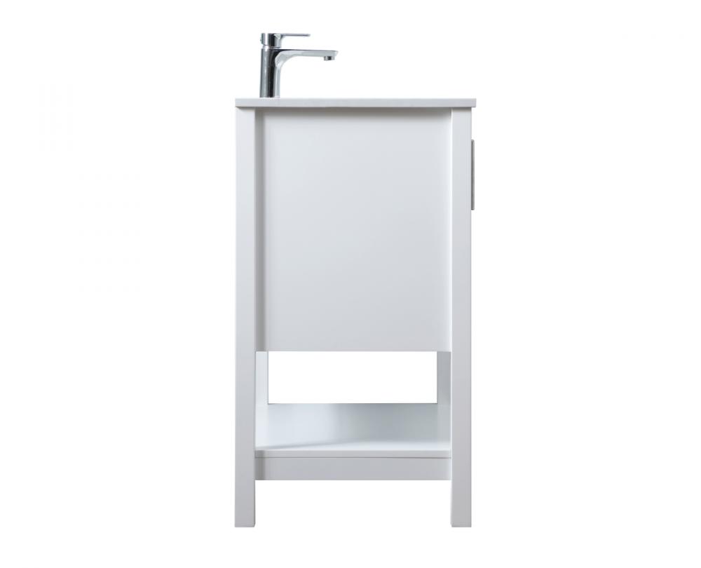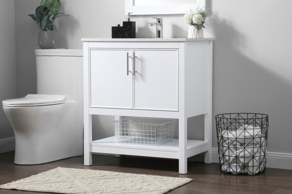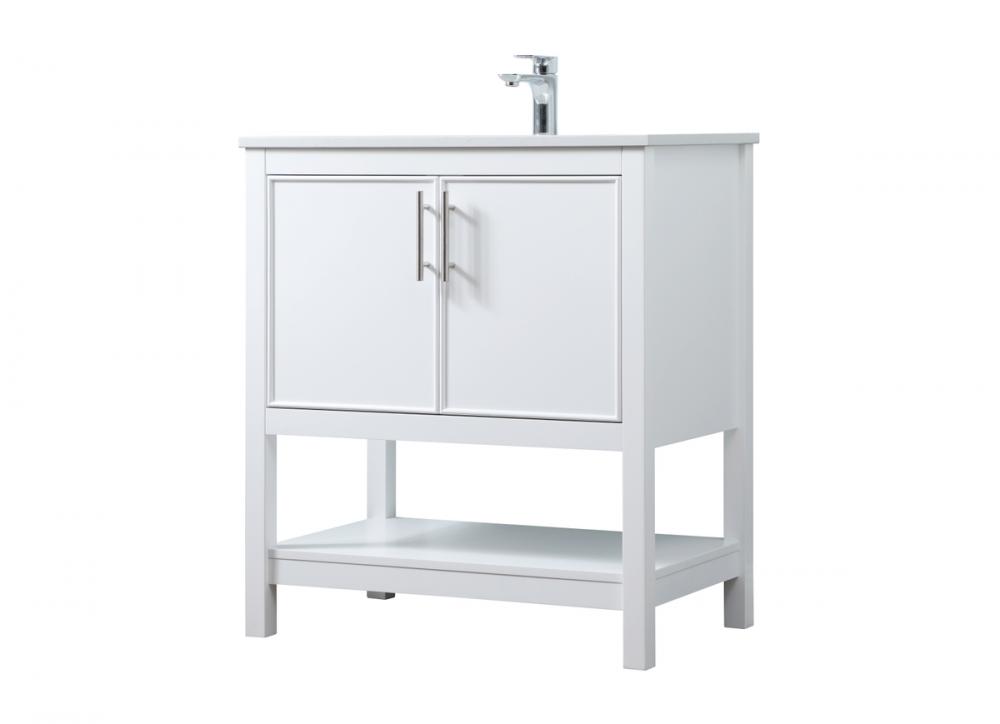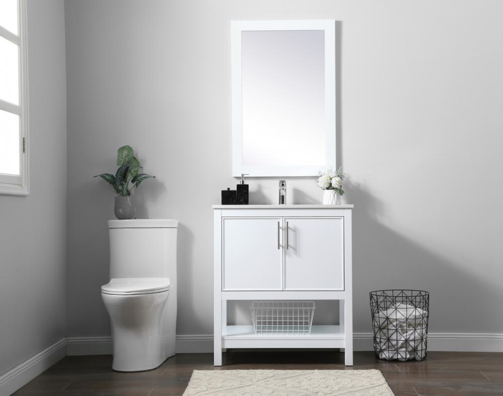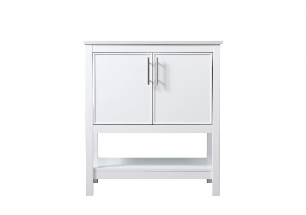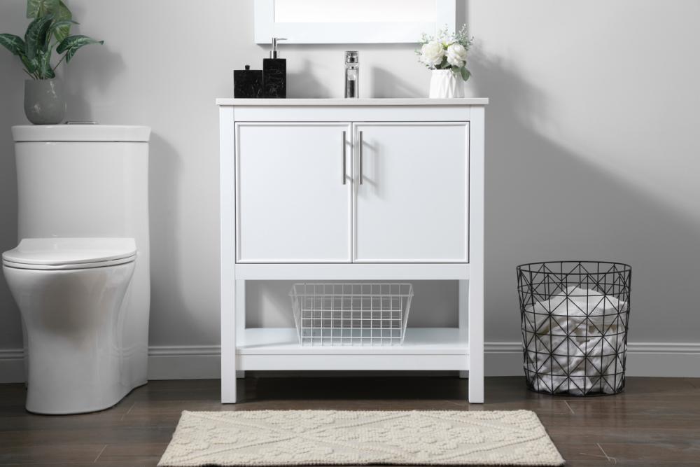 Experience the epitome of modern elegance with our meticulously crafted 30-inch vanity. Boasting a chic straight edge cut and an engineered marble top, this design features one functional cabinet with two soft-close doors, ensuring seamless and stylish access to ample storage. The vanity is complemented by a sophisticated undermount porcelain sink, merging style with practicality for an elevated bathroom experience. Adorned with two sleek pulls and featuring a lower open shelf, it seamlessly combines contemporary aesthetics with functional design. Additionally, the single pre-drilled hole allows for easy faucet personalization, adding a final touch of elegance to your unique bathroom. Redefine your space with this versatile and stylish addition.