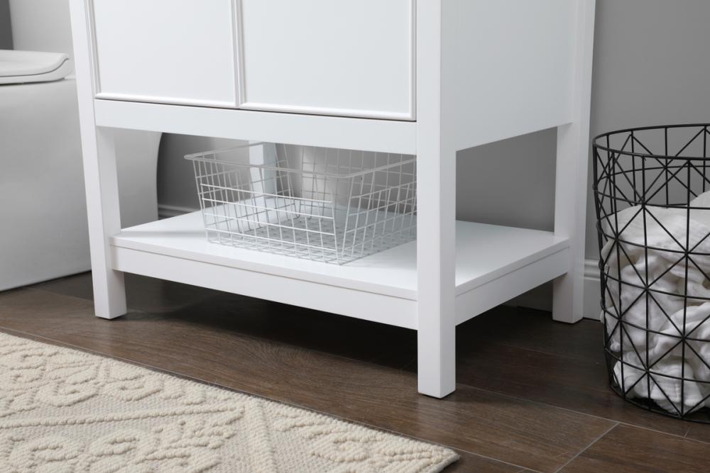 Boasting a lower open shelf for additional storage, this vanity offers a practical area to display decor or stow away essentials, seamlessly blending functionality with a touch of style for your bathroom.