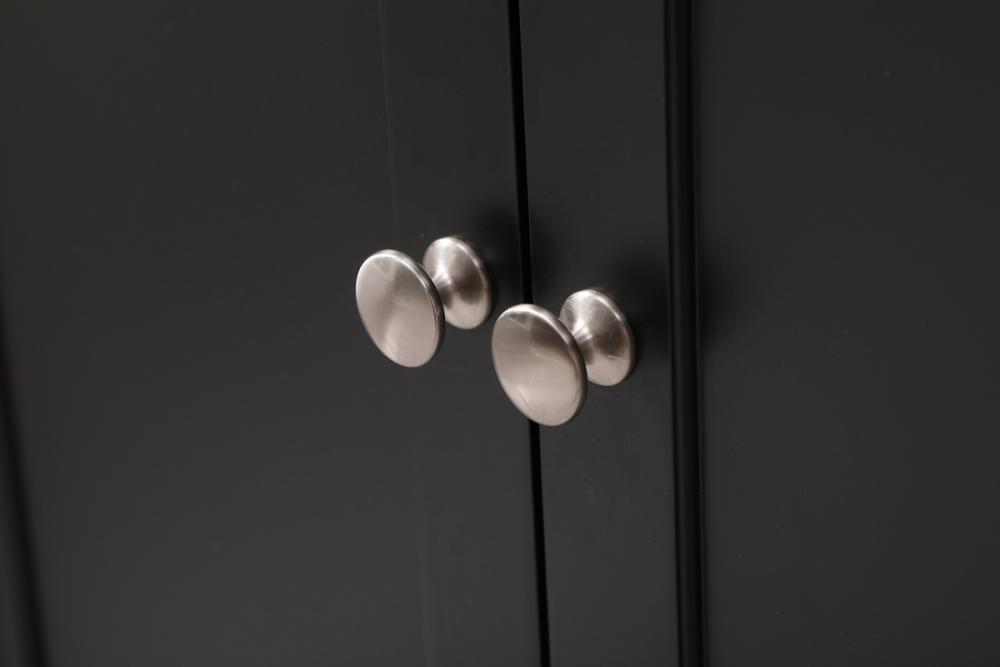 Includes brushed steel hardware and features soft closing doors