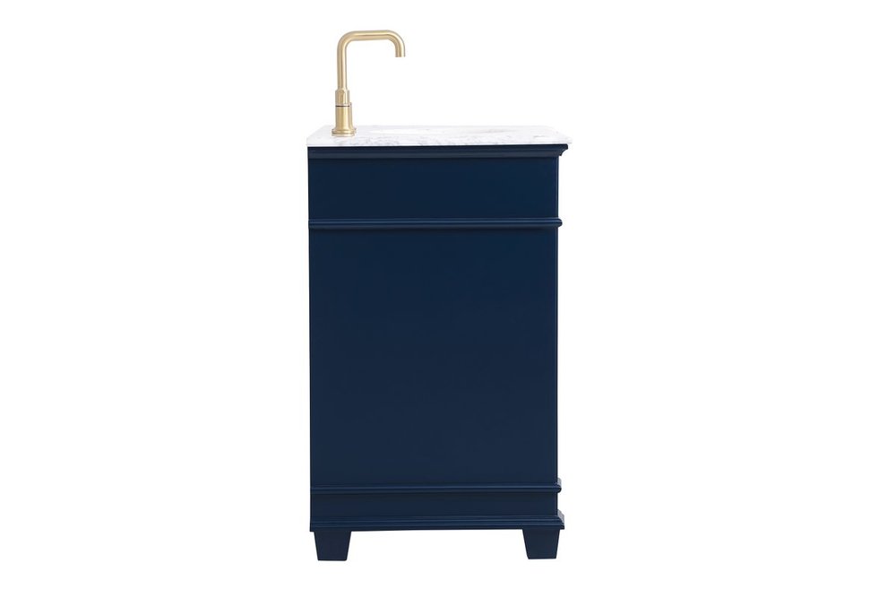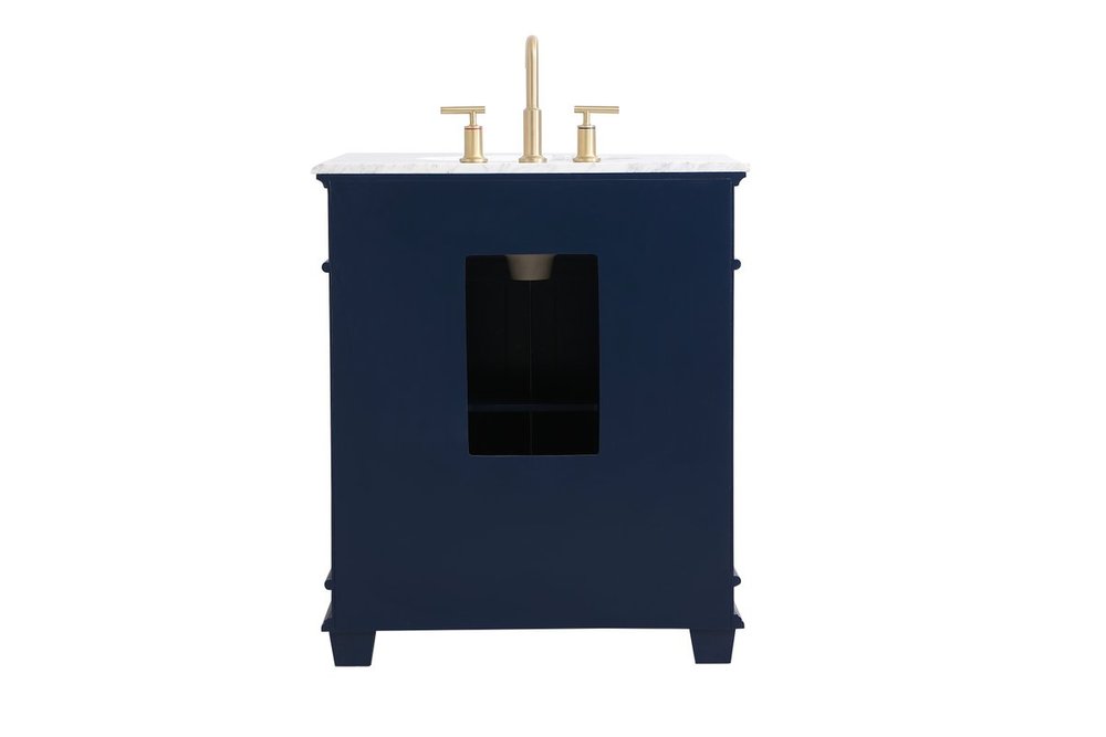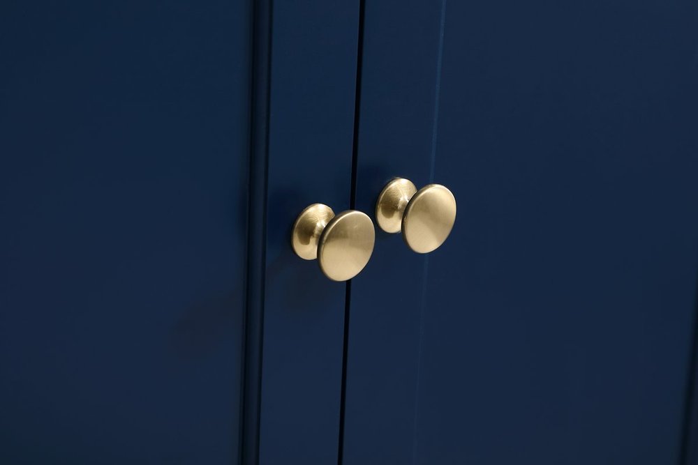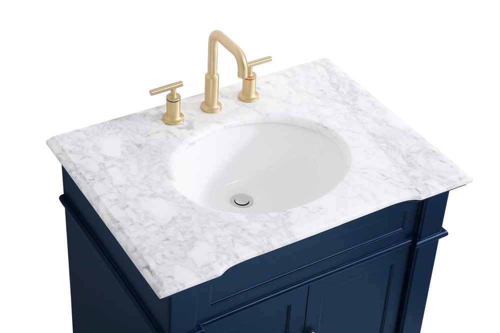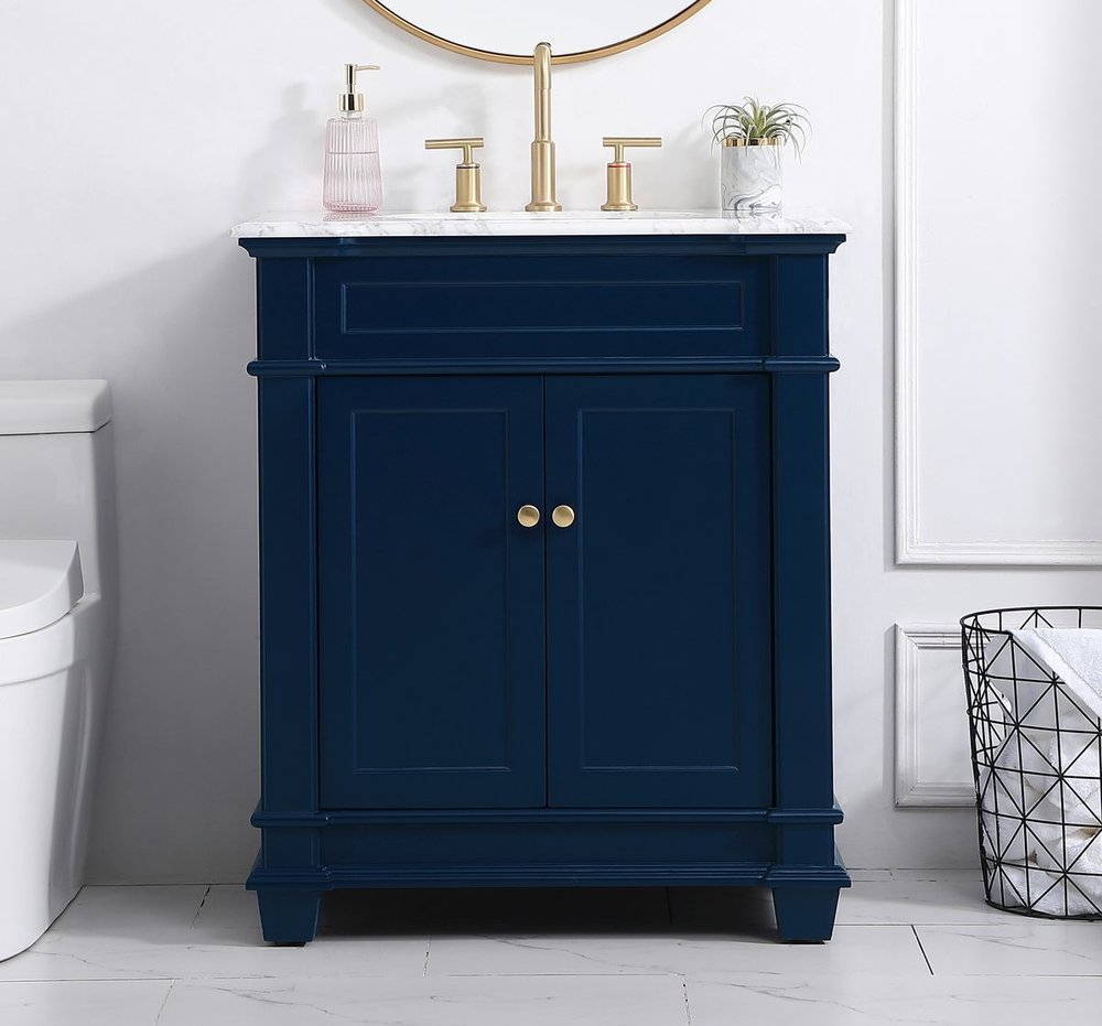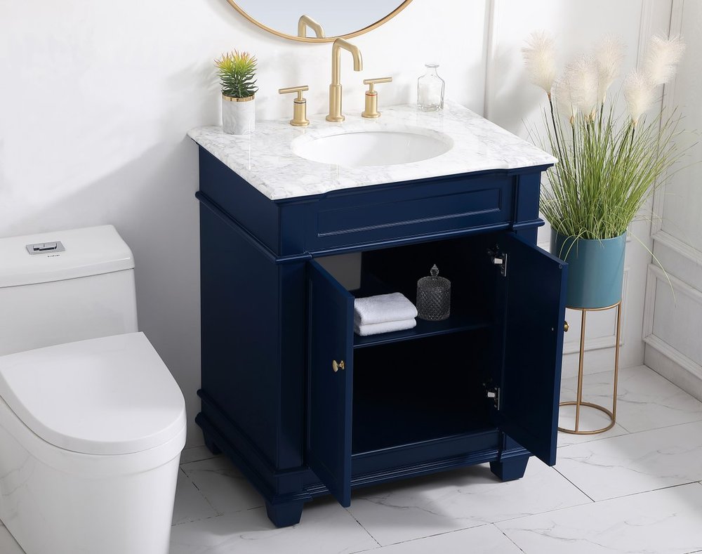 The Wesley Collection vanity cabinet will bring a settle pop of color into your bathroom. The navy blue is a cool color which creates a calming atmosphere in the room. The gold knobs bring a vibrant touch to balance the vanity. With the detailed engravings, the cabinet catches eyes with its beautiful lining work. Open the cabinet doors to store what you desire and make use of the spacious area. To top it off, the Carrara white marble adds a luxury and modern finish to the countertop.