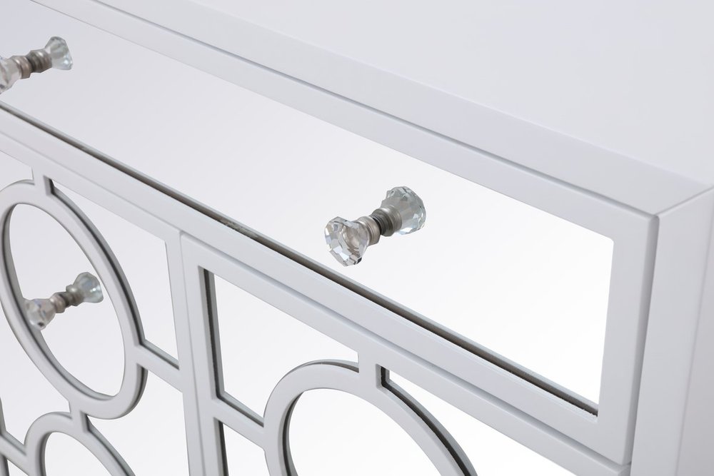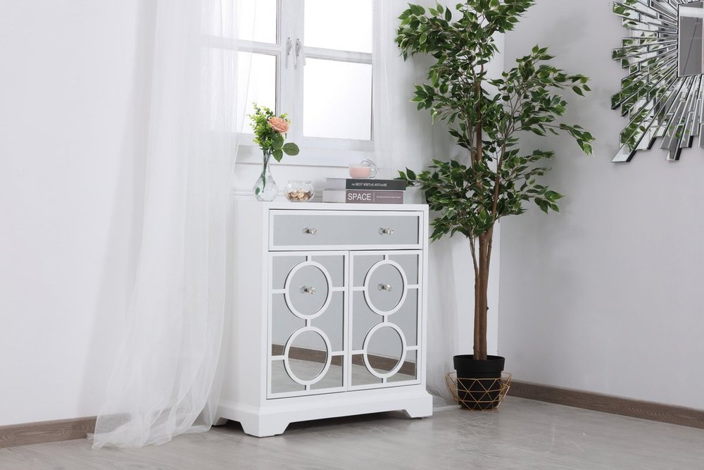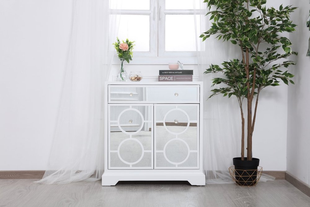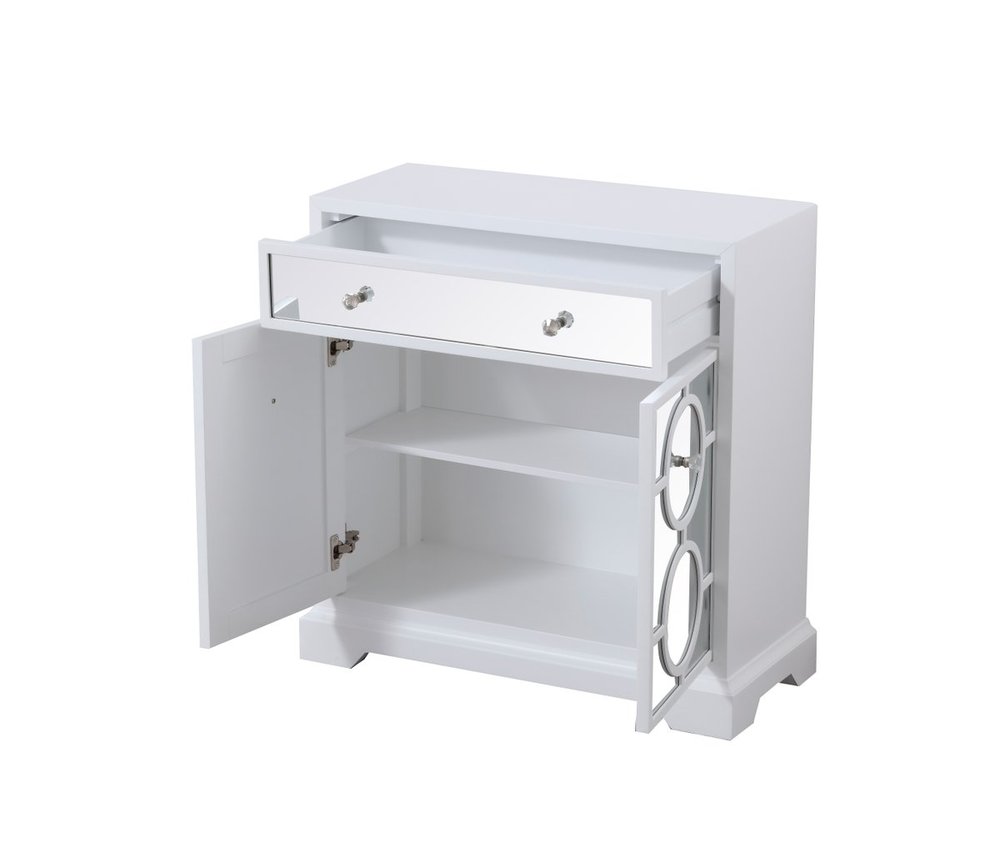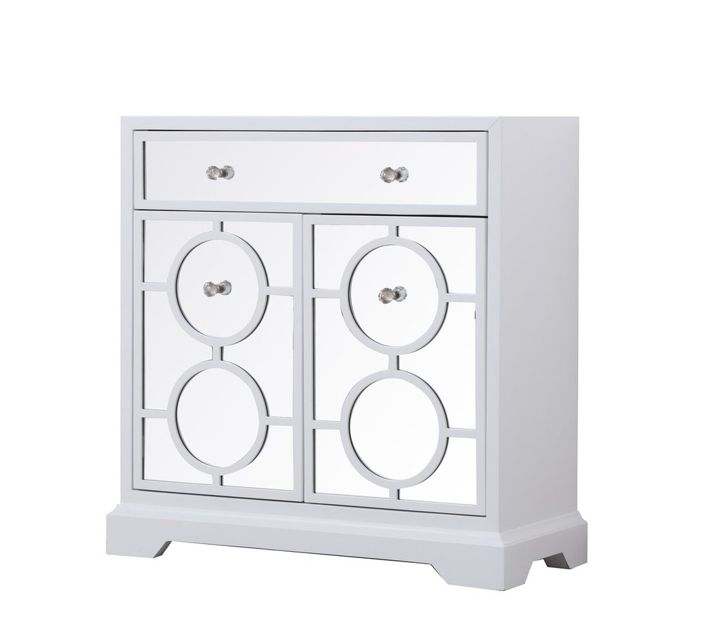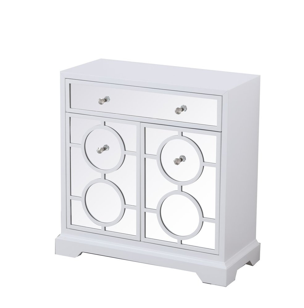 Add a touch of class to any room with this stunning accent chest. Hand painted in white with beaming mirrored surfaces and circle overlay, it opens up the visual space in the room while imbuing it with glamour. This functional transitional chest comes with one drawer, two doors, sparkling crystal knobs, on solid tapered tapered legs.