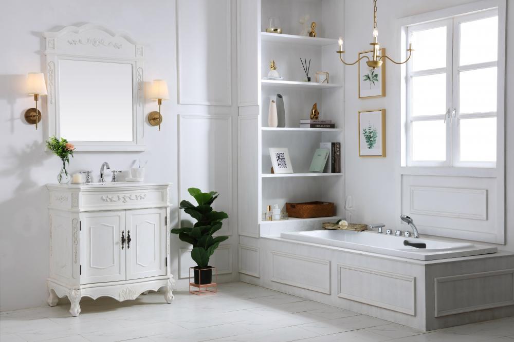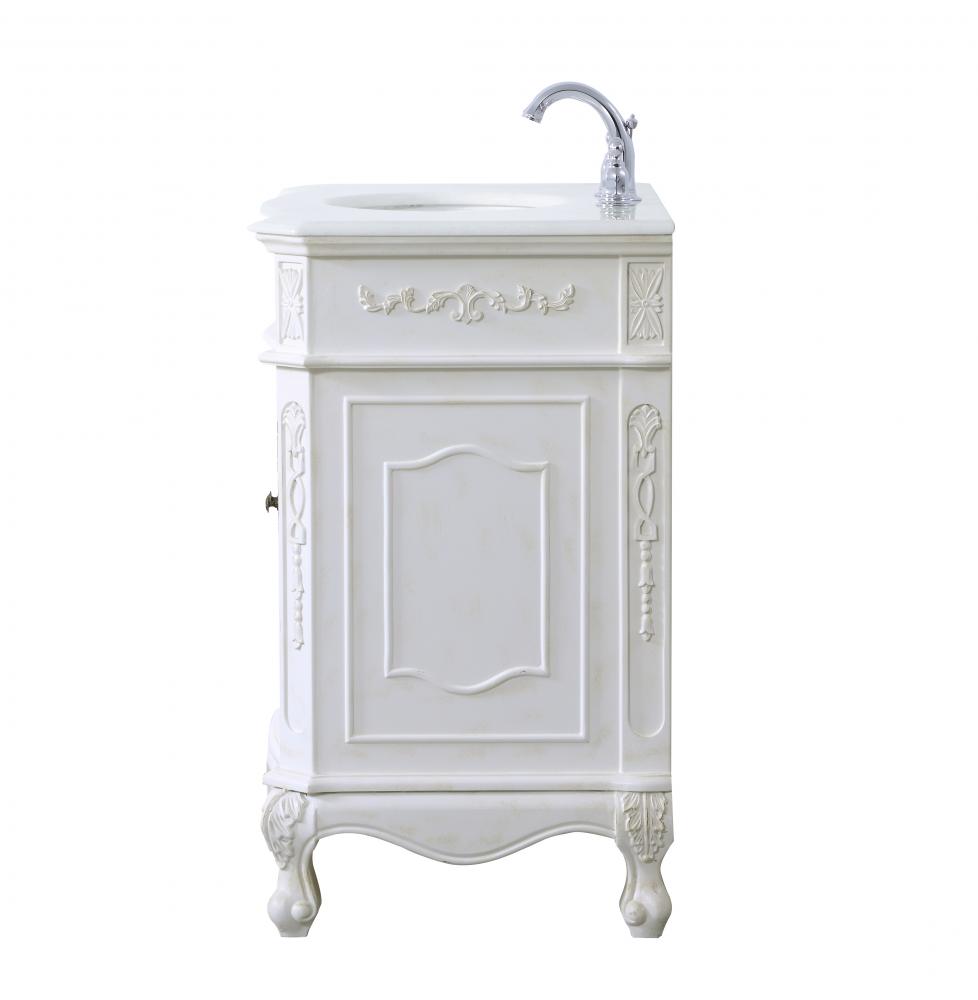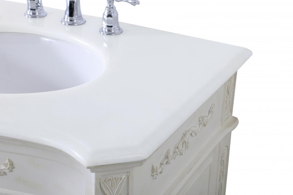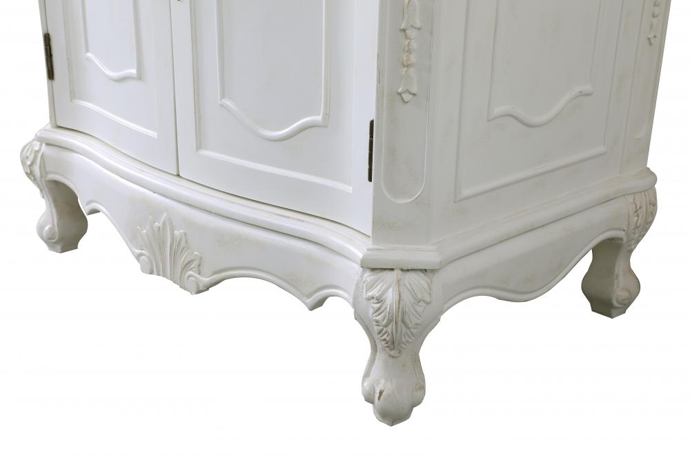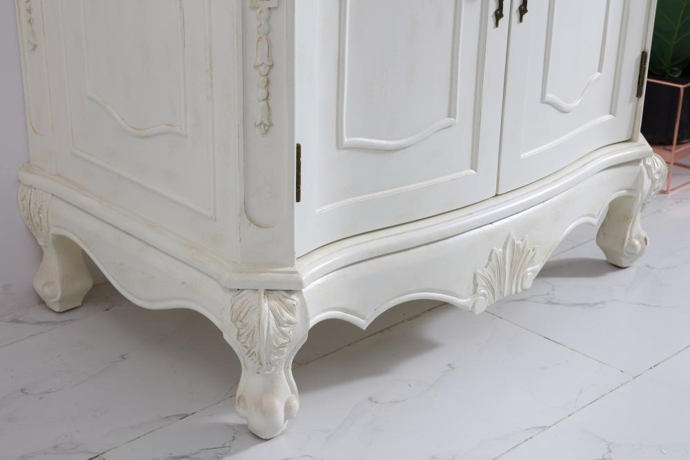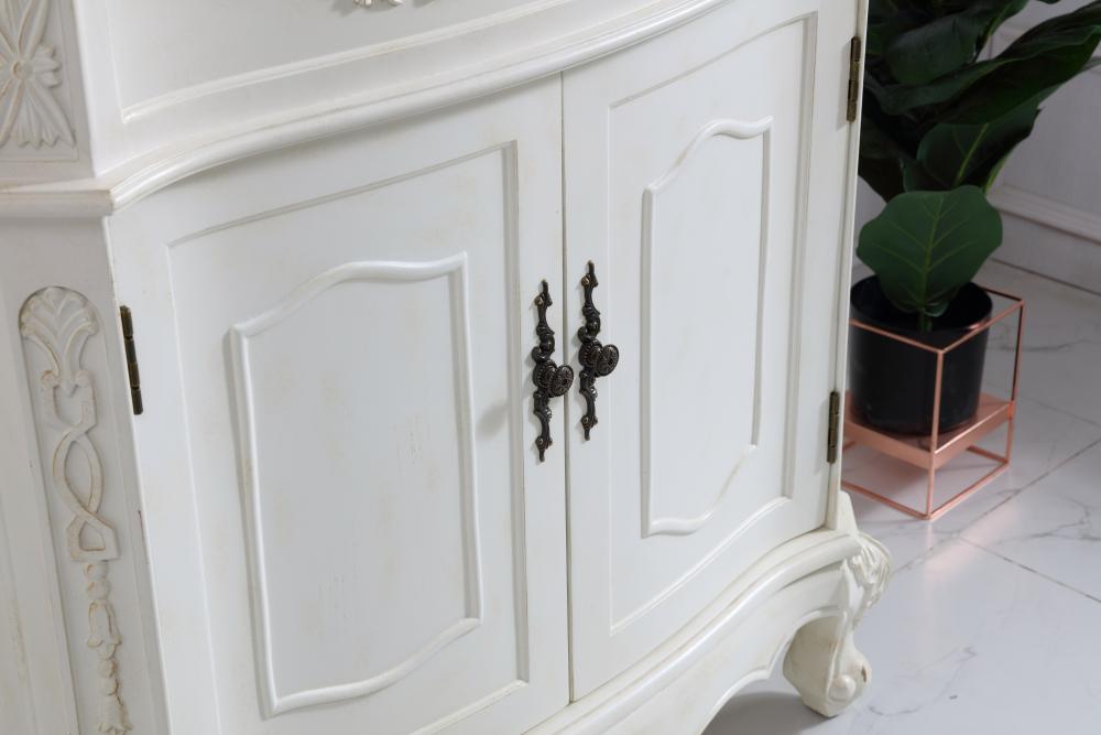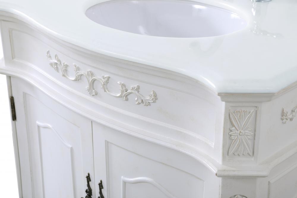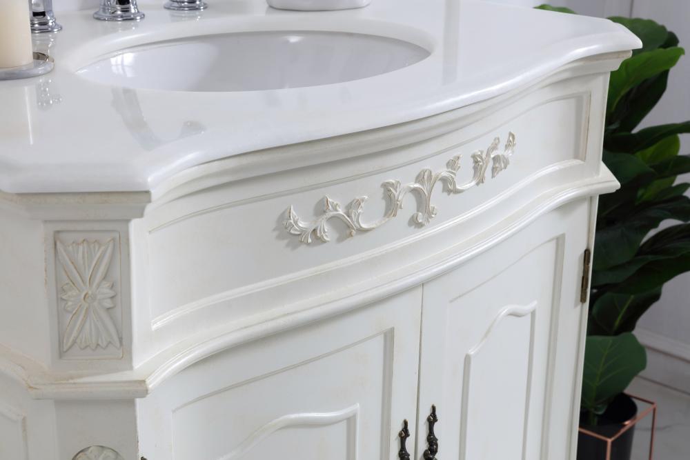 This superb balance of timeless tradition and opulent beauty in a engineered marble-topped vanity will certainly enhance the aesthetics of any home or office bathroom! Featuring an ivory white durable engineered marble countertop complimenting the hand painted cabinet with a delicate carved floral design, stands on stylishly carved solid wood French scroll feet. Don't let the design fool you, the engineered marble countertop and porcelain undermount sink allows for space to get ready, while the antique bronze hardware allows you to discover storage spaces with ease. You and your guests will marvel at this vanity that will both store away your bathroom essentials and enhance the aesthetics of your room.