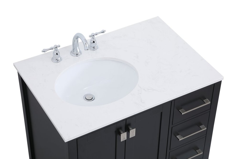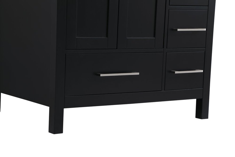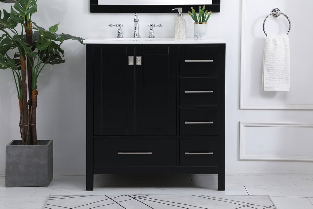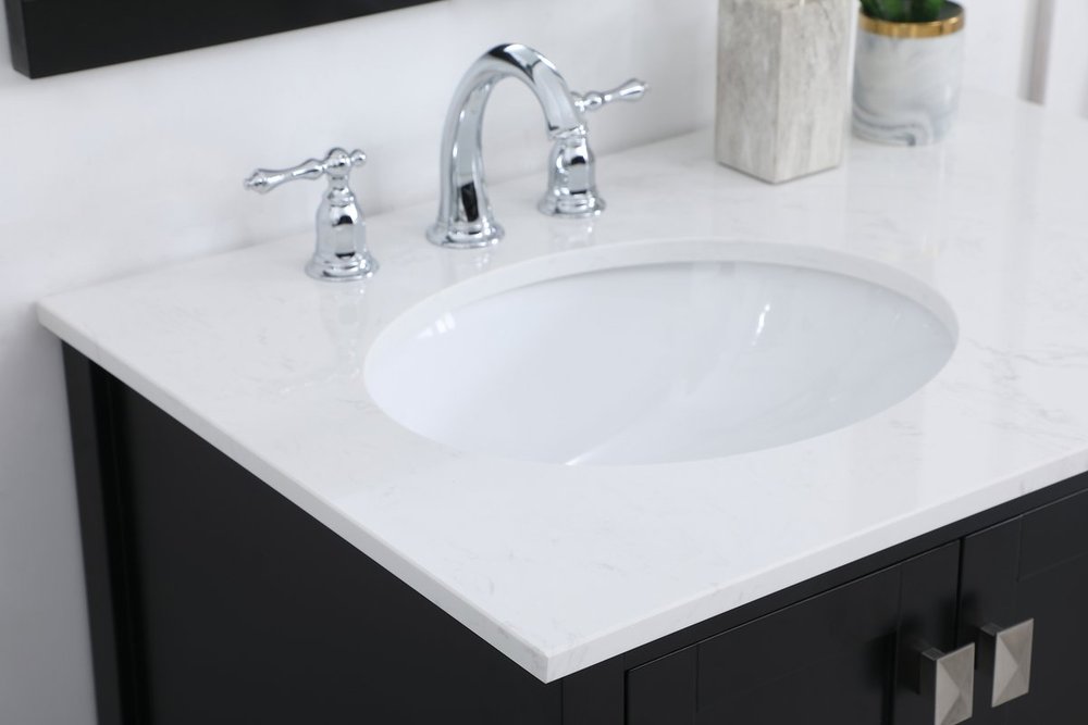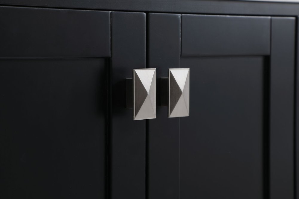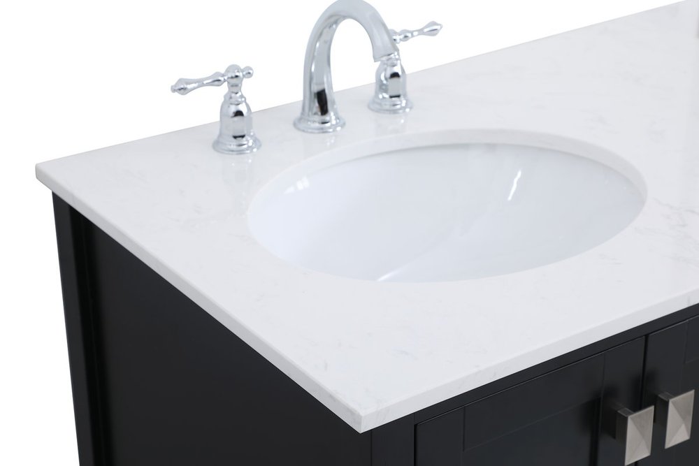 Never compromise beauty--the Irene collection stunning vanity in a black finish will add lovely sophistication and complement any bathroom or powder room, while utilizing its charm and function to provide you with ample storage spaces. Brushed nickel pulls gently adorn the minimalist cabinet doors and drawers at the base, allowing for you to store away your bathroom essentials. The calacatta engineered marble countertop, porcelain undermount sink, dignified subtle engravings on the side edges, and squared legs all come together to create contemporary beauty. Work with your space, and design a beautiful room, no matter the size.