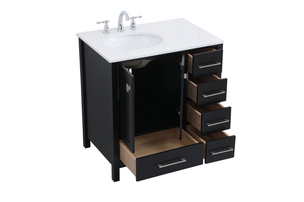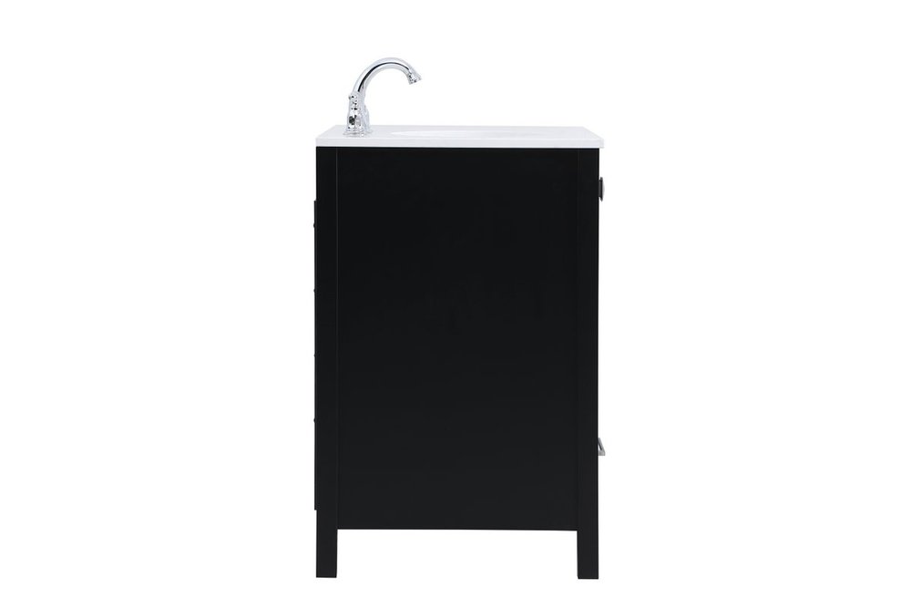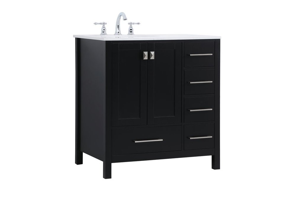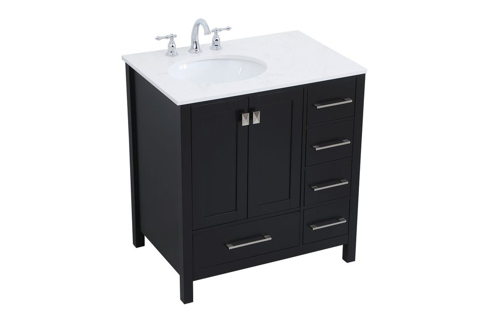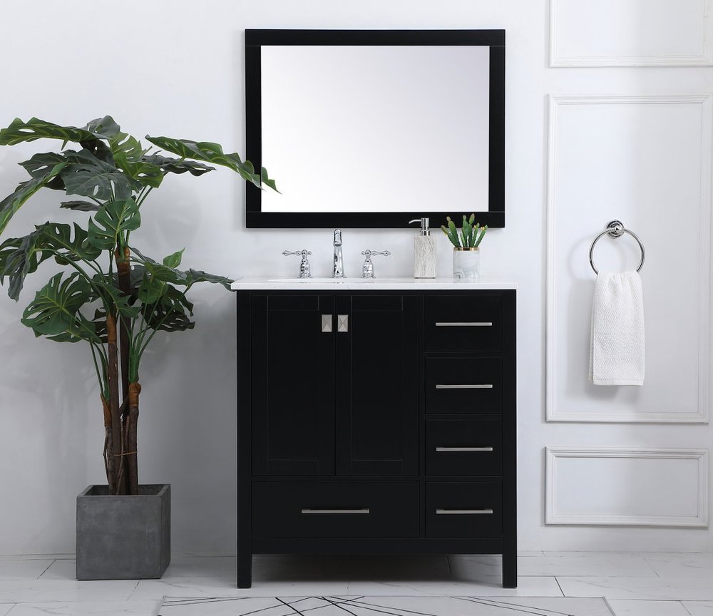 Never compromise beauty--the Irene collection stunning vanity in a black finish will add lovely sophistication and complement any bathroom or powder room, while utilizing its charm and function to provide you with ample storage spaces. Brushed nickel pulls gently adorn the minimalist cabinet doors and drawers at the base, allowing for you to store away your bathroom essentials. The calacatta engineered marble countertop, porcelain undermount sink, dignified subtle engravings on the side edges, and squared legs all come together to create contemporary beauty. Work with your space, and design a beautiful room, no matter the size.