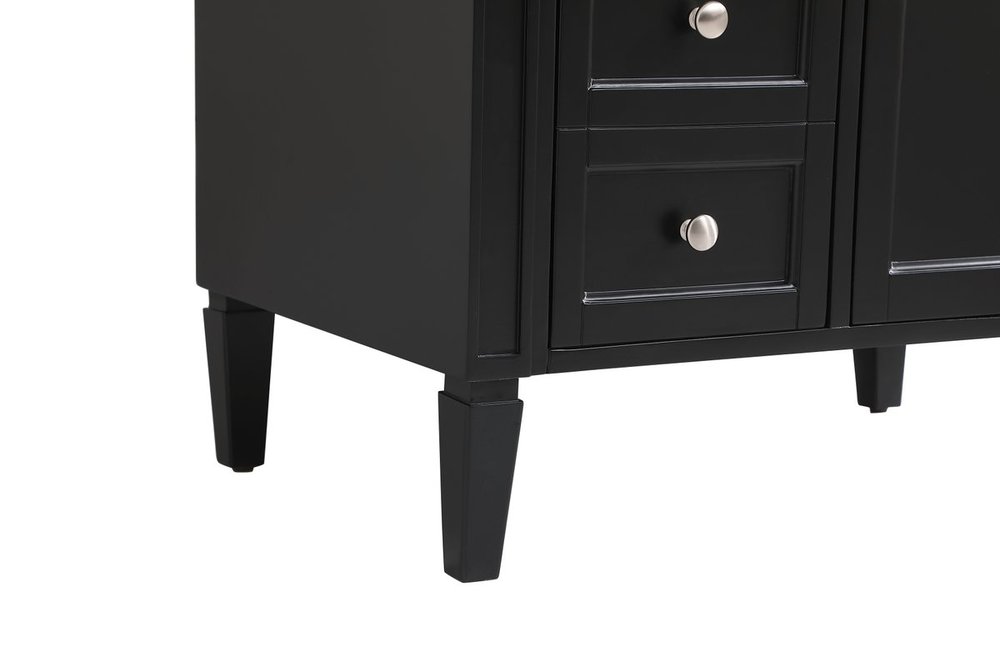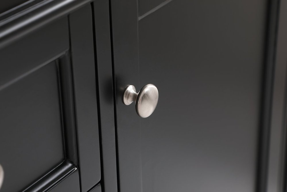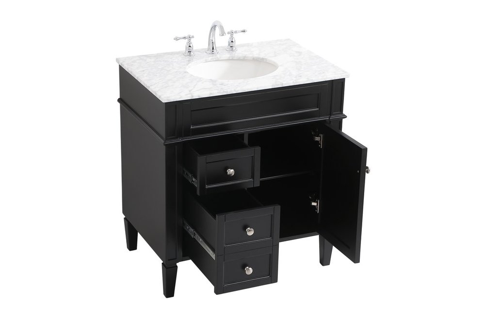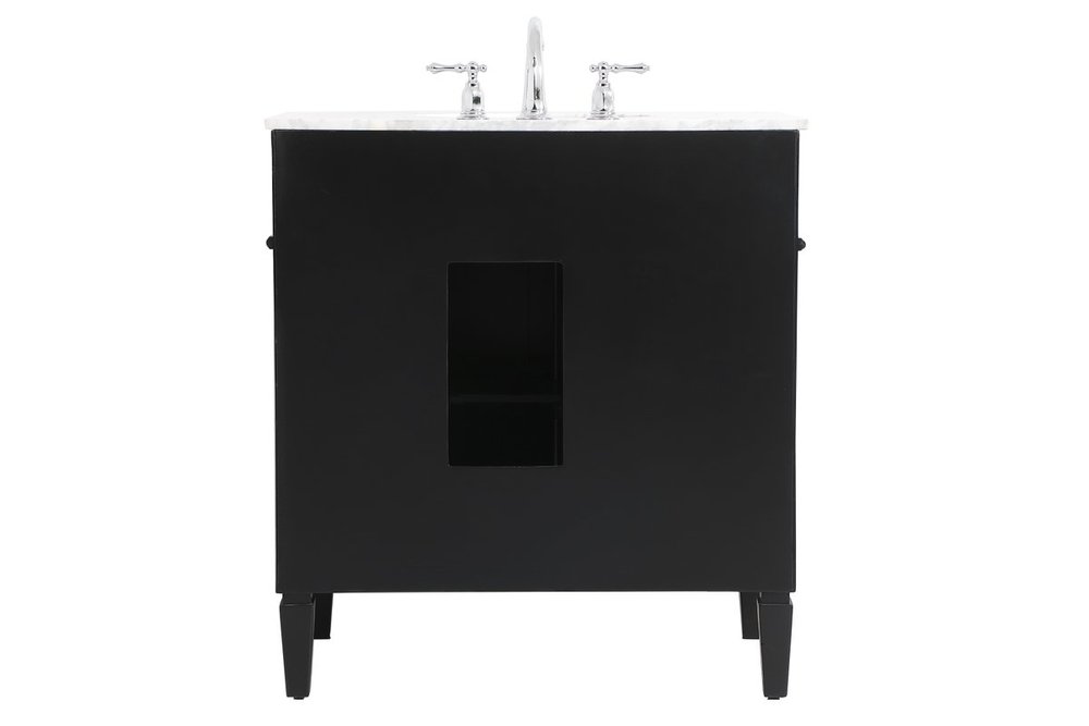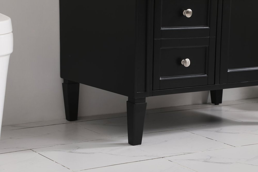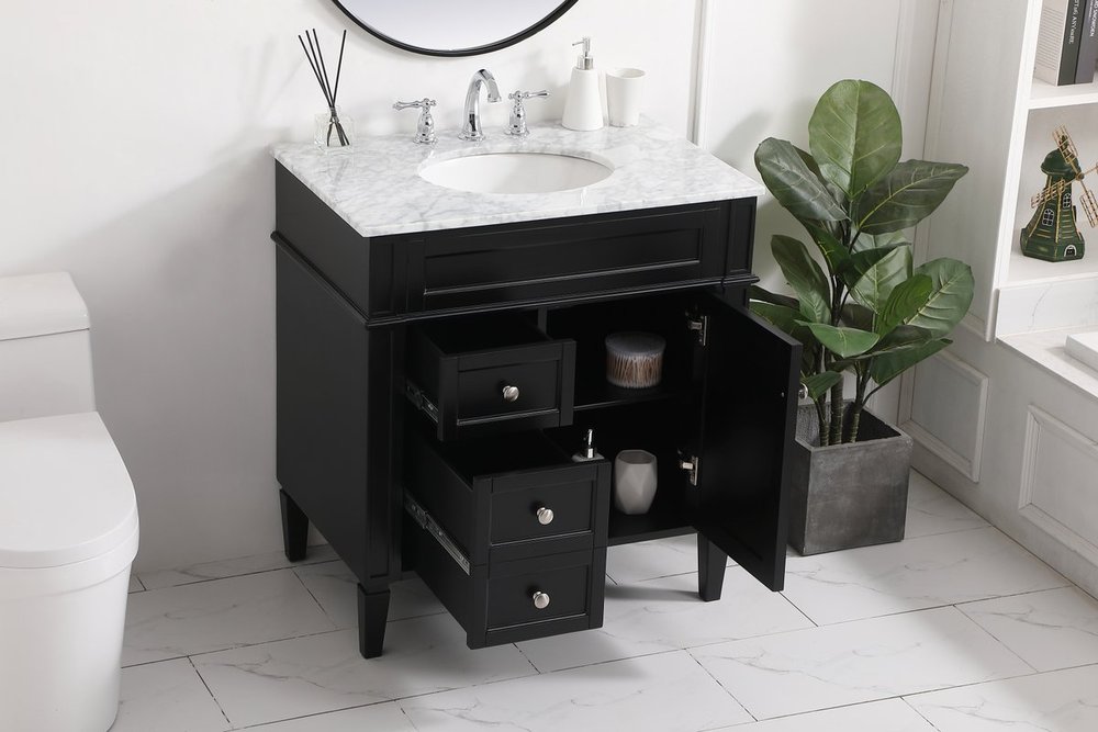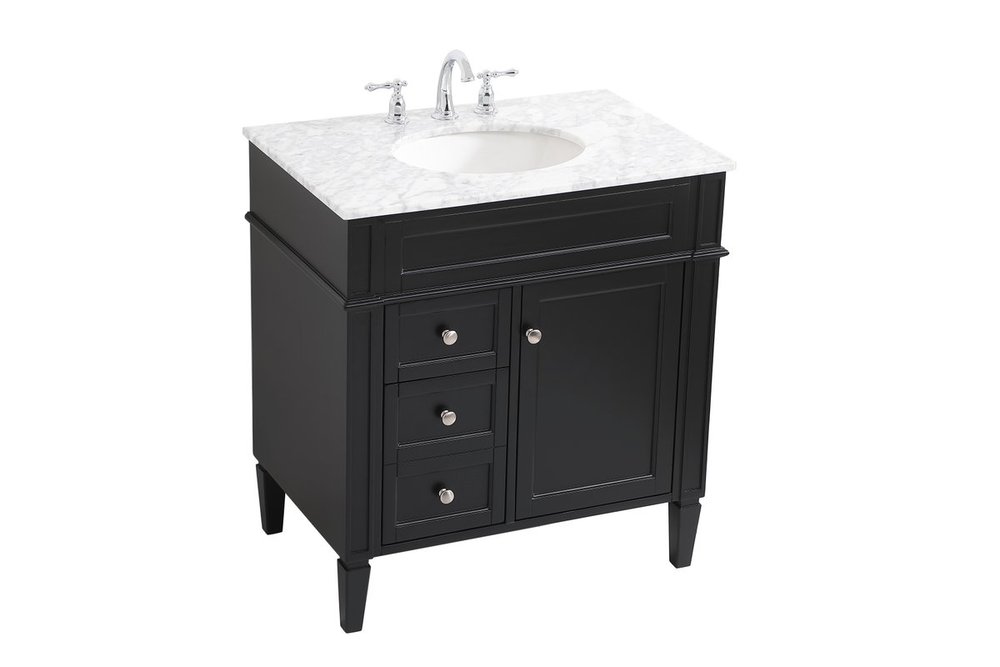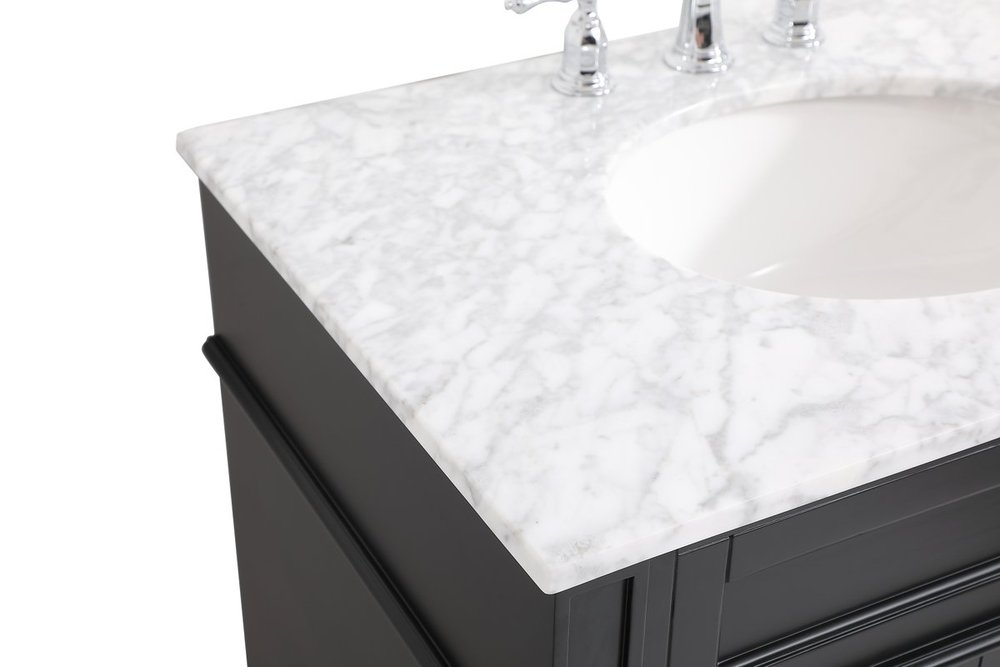Modern sophistication is defined within the black finish and brushed nickel knobs of this compact vanity. Its modest length makes it the perfect addition to any sized home, and saves space with its storage area hidden behind the double cabinet doors. Topped with a Carrara white marble counter top and a porcelain sink, this design will add everlasting class to your bathroom and powder room.