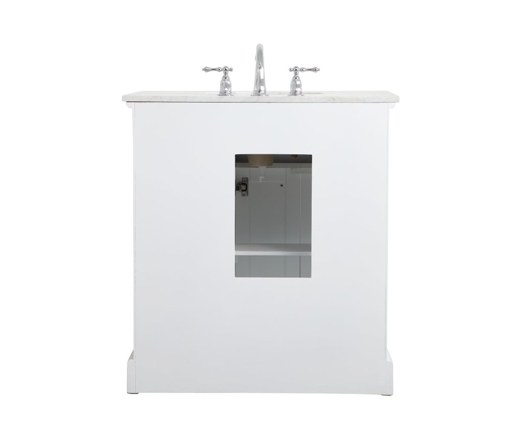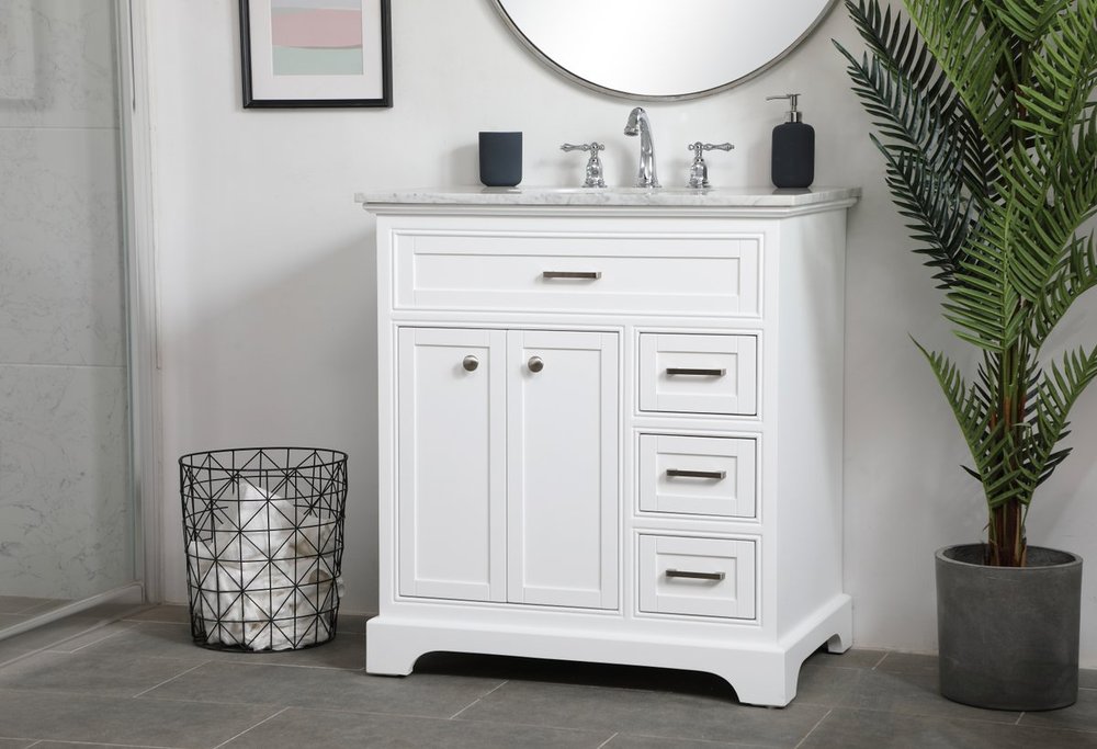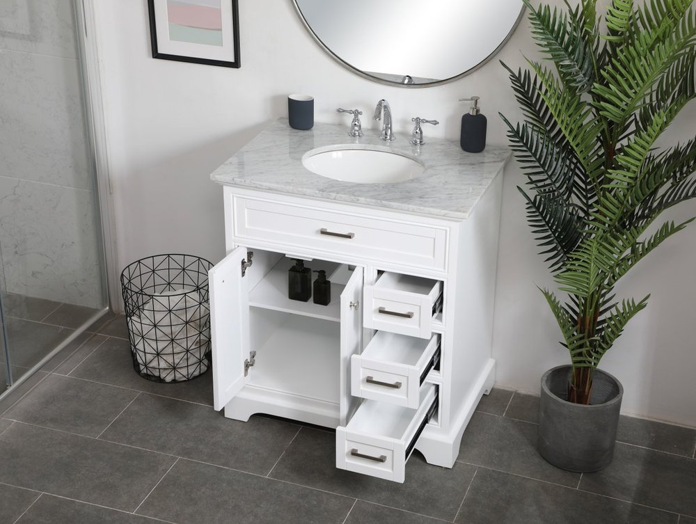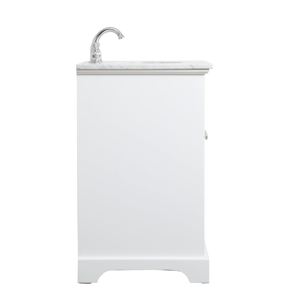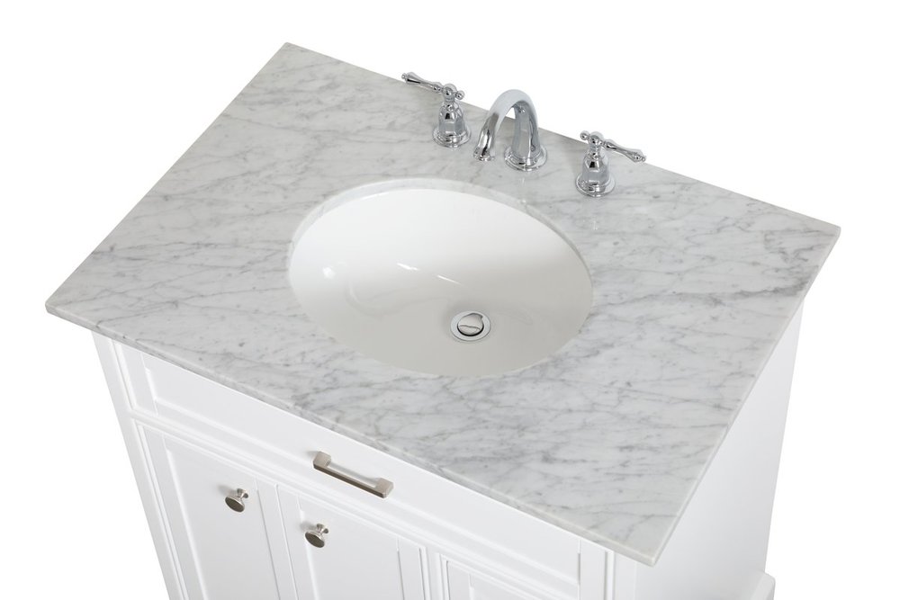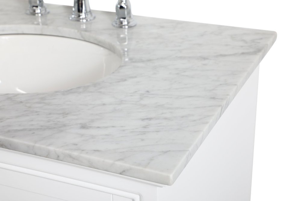 Clean lines and classic form can truly add a fresh look to your bathroom or powder room. This white finish vanity, complemented by brush steel finish hardware, will surely charm you with its confident style and subtle charisma. Double cabinet doors and 3 side drawers can store all of your bathroom toiletries, from extra towels to make up essentials. As if icing on the cake, this vanity is crowned with Carrara white marble and includes a porcelain undermount sink--adding both function and form that will truly amaze.