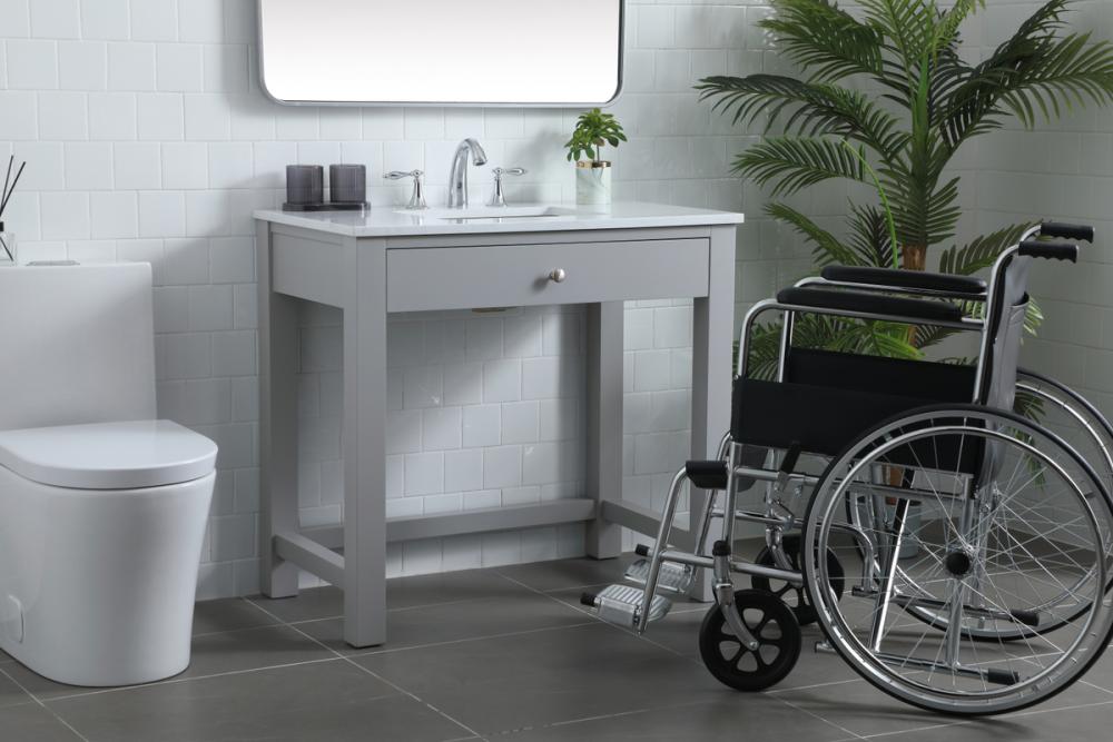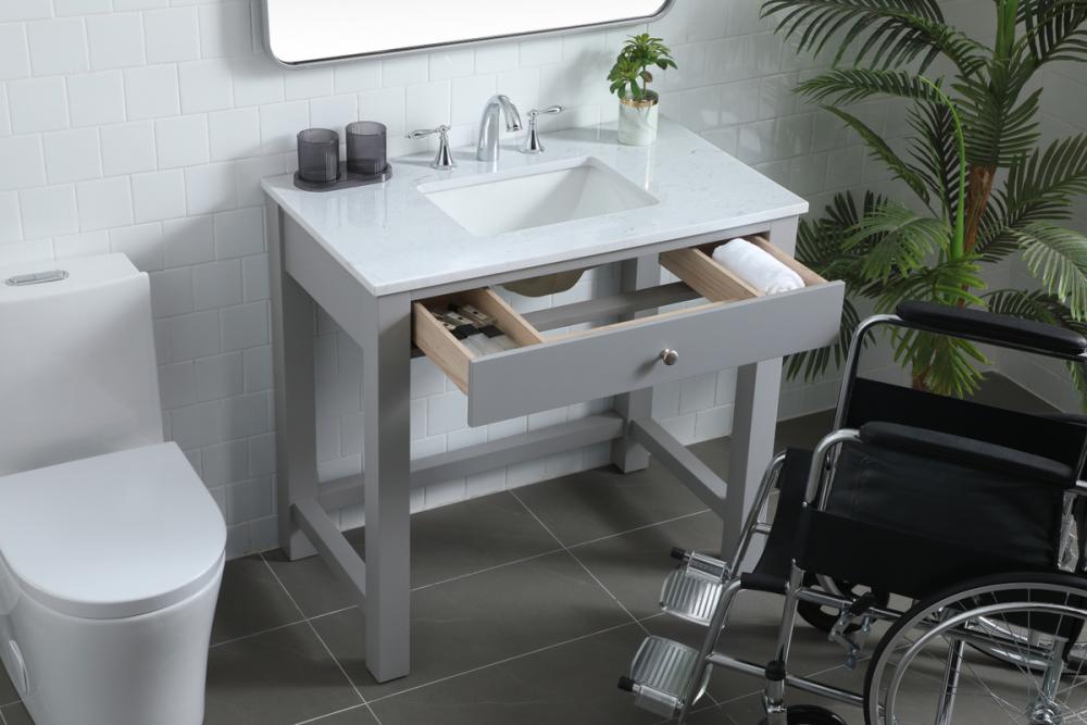 Step into a world of accessibility and sophistication with our Handicap ADA Compliant Bathroom Vanity. Carefully crafted to meet ADA standards, this exceptional piece goes beyond functionality to redefine inclusivity in your bathroom space. The ADA compliant sink cabinet opens doors to unparalleled wheelchair access, ensuring that everyone can navigate their daily routines with ease. The undermount porcelain sink, coupled with a durable Calacatta look engineered marble stone top, adds a touch of timeless luxury to your bathroom while standing up to the demands of everyday use. Versatility meets personalization with predrilled countertops featuring three holes, ready to accommodate a variety of faucets (faucets not included). The thoughtful design extends to the soft closing glides on the drawers, creating a serene and noise-free environment in your bathroom sanctuary.Say goodbye to the complexities of assembly – our vanity ships fully assembled and ready to use, offering you convenience from the moment it arrives. The generous 27-inch knee clearance from the floor ensures optimal comfort and accessibility, catering to the unique needs of individuals using wheelchairs. Every detail has been considered, including a discreetly placed overflow hole in the porcelain sink. This thoughtful touch not only enhances the aesthetic appeal but also adds a practical element, ensuring a seamless and worry-free experience.Elevate your bathroom to new heights with our Handicap ADA Compliant Bathroom Vanity, where accessibility meets elegance, and every feature is designed to enhance your daily rituals. Redefine your space with a commitment to inclusivity without compromising on style.