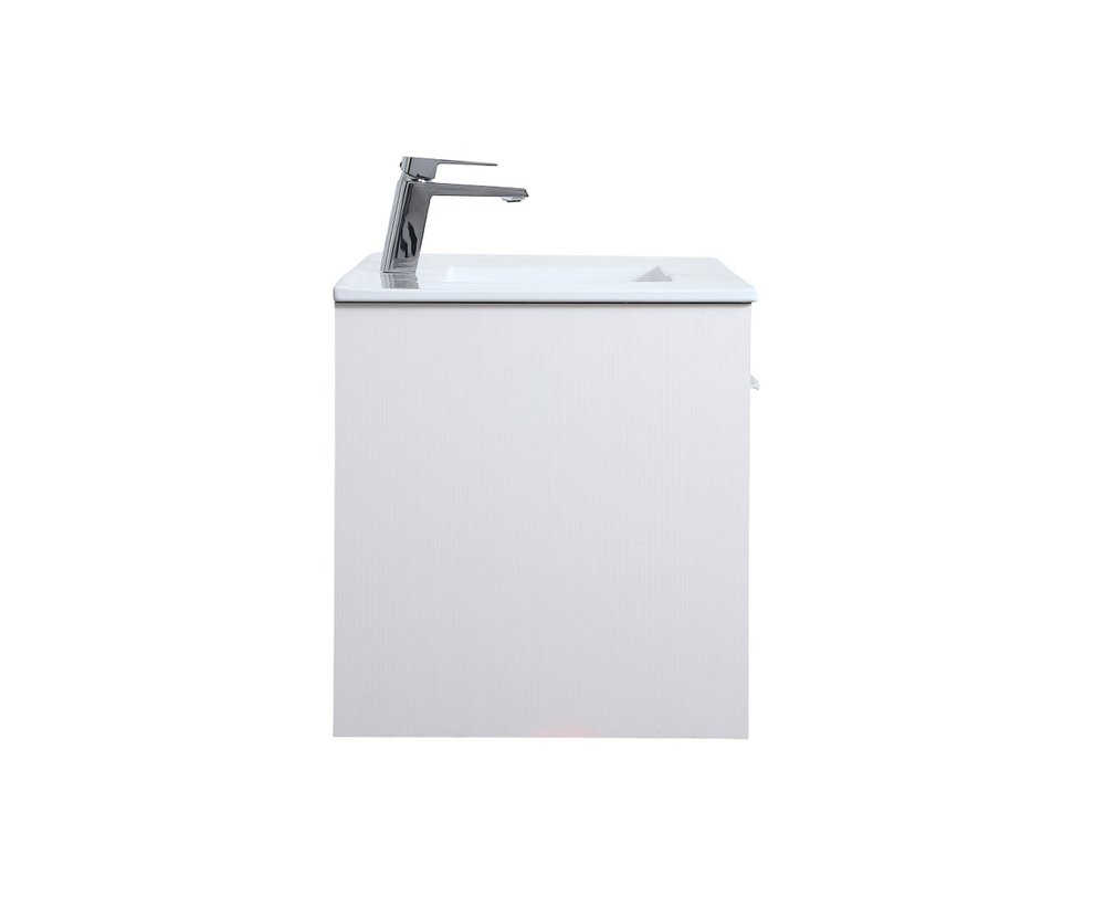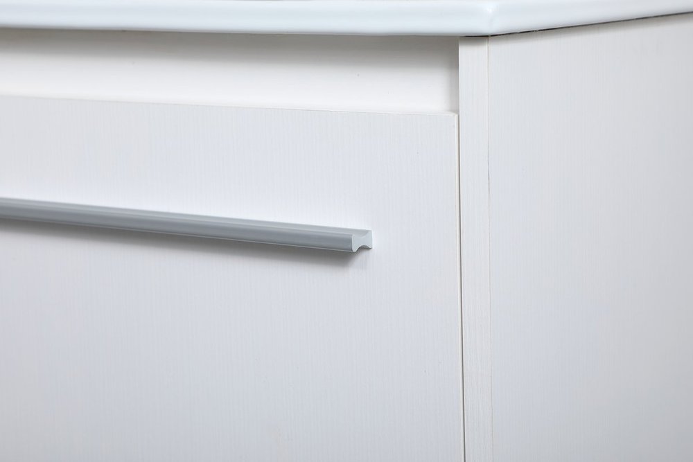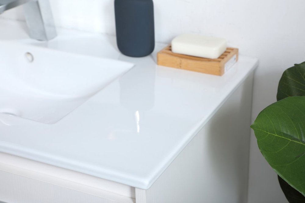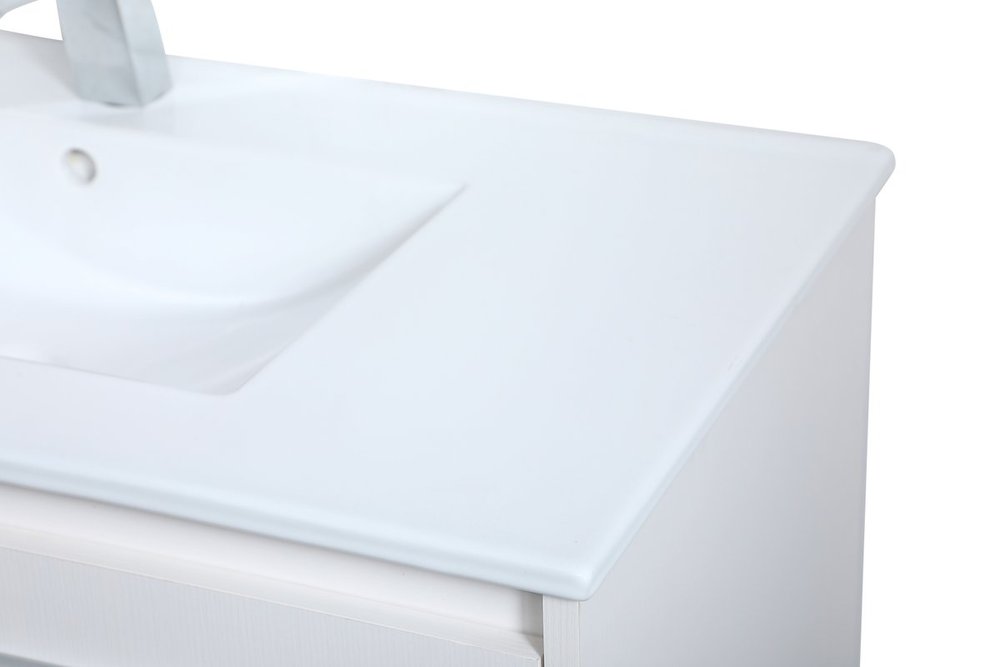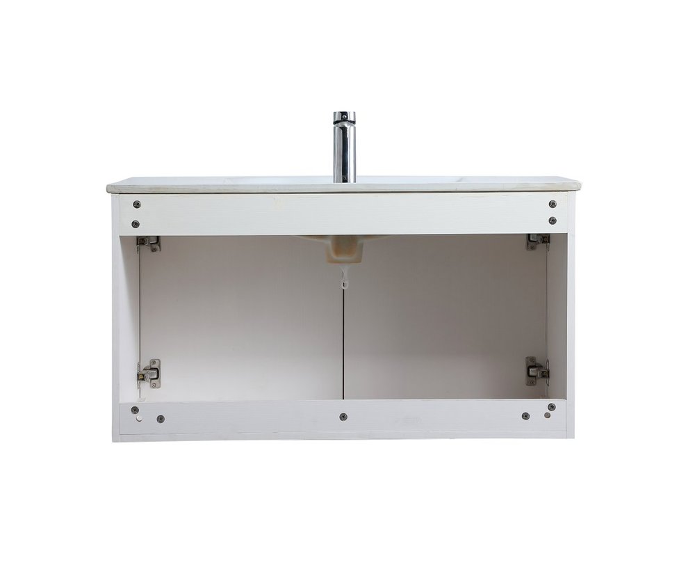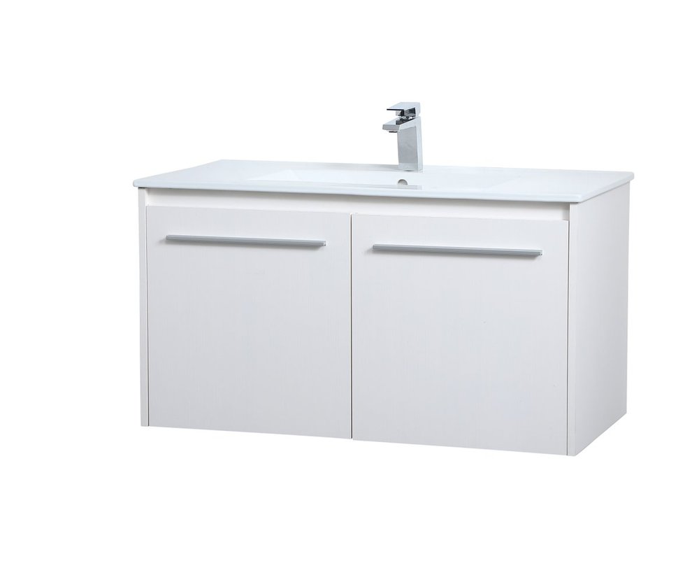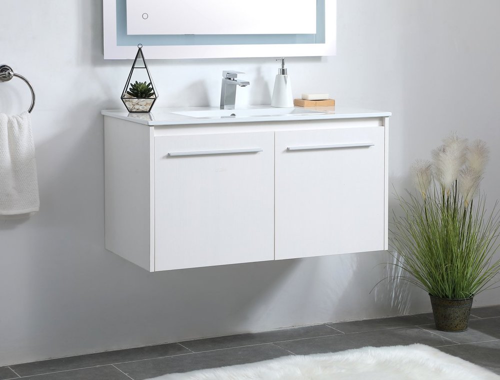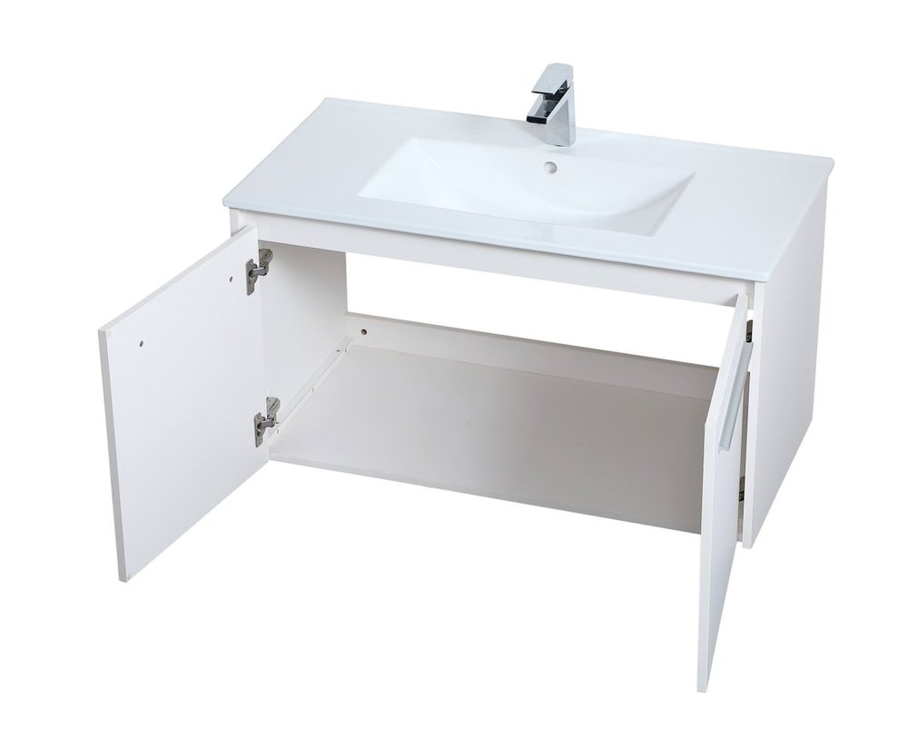 The contemporary simplicity of this 36" floating vanity in a white finish will help open the space and add stunning modern flair to your bathroom or powder room. The open space below makes it easy to show off your tiles and to clean the floor with ease--it's also the perfect place for a hamper. Double doors open to reveal plentiful of storage pace to store all of your bathroom miscellany. The clean lines that permeate through the design will surely create a fresh look in your home.