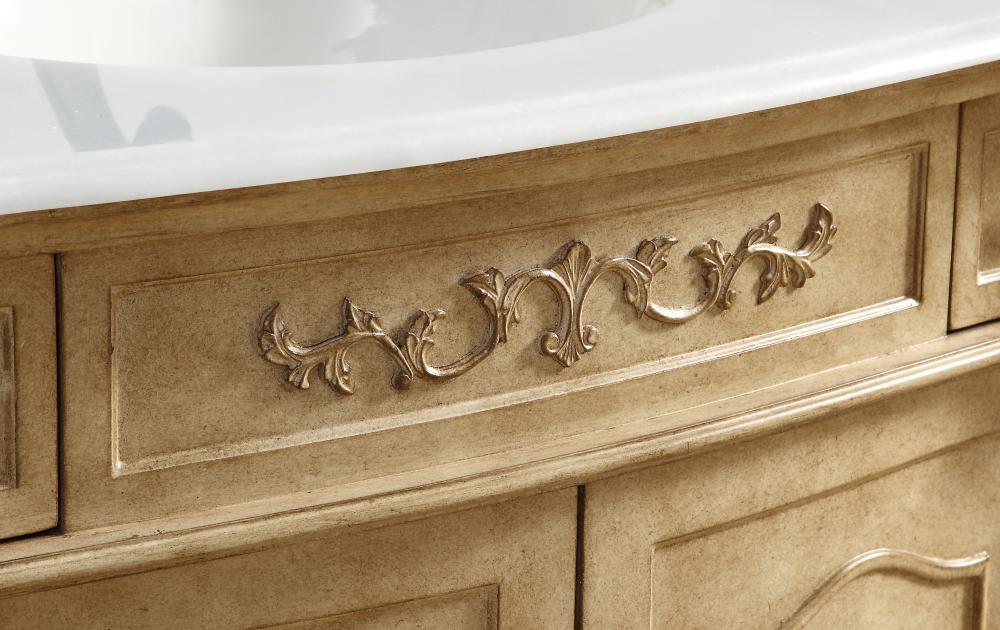 This superb balance of timeless tradition and opulent beauty in a engineered marble-topped vanity will certainly enhance the aesthetics of any home or office bathroom! Featuring an ivory white durable engineered marble countertop complimenting the hand painted cabinet with a delicate carved floral design, stands on stylishly carved solid wood French scroll feet. Don't let the design fool you, the engineered marble countertop and porcelain undermount sink allows for space to get ready, while the antique bronze hardware allows you to discover storage spaces with ease. You and your guests will marvel at this vanity that will both store away your bathroom essentials and enhance the aesthetics of your room.