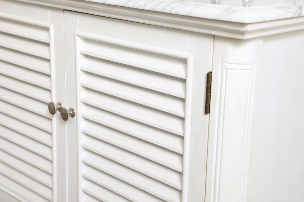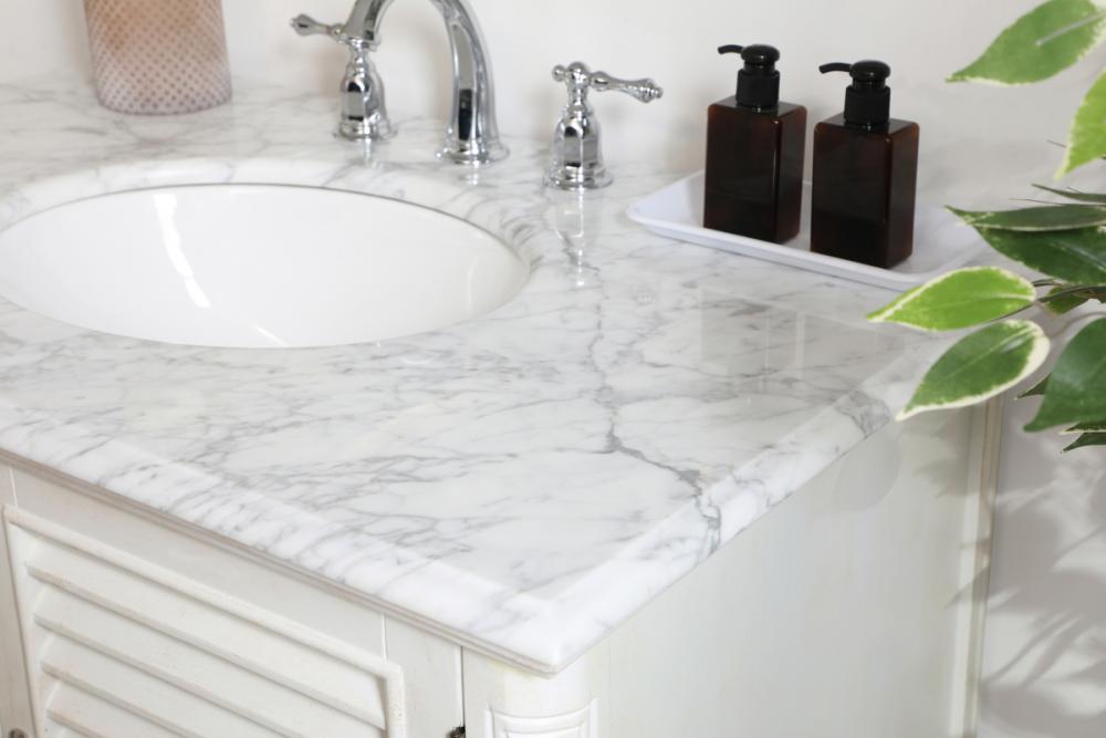 Distressed antique white finish with a luxurious carrara white marble countertop