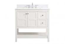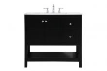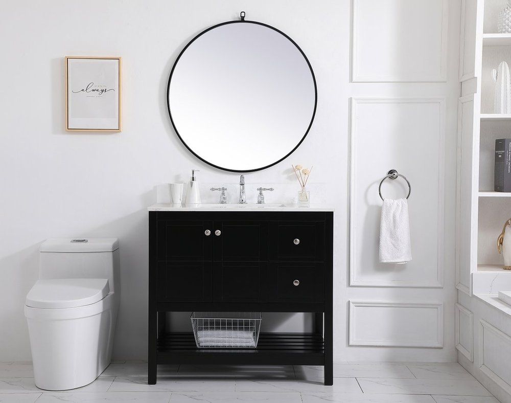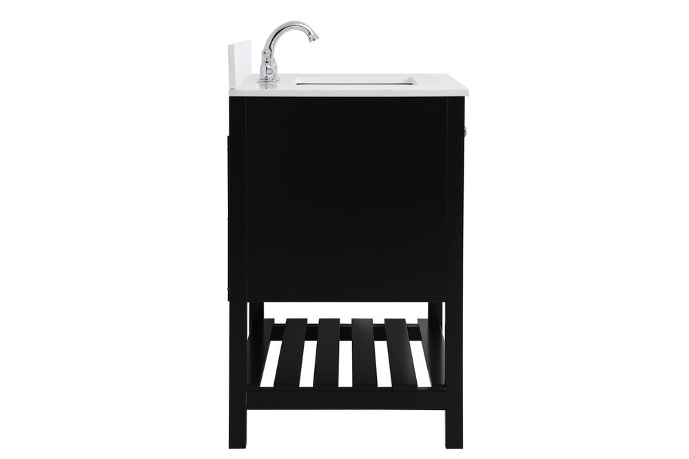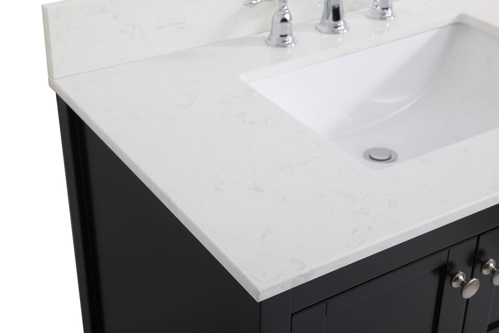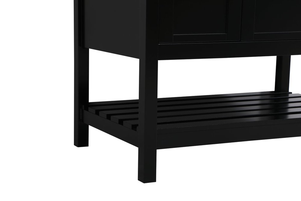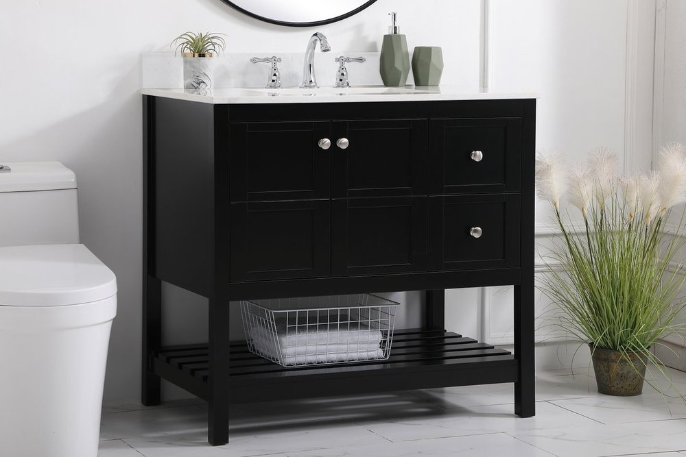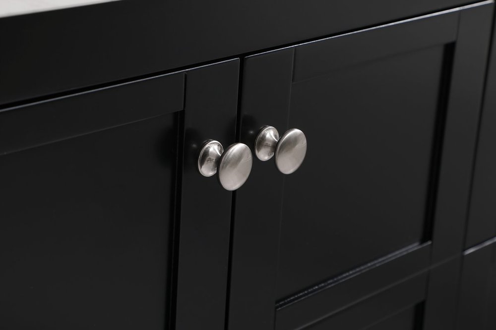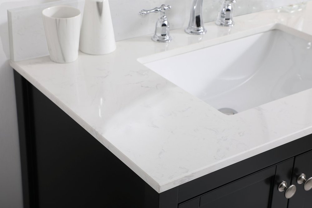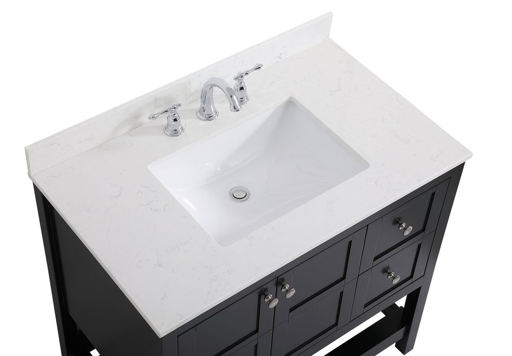 The subtle beauty of the Theo collection 36" vanity in a black finish exudes comfortable luxury. Its modern, yet traditional beauty will surely dress up your bathroom or powder room without any fuss. The white stone countertop and porcelain undermount sink shows quiet opulence, and the legs support upright without fail. Brushed Nickel hardware complements the trendy black finish, with pulls adorning the two cabinet doors and two drawers, showcasing ample storage space within. Slated shelf allows for additional space to organize your towels. Whether this vanity is in your bathroom or for guests, its presence will surely elevate the aesthetics of your room. Comes with a matching backsplash to complete the look and protects your wall.