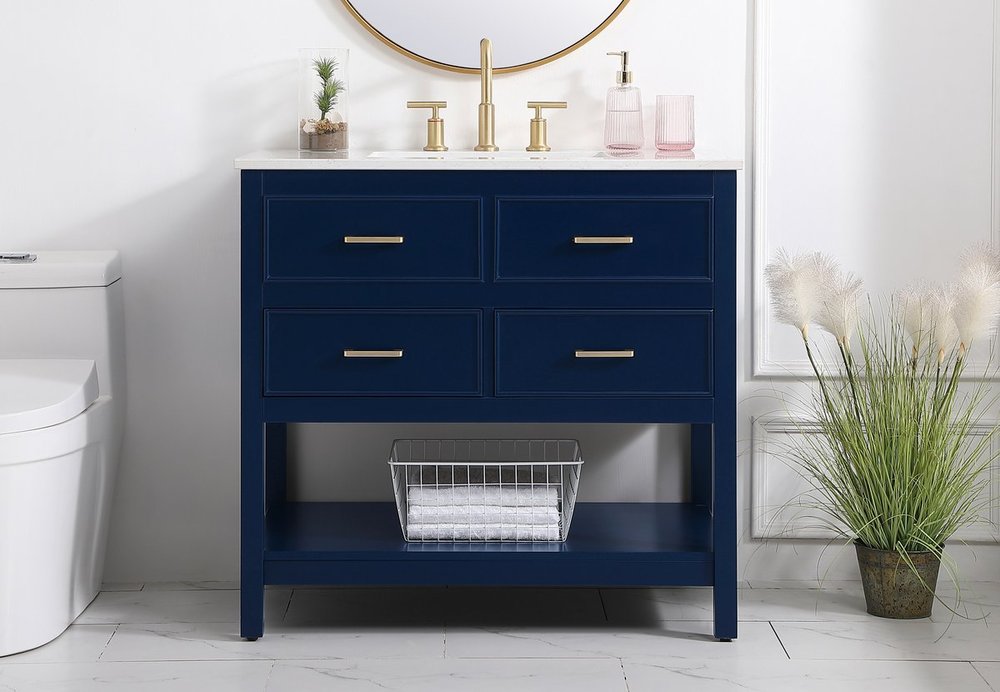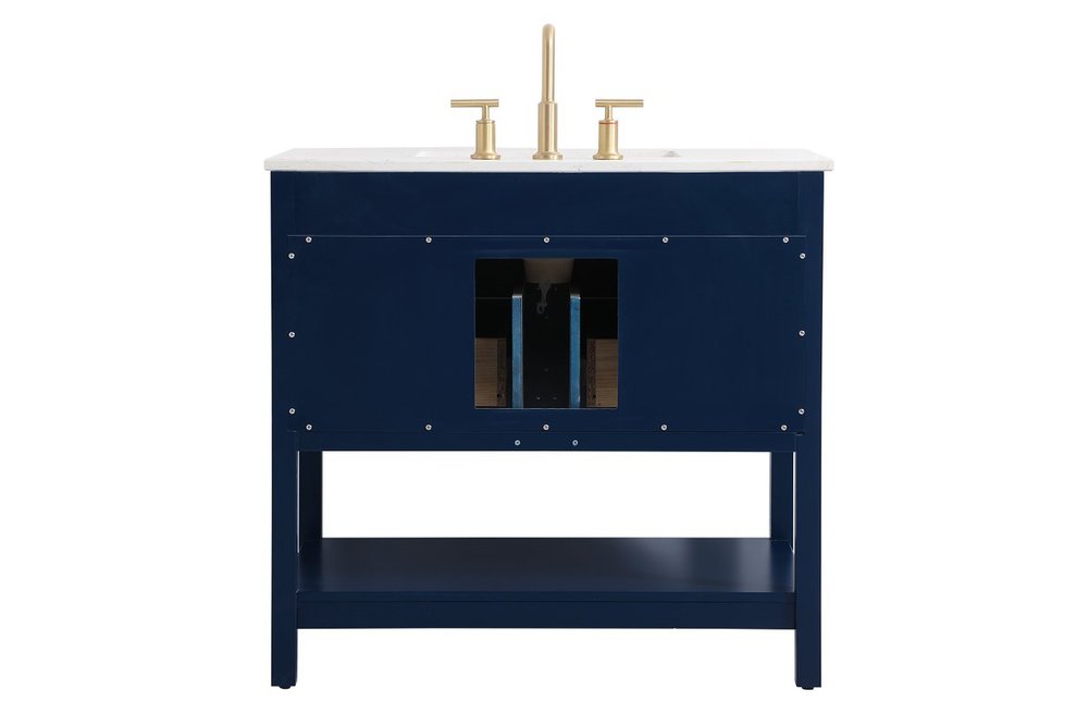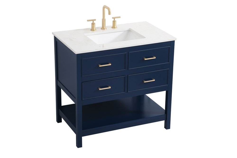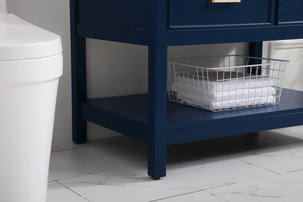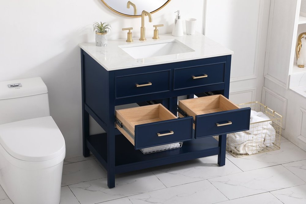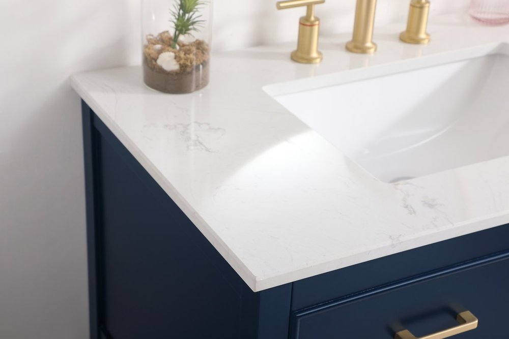 Make the most of your space with this traditional style bathroom vanity. Complements well with many aesthetics with its beautiful finish, calacatta engineered marble countertop, and the contemporary slender handle bar that sits on two upper false drawer and two lower u-shaped drawer, allowing you to store an assortment of bathroom essentials. The lower shelf makes it the perfect space to hold new towels for your guests. This compact vanity ensures both form and function in your bathroom or powder room for you and your guests.