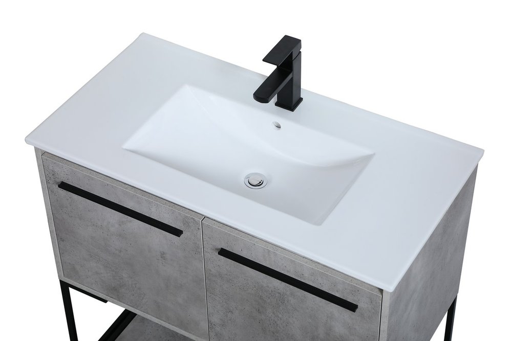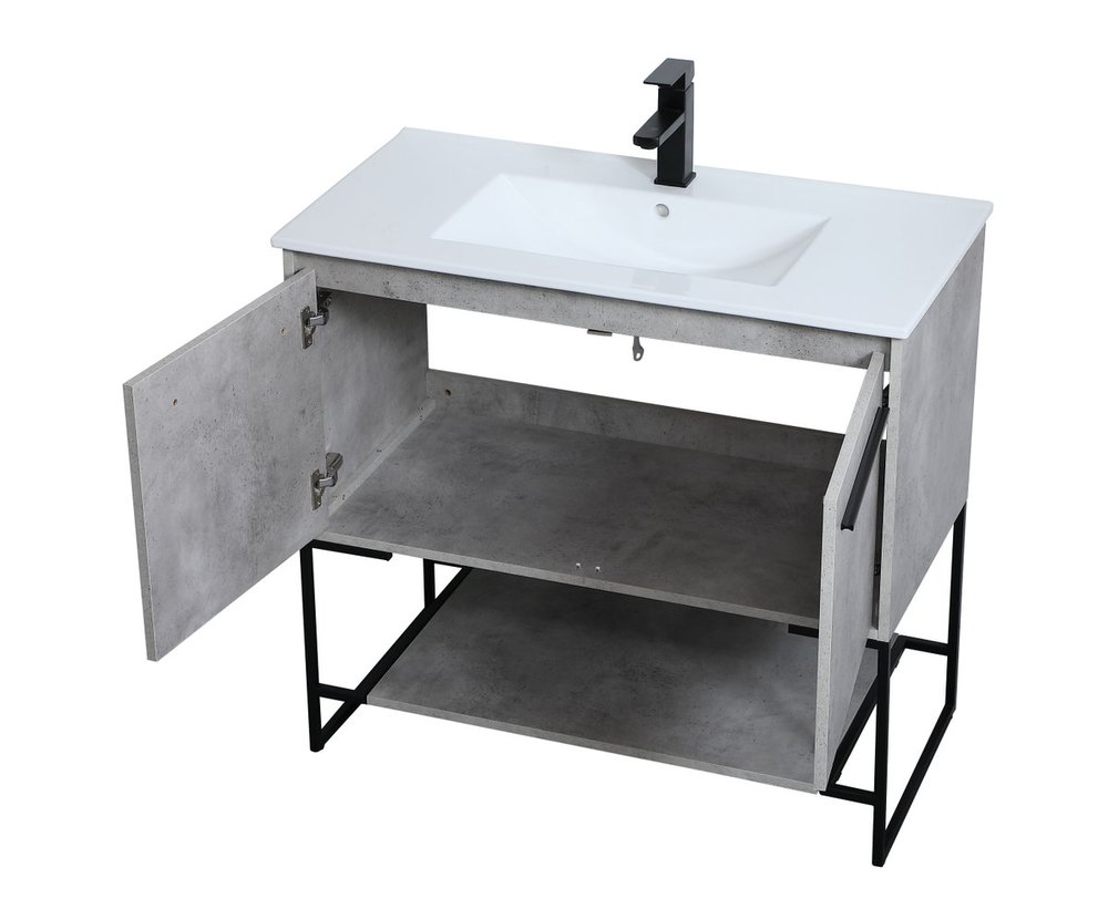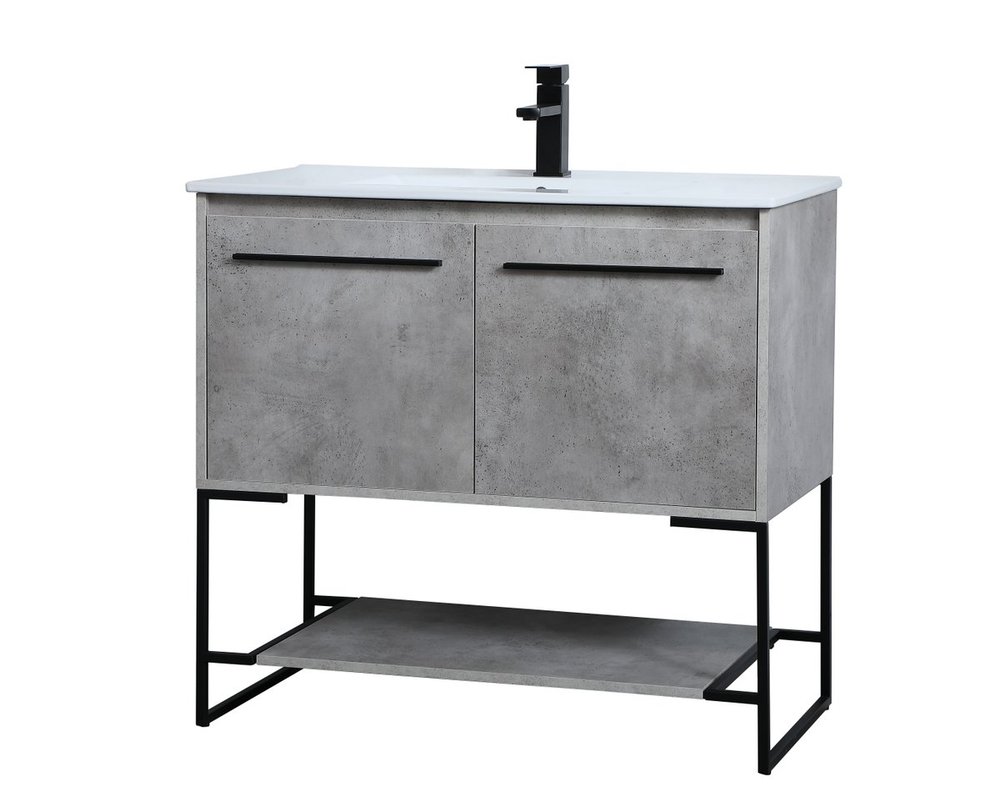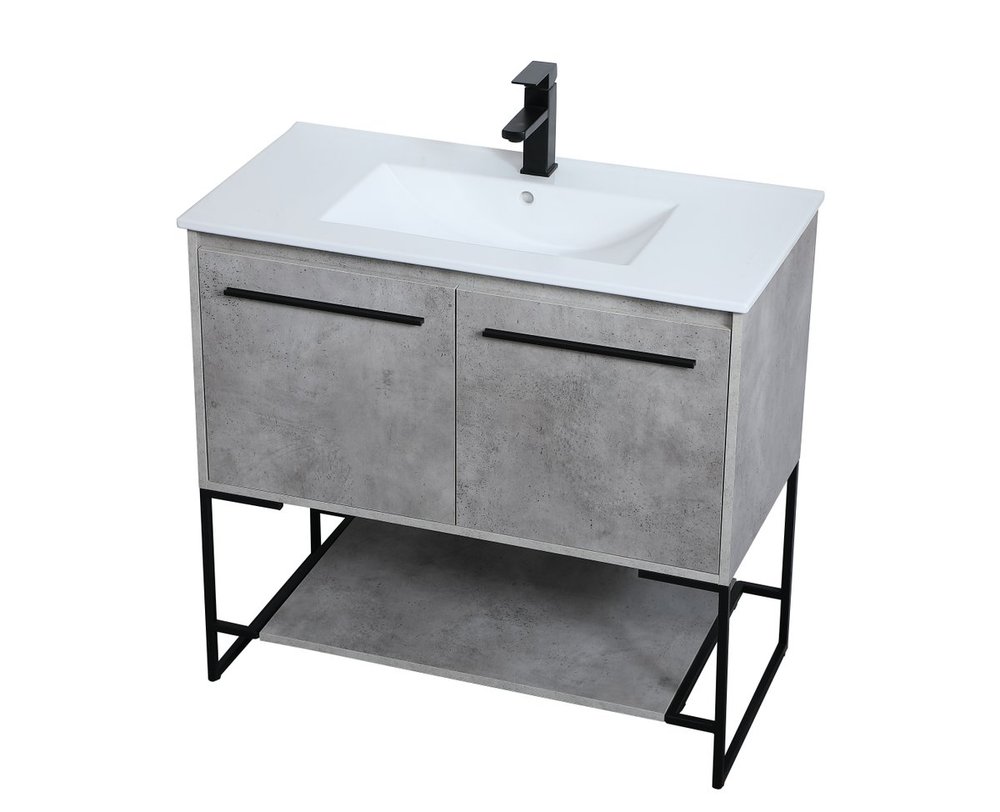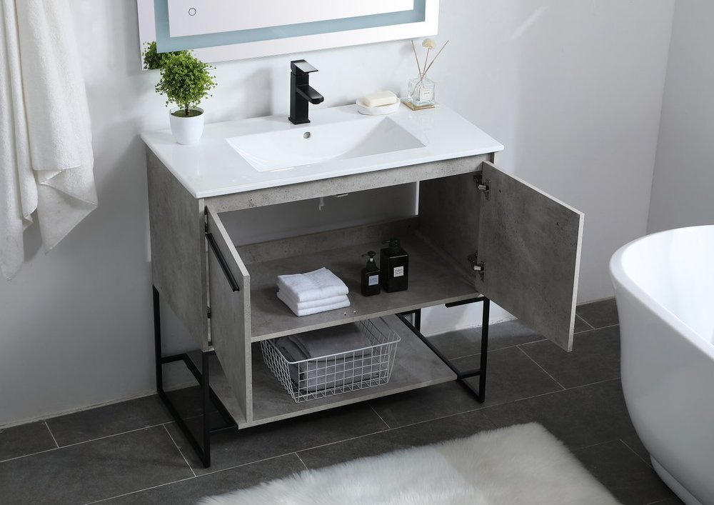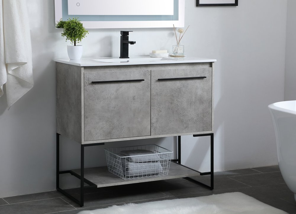 Live in modern comfort with this 36" concrete grey finish vanity. Dressed in a concrete grey and sleek black metal hardware, its contemporary style will have your bathroom or powder room elevated in industrial sophistication. The open shelf at the base and two doors reveal ample storage space for your bathroom essentials and miscellany. Clean lines create its own visual interest, adding trendy looks to your already chic room.