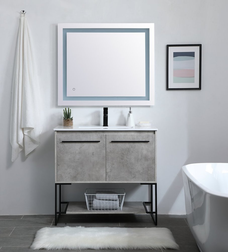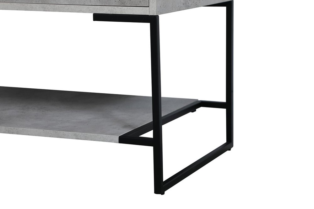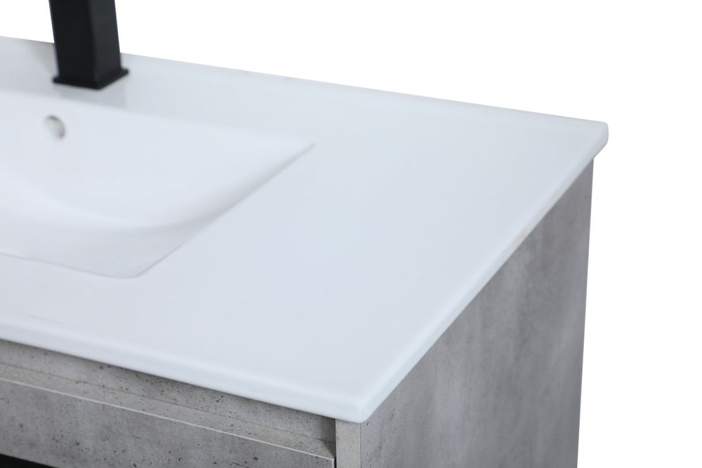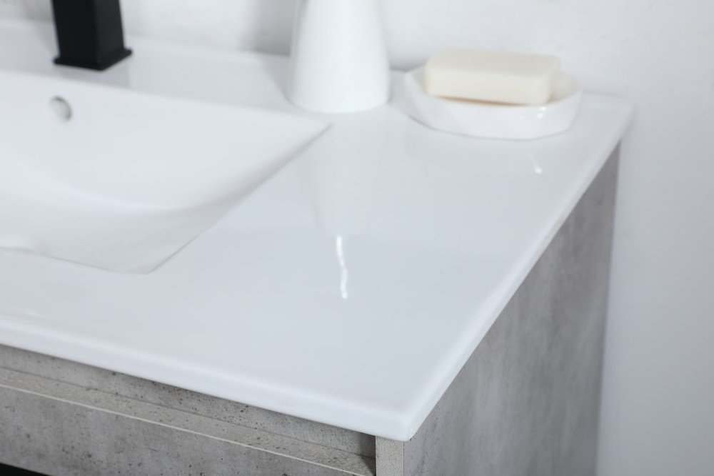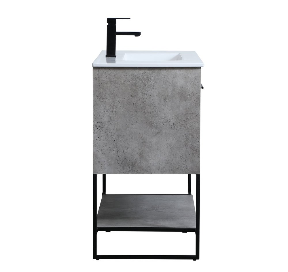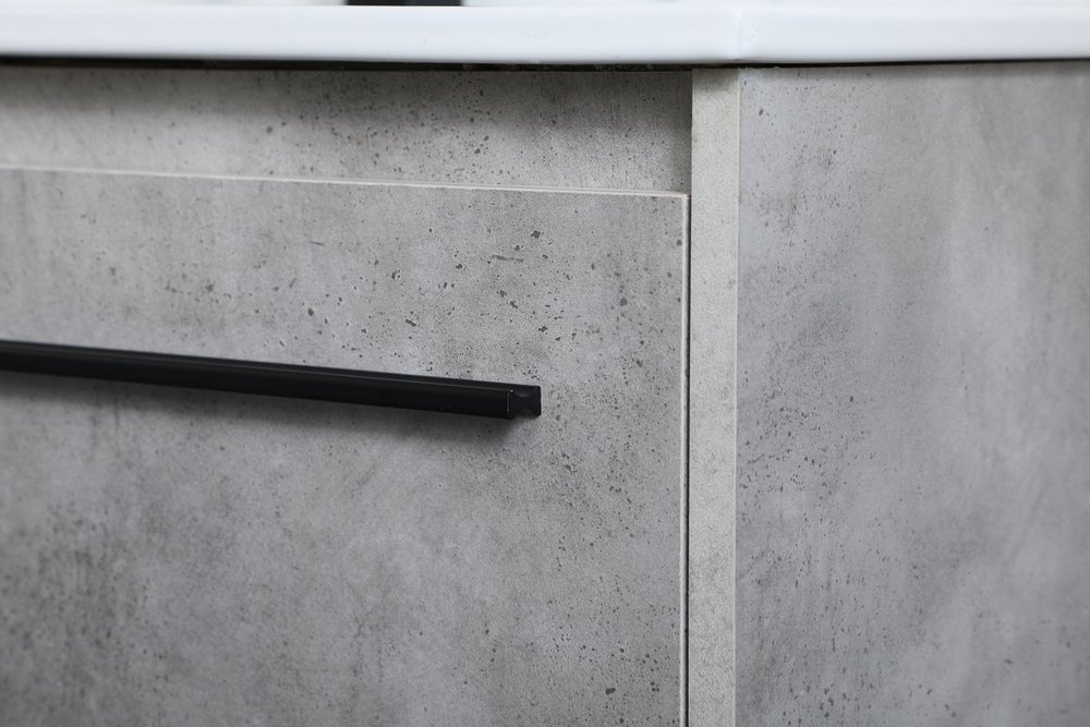 Live in modern comfort with this 36" concrete grey finish vanity. Dressed in a concrete grey and sleek black metal hardware, its contemporary style will have your bathroom or powder room elevated in industrial sophistication. The open shelf at the base and two doors reveal ample storage space for your bathroom essentials and miscellany. Clean lines create its own visual interest, adding trendy looks to your already chic room.