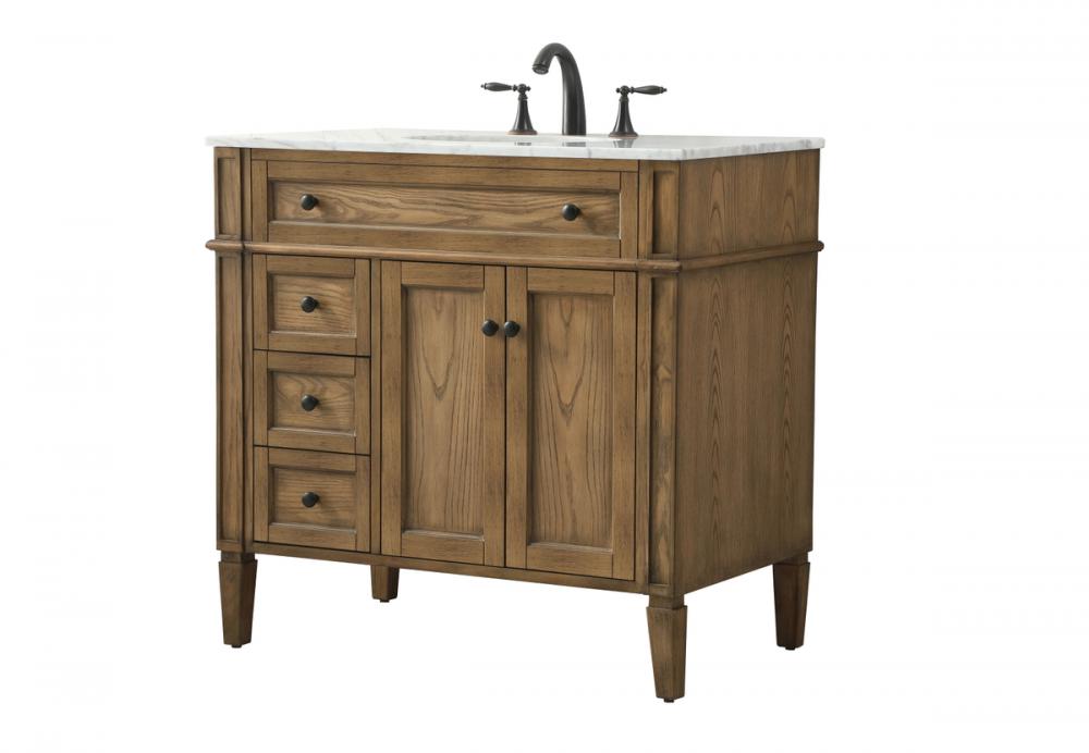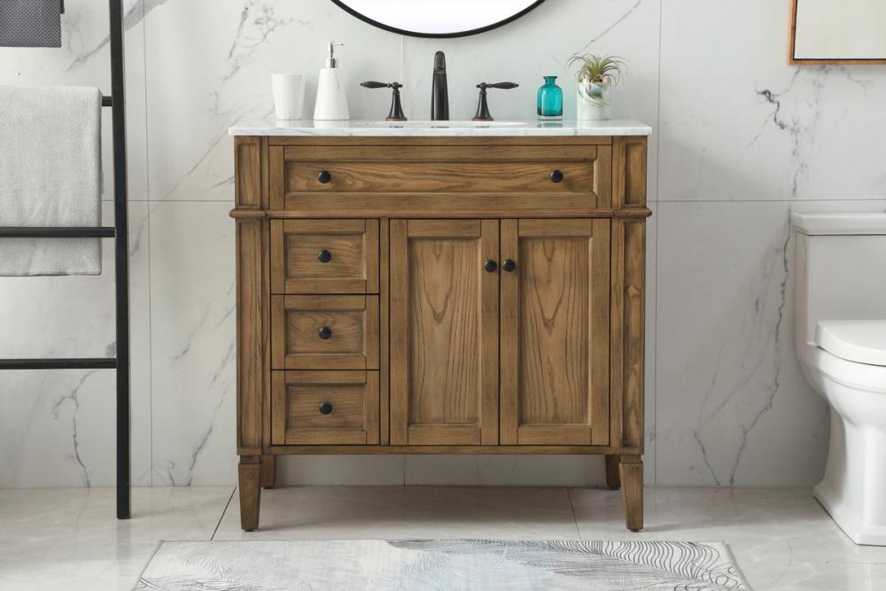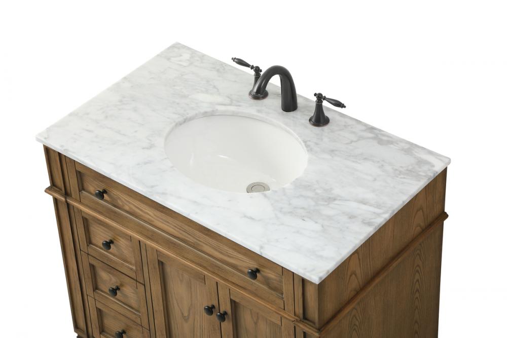 Comes with an undermount porcelain sink and a carrara white marble countertop