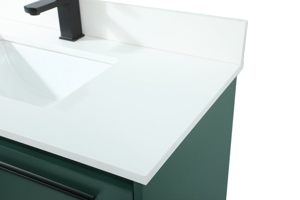 Comes with an undermount porcelain sink and a durable ivory white engineered marble stone top