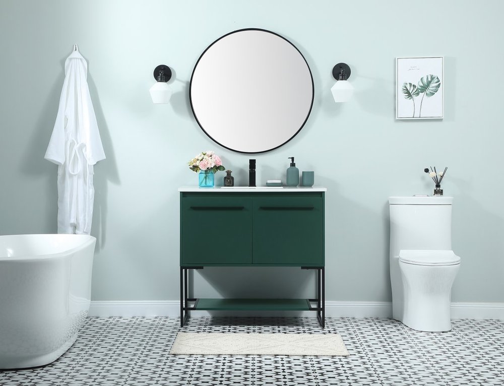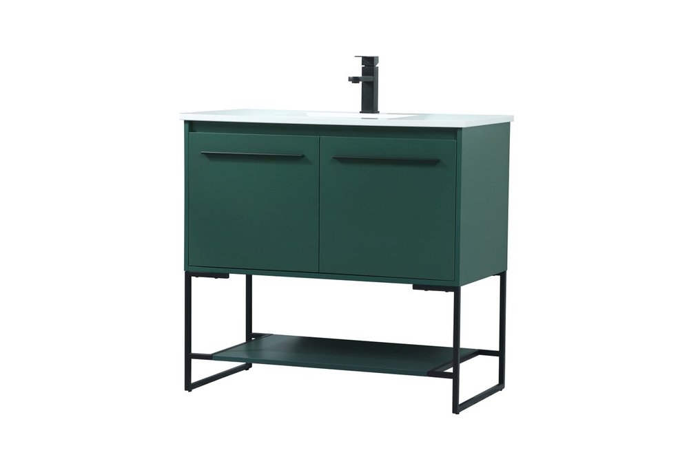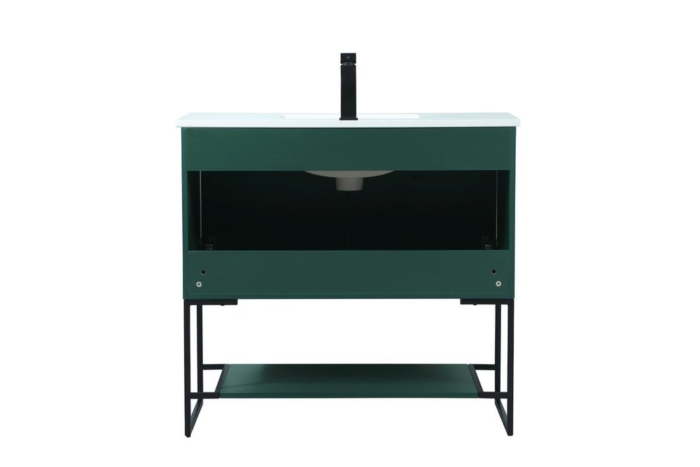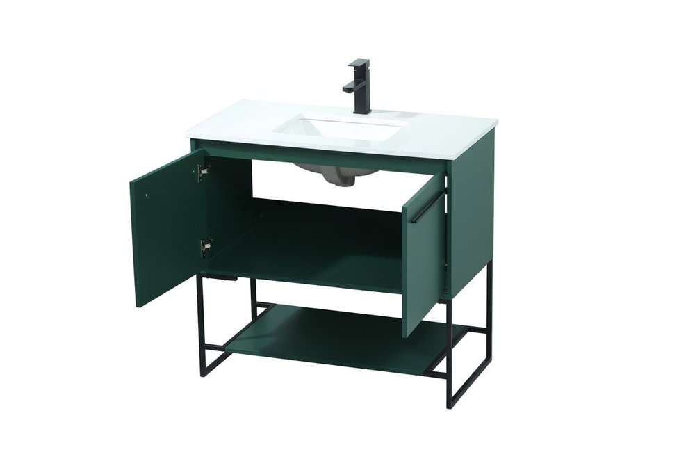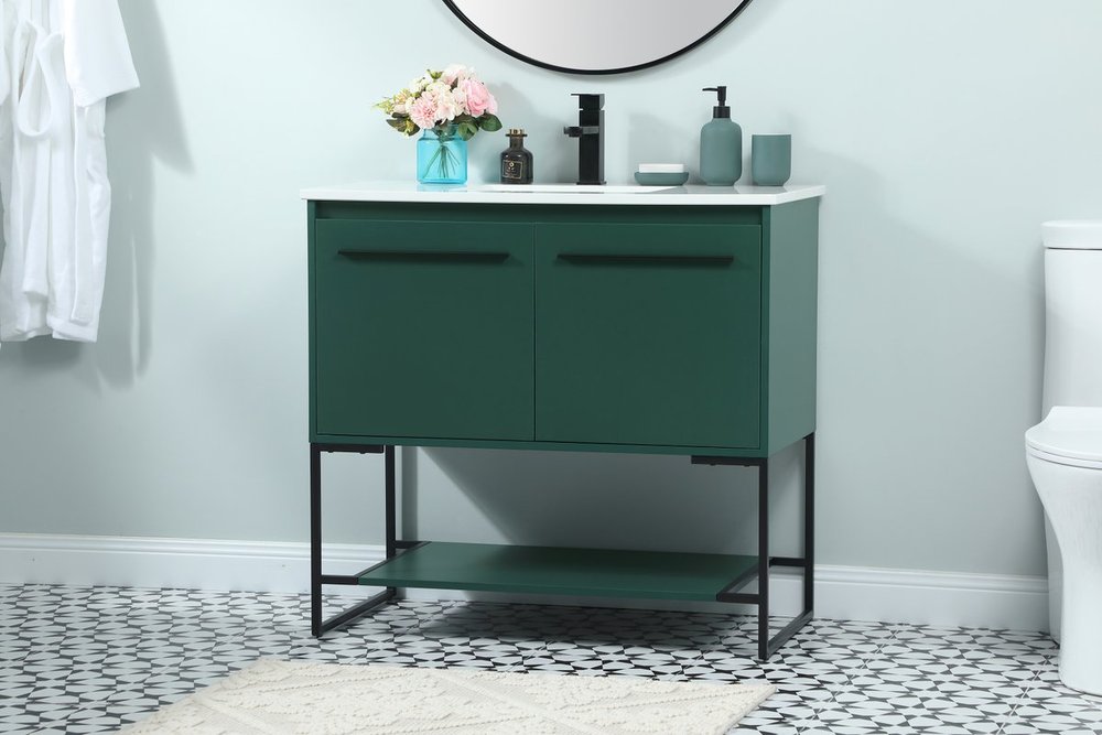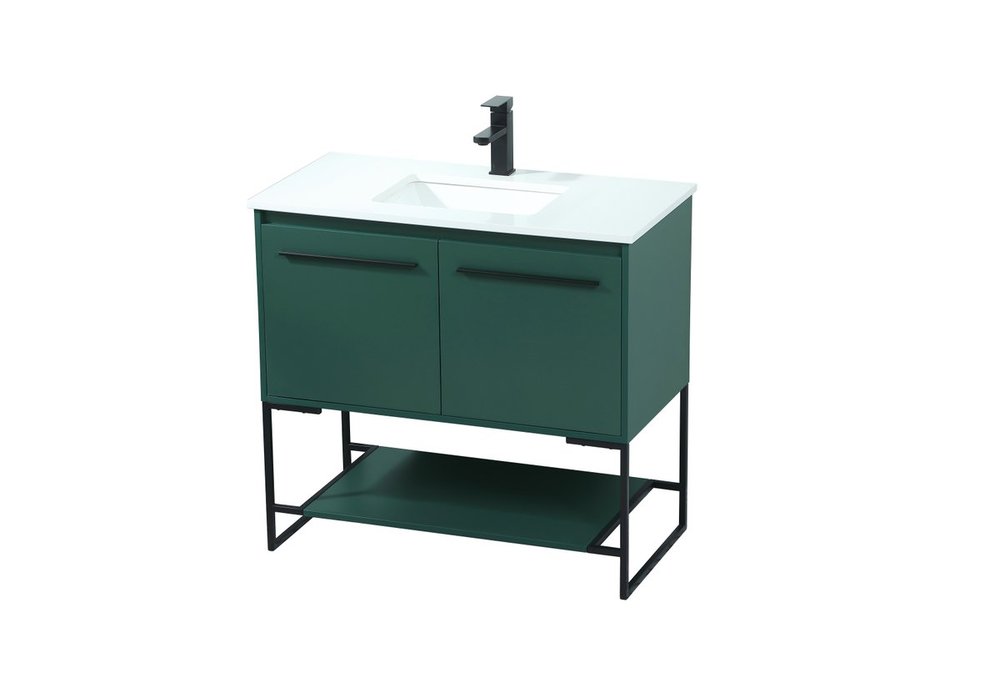 Live in modern comfort with this 36" green finish vanity. Dressed in a green and sleek black metal hardware, its contemporary style will have your bathroom or powder room elevated in industrial sophistication. The open shelf at the base and two doors reveal ample storage space for your bathroom essentials and miscellany. Clean lines create its own visual interest, adding trendy looks to your already chic room.