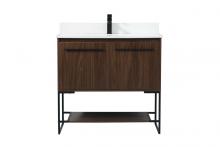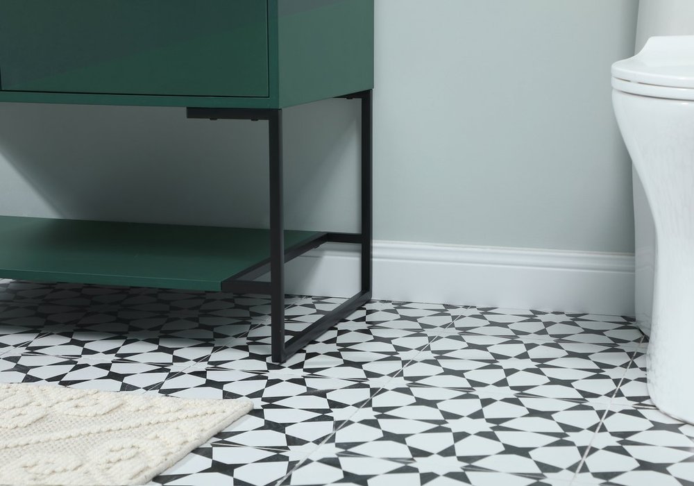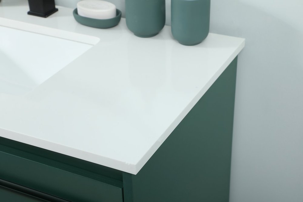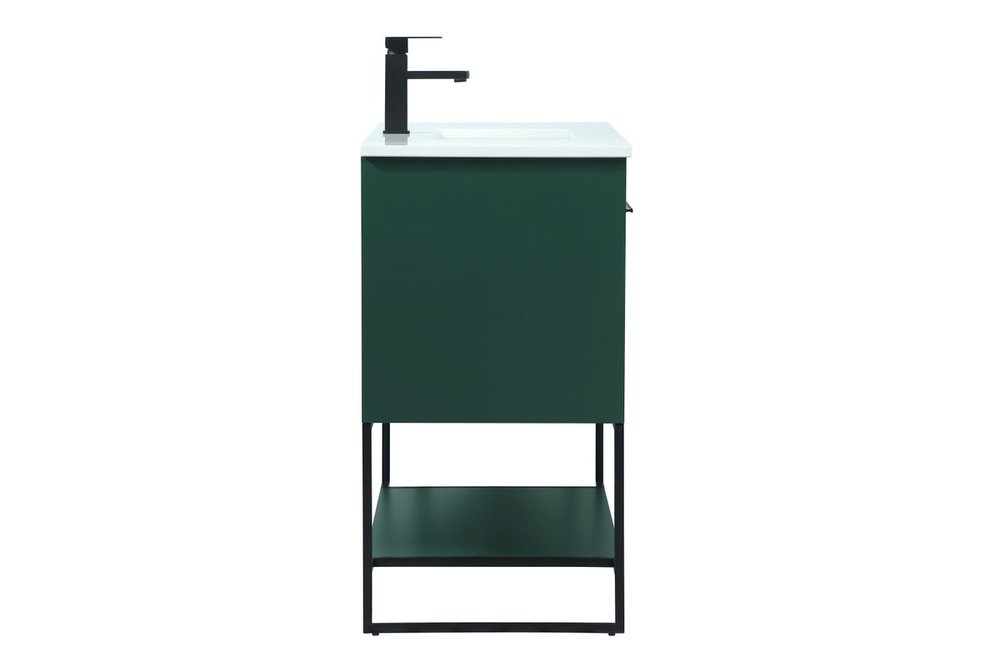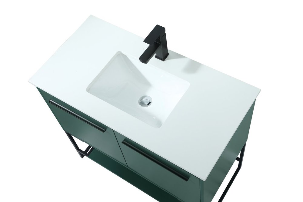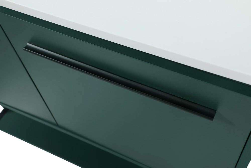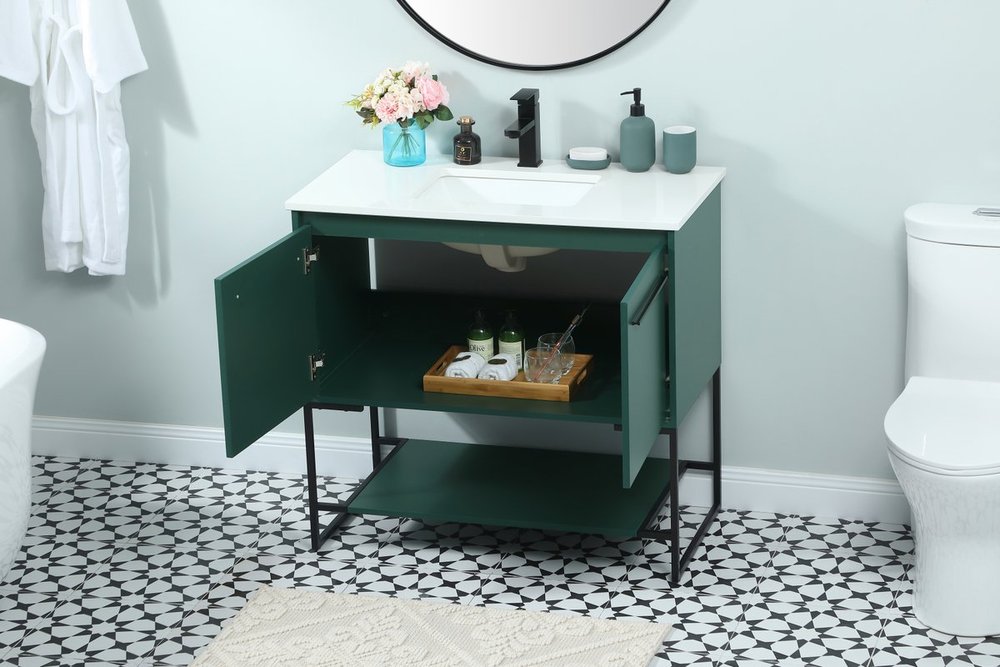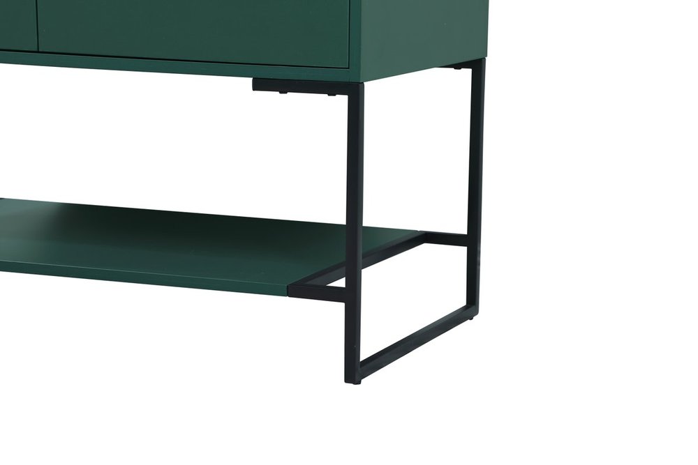 Live in modern comfort with this 36" green finish vanity. Dressed in a green and sleek black metal hardware, its contemporary style will have your bathroom or powder room elevated in industrial sophistication. The open shelf at the base and two doors reveal ample storage space for your bathroom essentials and miscellany. Clean lines create its own visual interest, adding trendy looks to your already chic room.