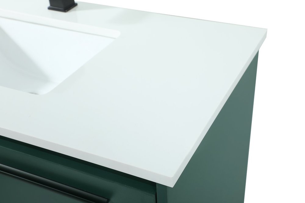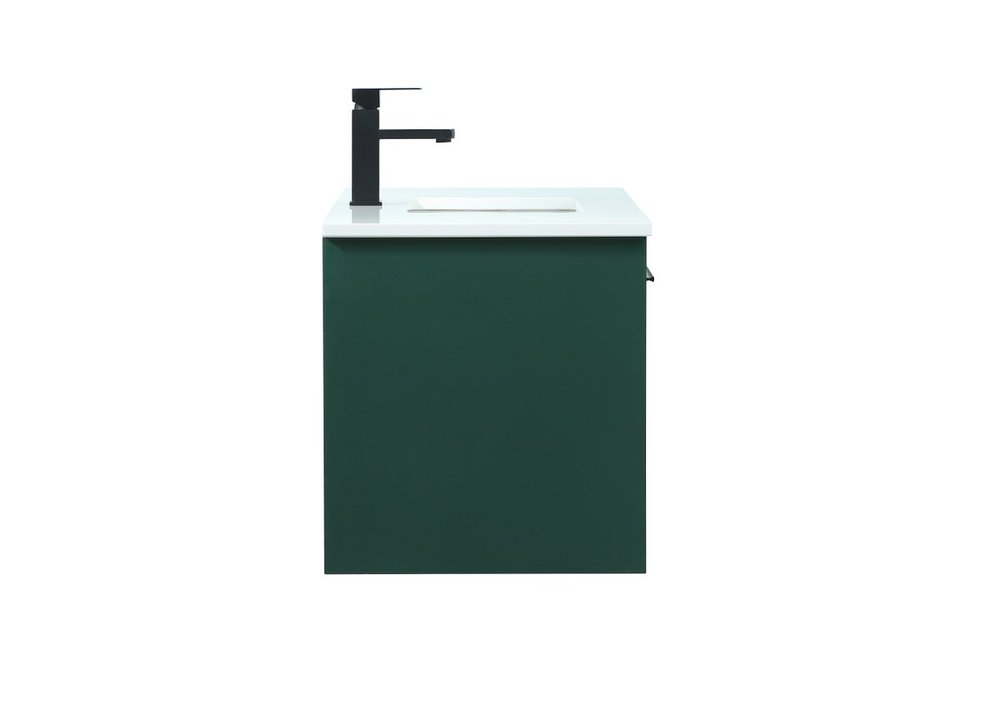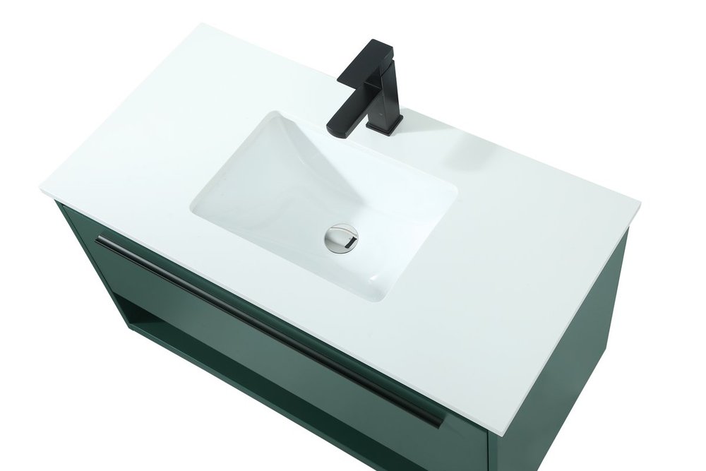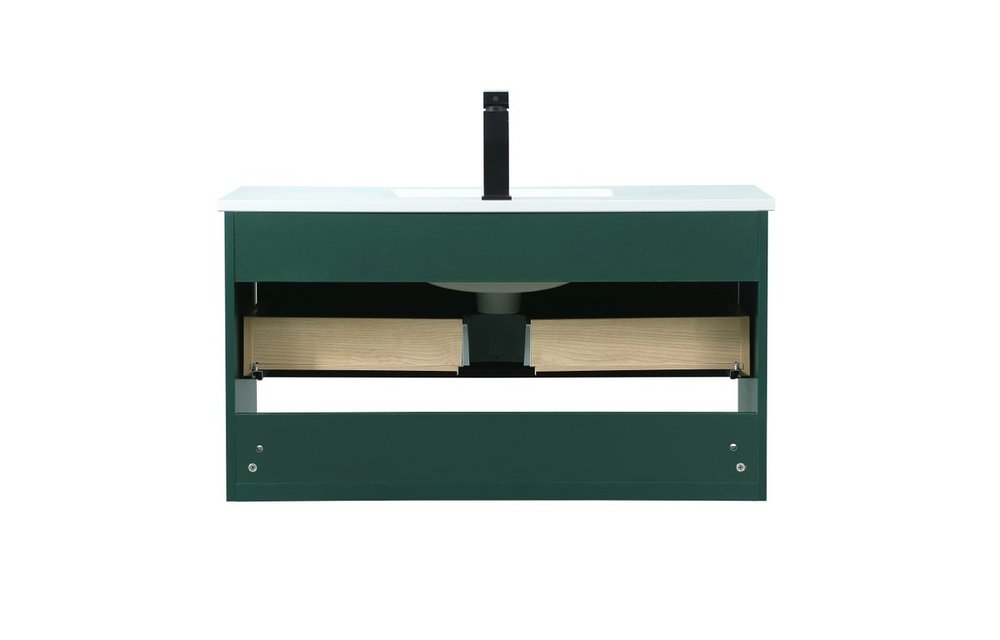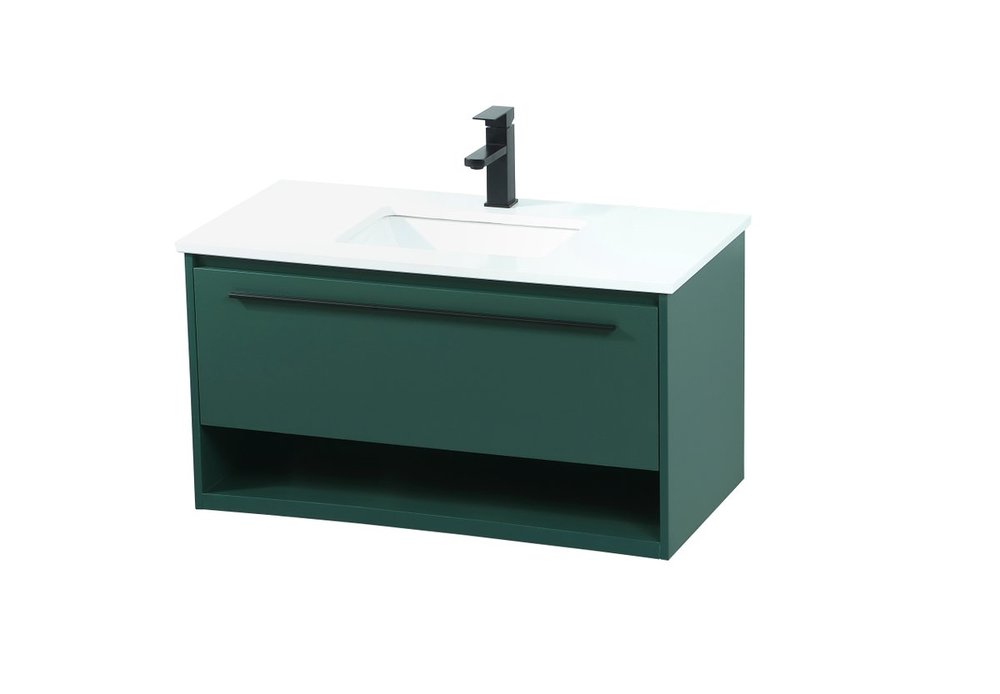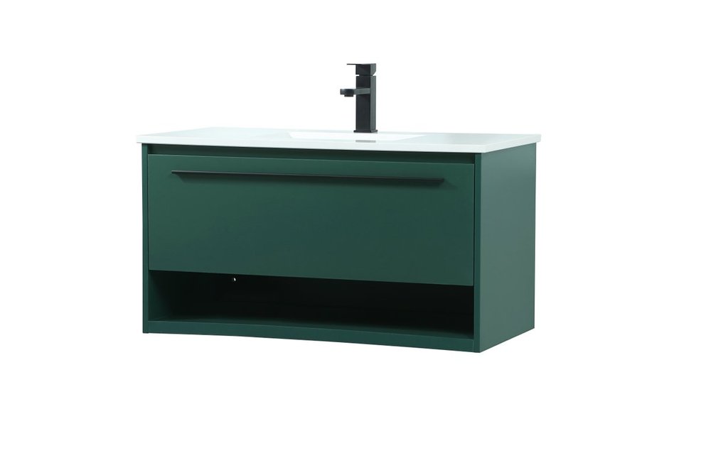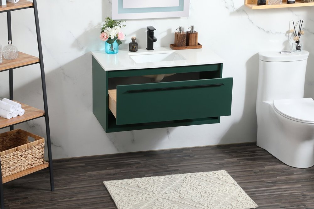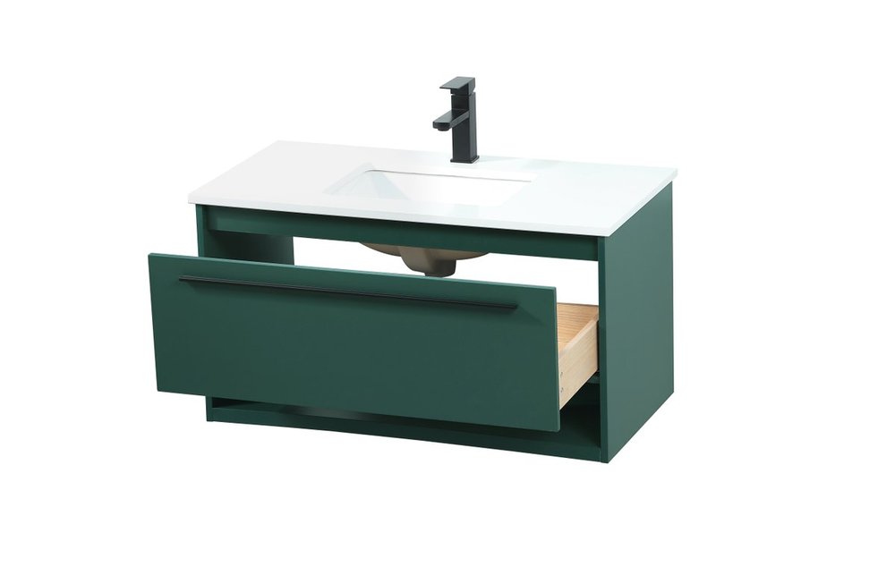 Save space and make your bathroom appear bigger with this floating vanity. Its minimal design will have you in awe, while its clean lines will leave your room feeling fresh and uncluttered. The Single u-drawer pulls out for storage while the open space below allows you to place extra towels or various other essentials. The ivory white engineered marble counter top with porcelain sink adds refined luxe while the aluminum barpull style handle adorn the vanity face.