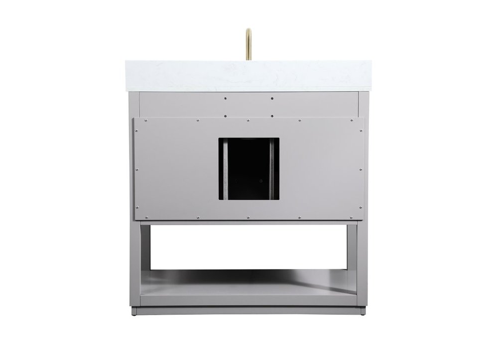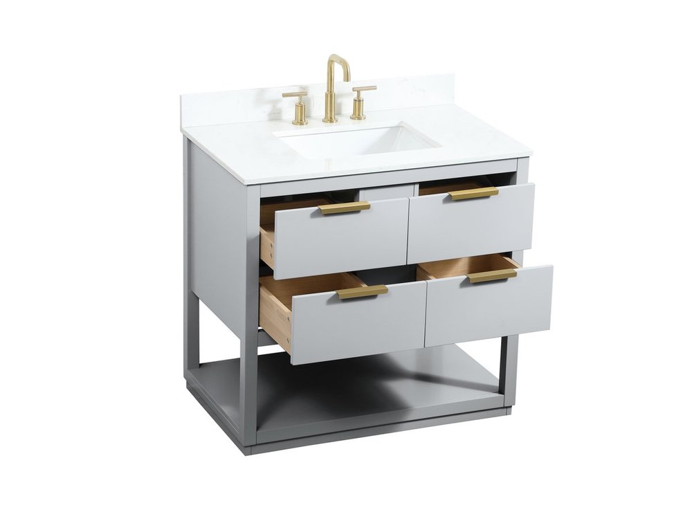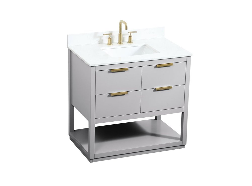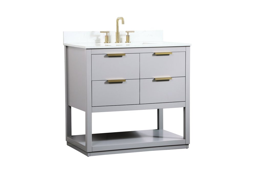 Live in modern comfort with this 36" gray finish vanity. Dressed in a gray and sleek gold metal hardware, its contemporary style will have your bathroom or powder room elevated in modern sophistication. The open shelf at the base and four drawers reveal ample storage space for your bathroom essentials and miscellany. Clean lines create its own visual interest, adding trendy looks to your already chic room. Comes with a matching backsplash to protect your walls.