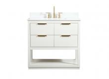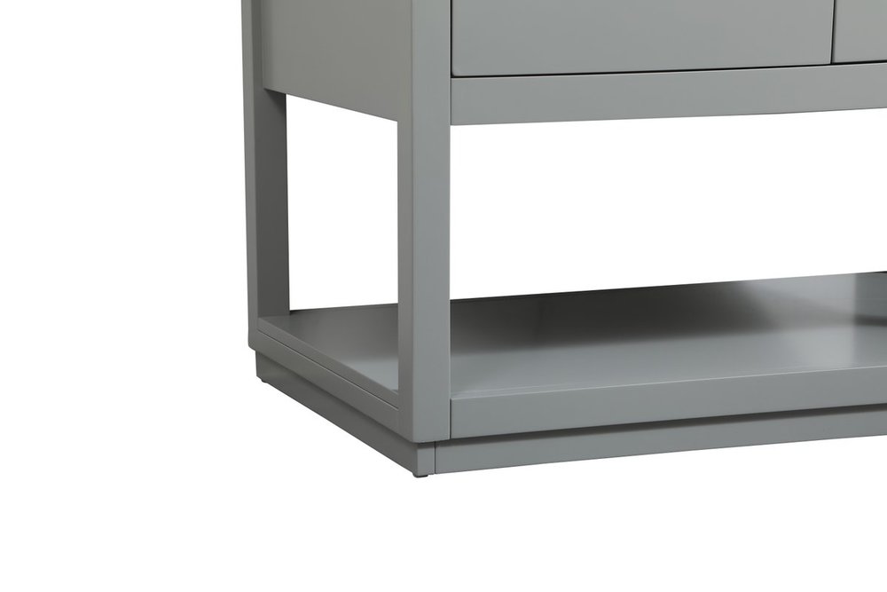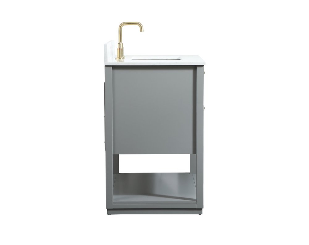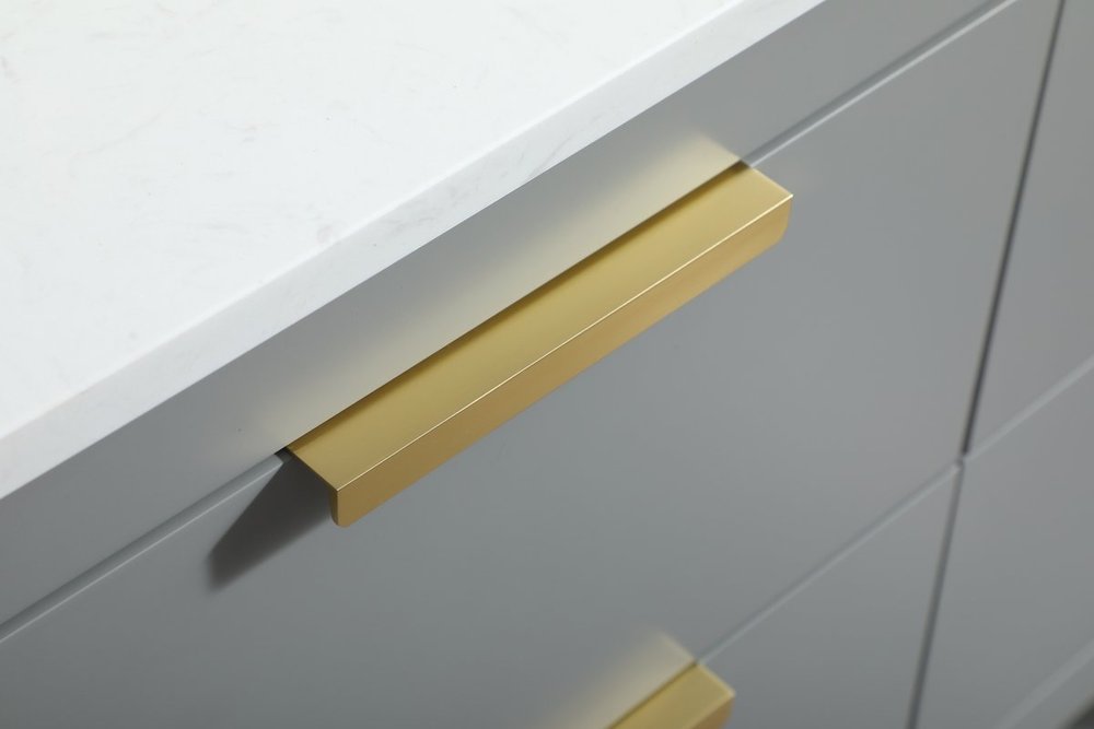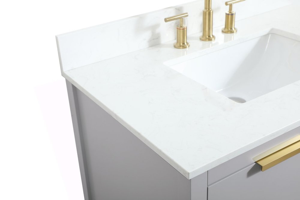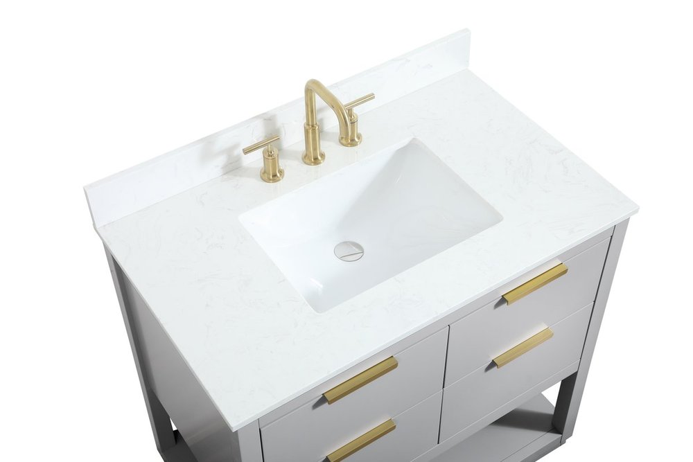 Live in modern comfort with this 36" gray finish vanity. Dressed in a gray and sleek gold metal hardware, its contemporary style will have your bathroom or powder room elevated in modern sophistication. The open shelf at the base and four drawers reveal ample storage space for your bathroom essentials and miscellany. Clean lines create its own visual interest, adding trendy looks to your already chic room. Comes with a matching backsplash to protect your walls.