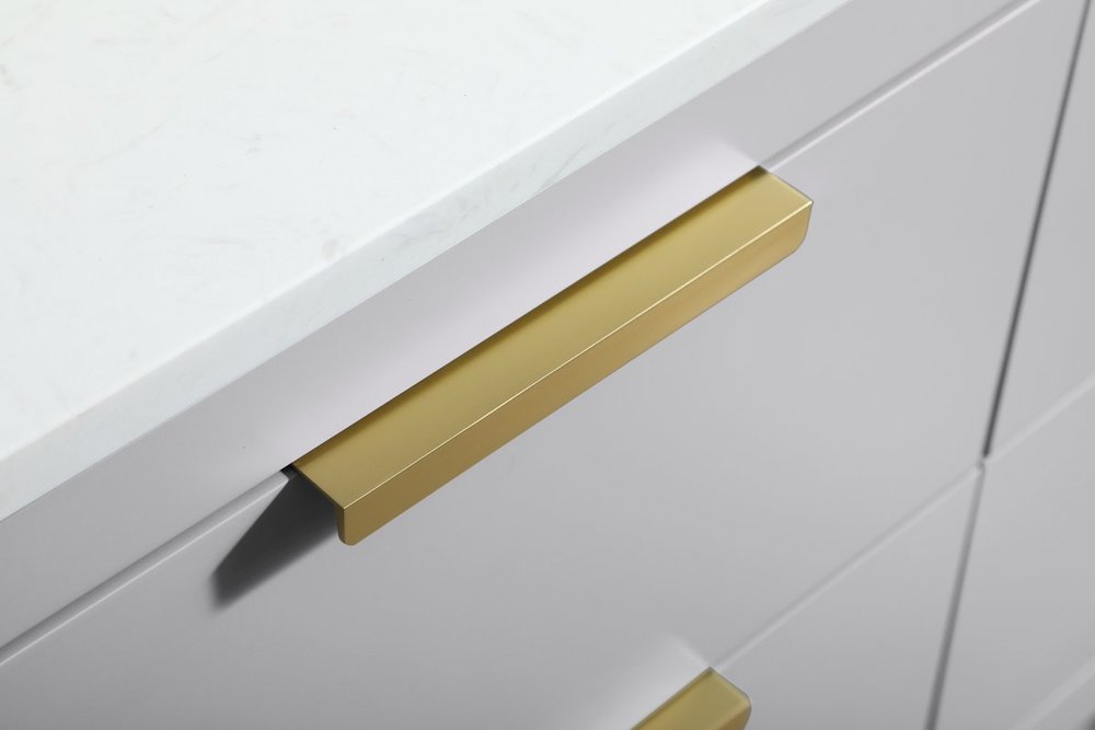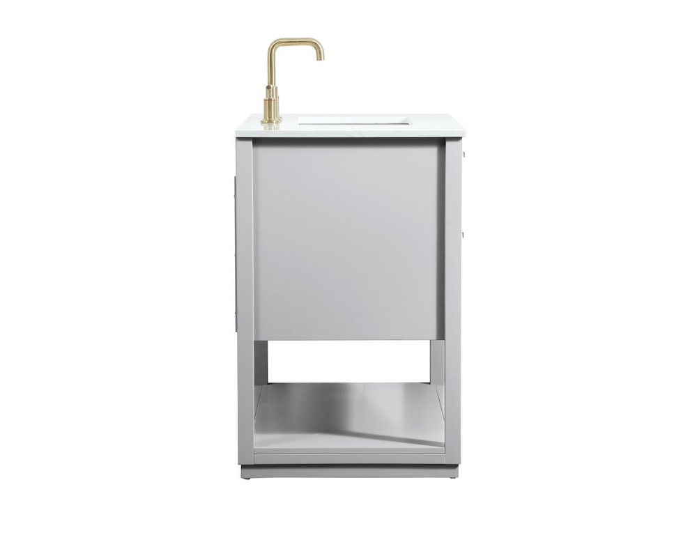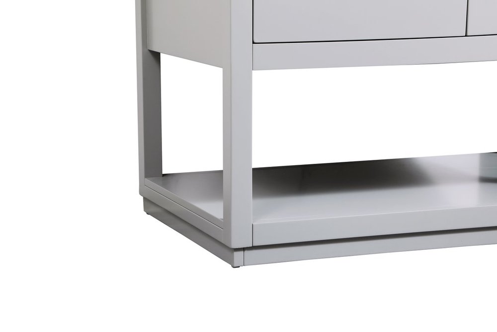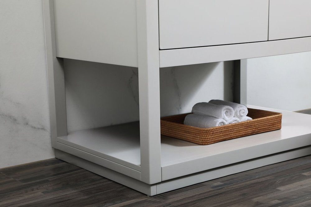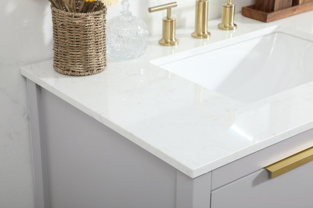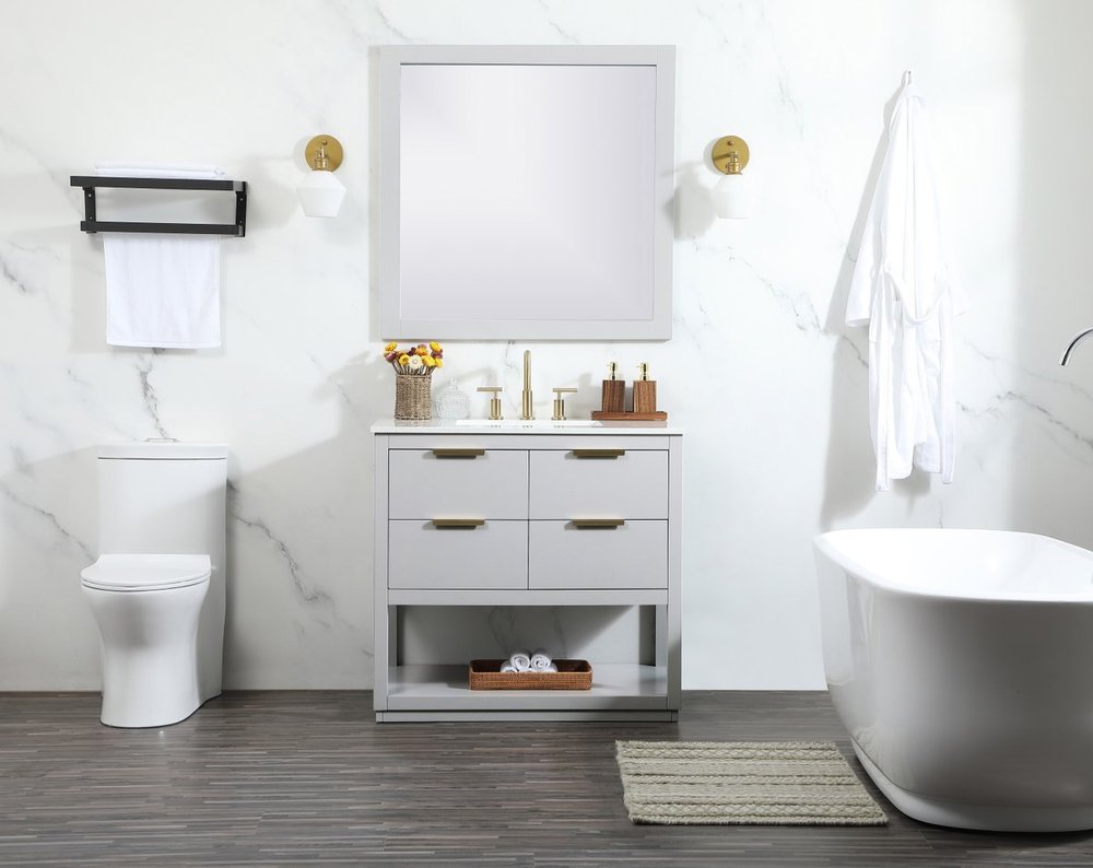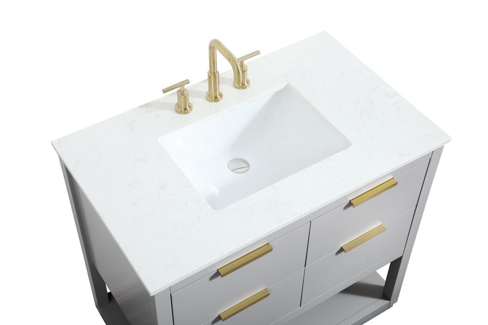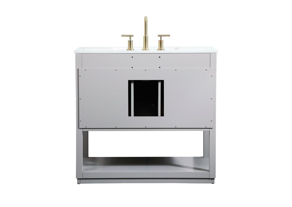 Live in modern comfort with this 36" gray finish vanity. Dressed in a gray and sleek gold metal hardware, its contemporary style will have your bathroom or powder room elevated in modern sophistication. The open shelf at the base and four drawers reveal ample storage space for your bathroom essentials and miscellany. Clean lines create its own visual interest, adding trendy looks to your already chic room.