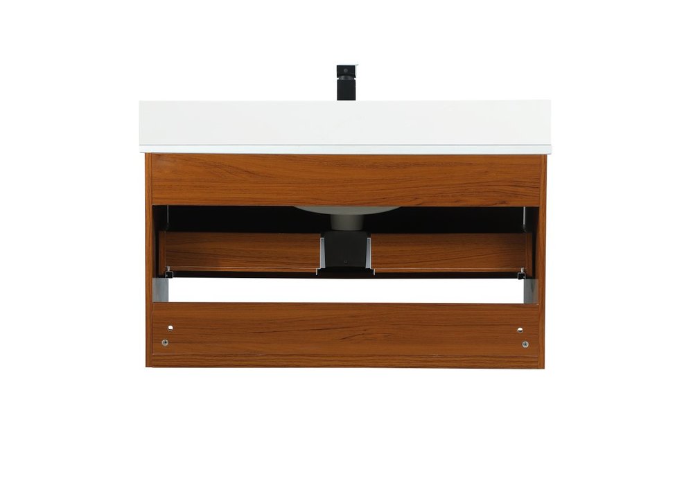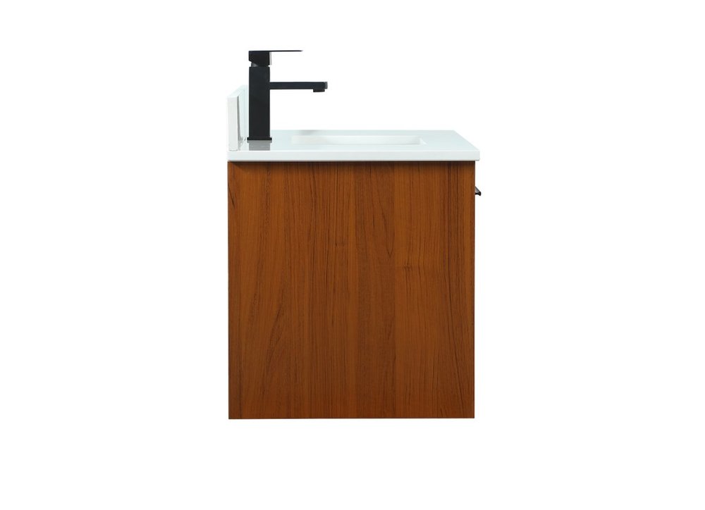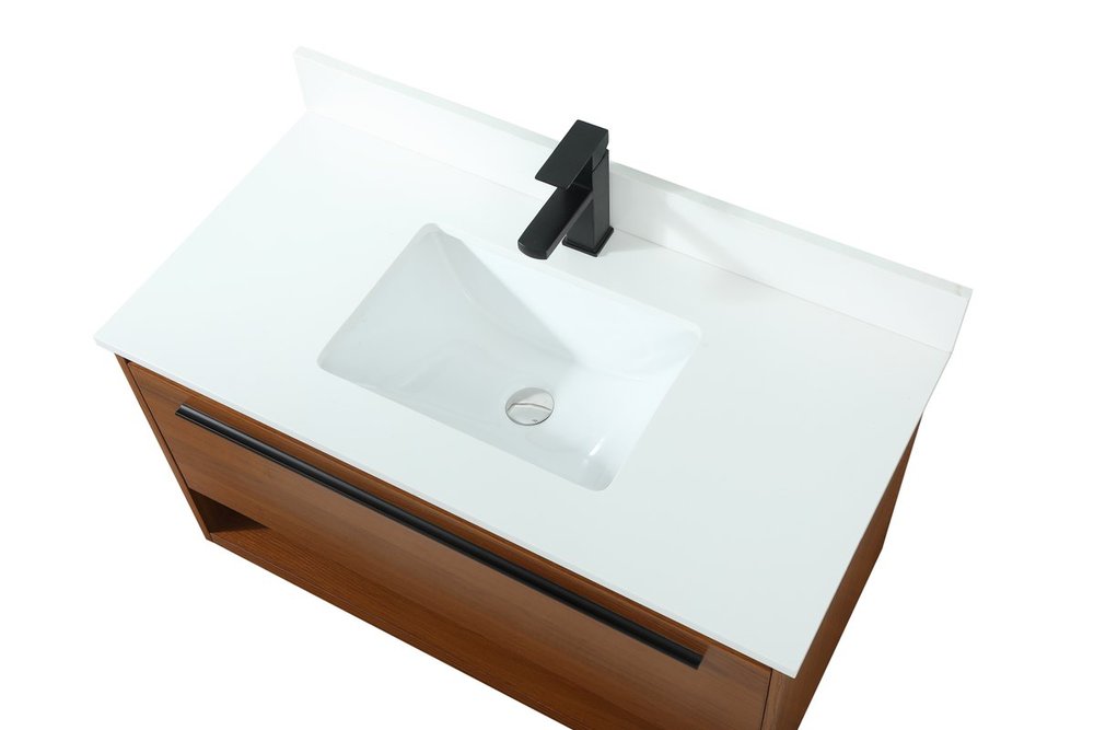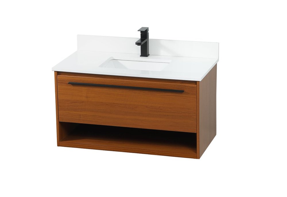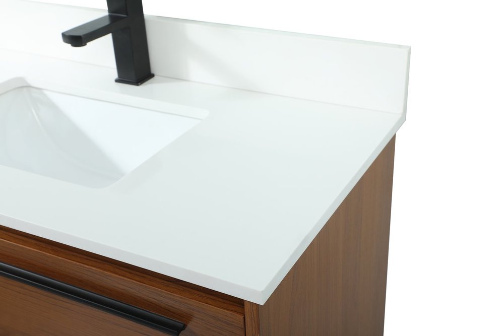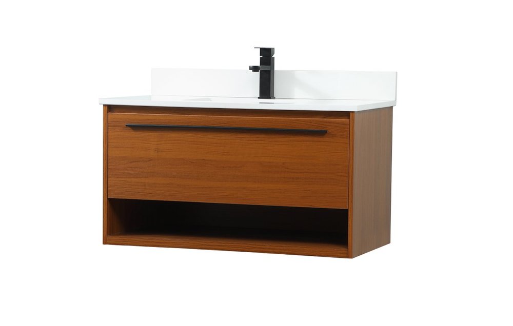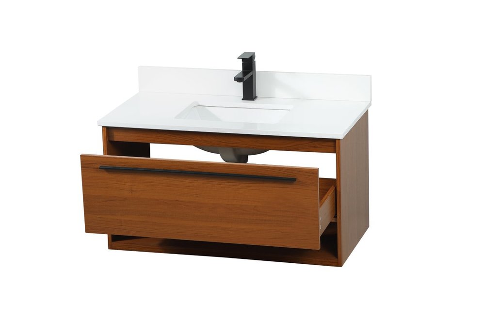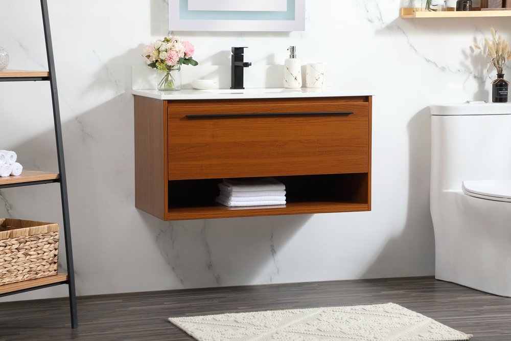 Save space and make your bathroom appear bigger with this floating vanity. Its minimal design will have you in awe, while its clean lines will leave your room feeling fresh and uncluttered. The Single u-drawer pulls out for storage while the open space below allows you to place extra towels or various other essentials. The ivory white engineered marble counter top with porcelain sink adds refined luxe while the aluminum barpull style handle adorn the vanity face. Comes with a matching backsplash to protect your walls.