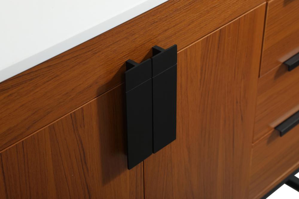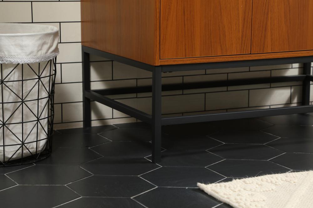 This vanity is a sleek-looking piece of bathroom furniture that is easy to incorporate into your design scheme. The cabinet features a smooth door panel with an oversized steel handle and soft close hinges provide ample room for accessories. Constructed of engineered wood, the powder-coated metal rod legs are an urban industrial look that we love. Minor assembly of the metal legs needed to get this vanity up and running. Comes with a matching backsplash to complete the look and protects your wall.
