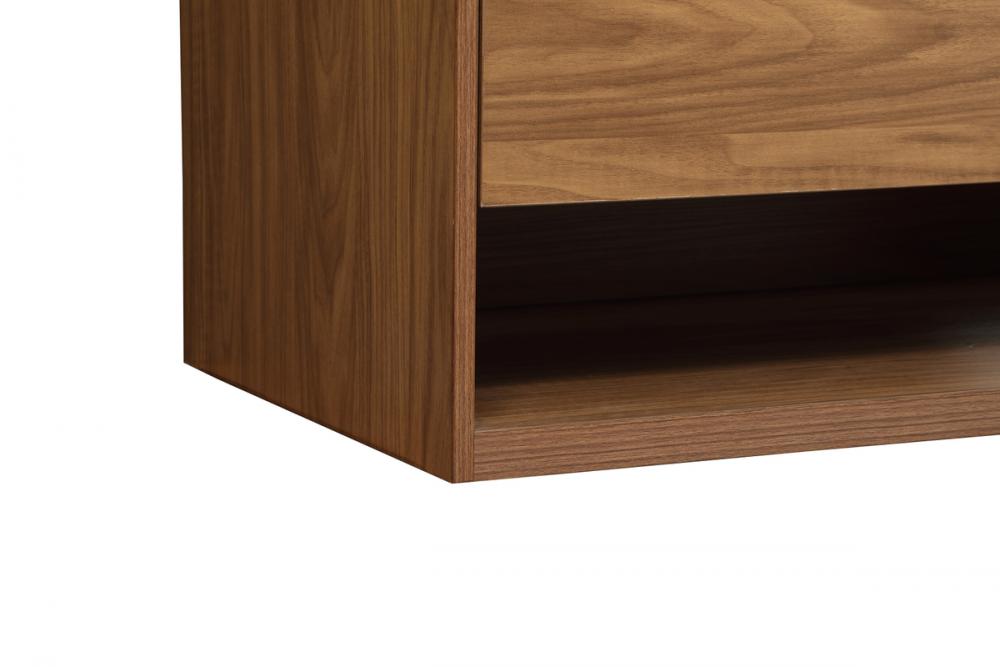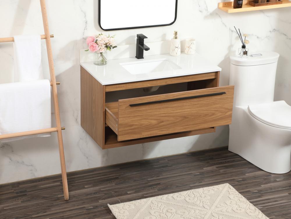 Save space and make your bathroom appear bigger with this floating vanity. Its minimal design will have you in awe, while its clean lines will leave your room feeling fresh and uncluttered. The Single u-drawer pulls out for storage while the open space below allows you to place extra towels or various other essentials. The ivory white engineered marble counter top with porcelain sink adds refined luxe while the aluminum barpull style handle adorn the vanity face. Comes with a matching backsplash to complete the look and protects your wall.