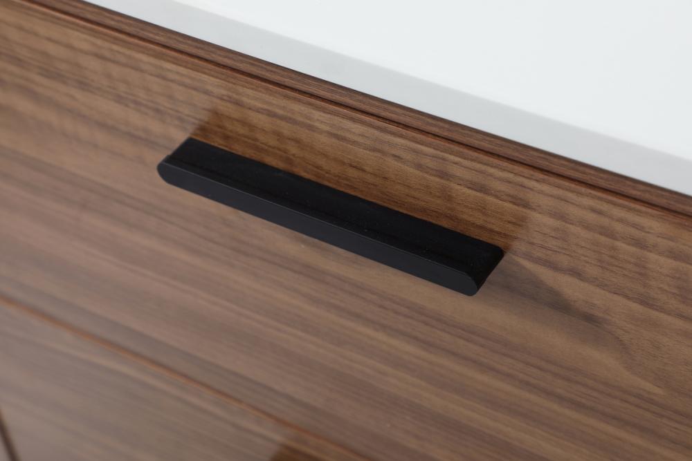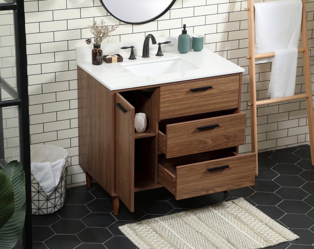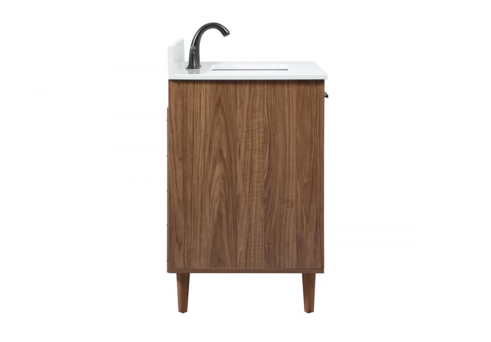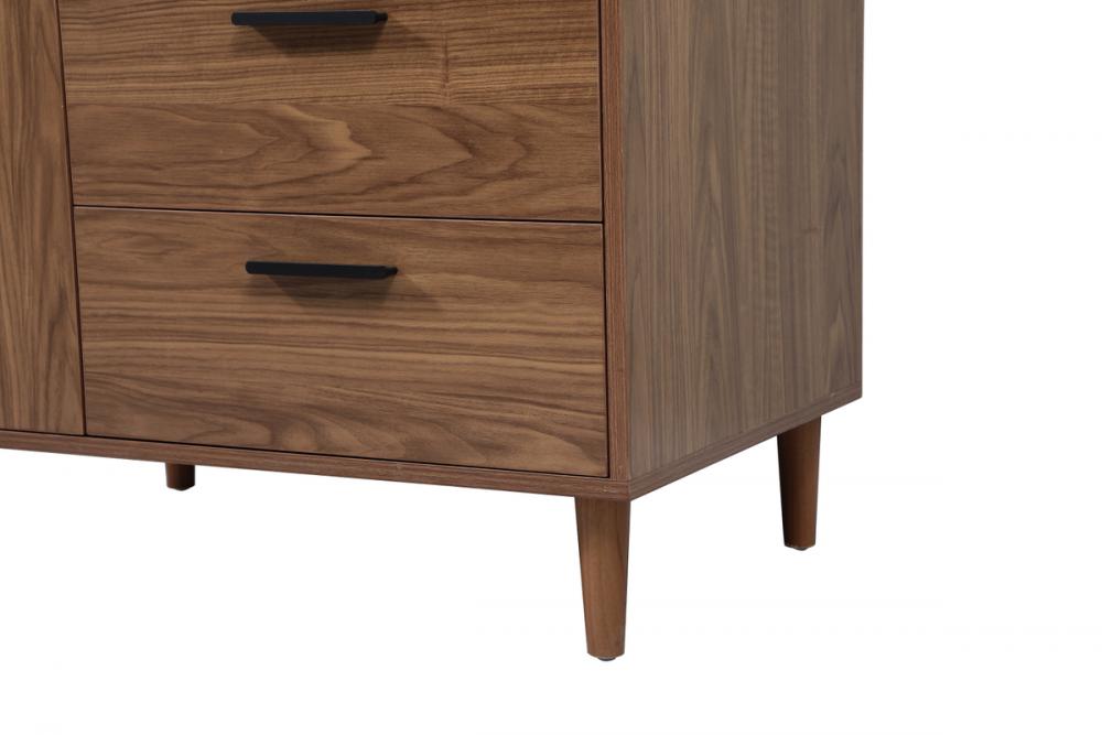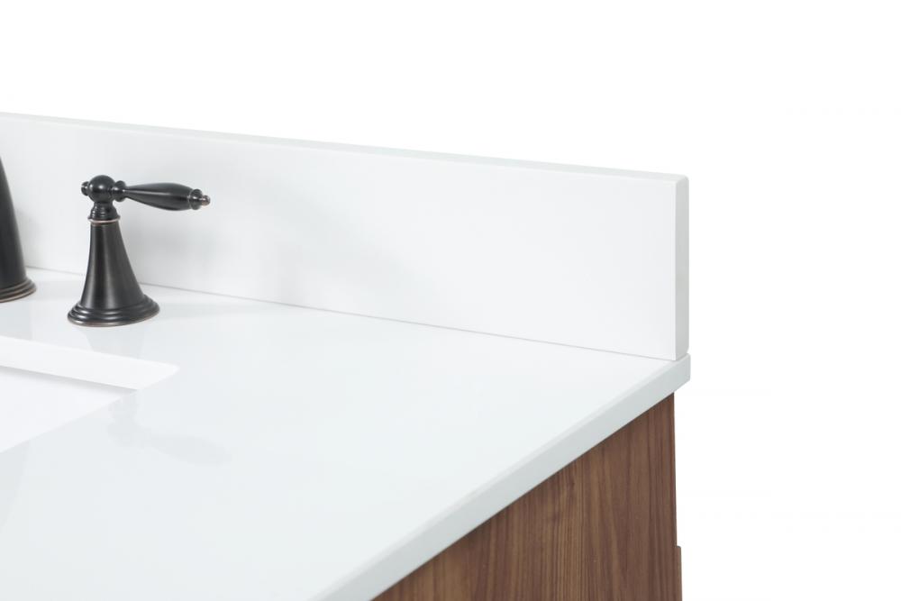Exquisite modern sophistication is defined with the wood look and black barpulls of this vanity and slender tapered legs. Its length makes it the perfect addition to any sized home, and saves space with its storage area hidden behind the Single cabinet doors and two functional drawers. Topped with a highly durable engineered marble countertop and a porcelain undermount sink, this modern design will become your focal point of your bathroom or powder room. Equipped with soft-closing drawer and doors adds a quiet functional touch. Comes with a matching backsplash to complete the look and protects your wall.