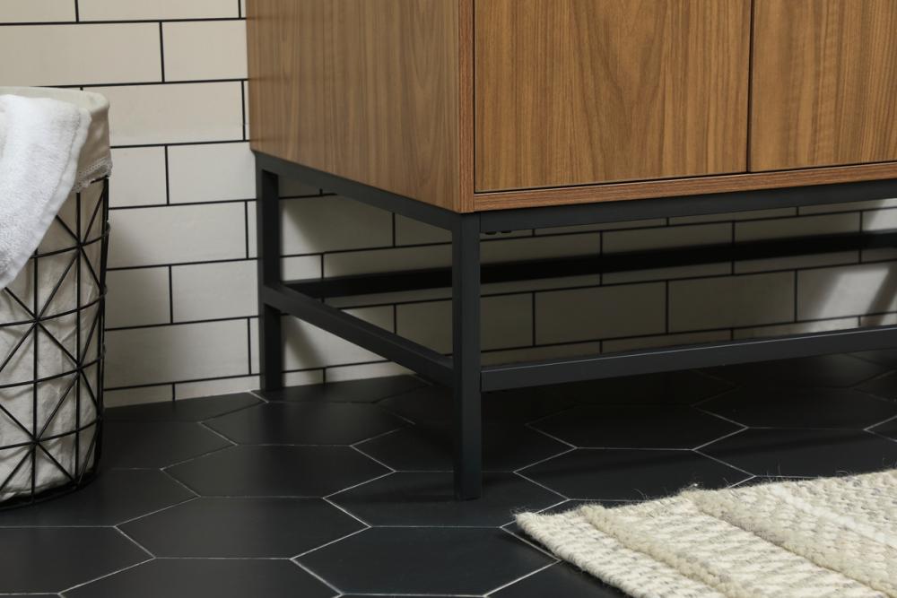 This vanity is a sleek-looking piece of bathroom furniture that is easy to incorporate into your design scheme. The cabinet features a smooth door panel with an oversized steel handle and soft close hinges provide ample room for accessories. Constructed of engineered wood, the powder-coated metal rod legs are an urban industrial look that we love. Minor assembly of the metal legs needed to get this vanity up and running. Comes with a matching backsplash to complete the look and protects your wall.