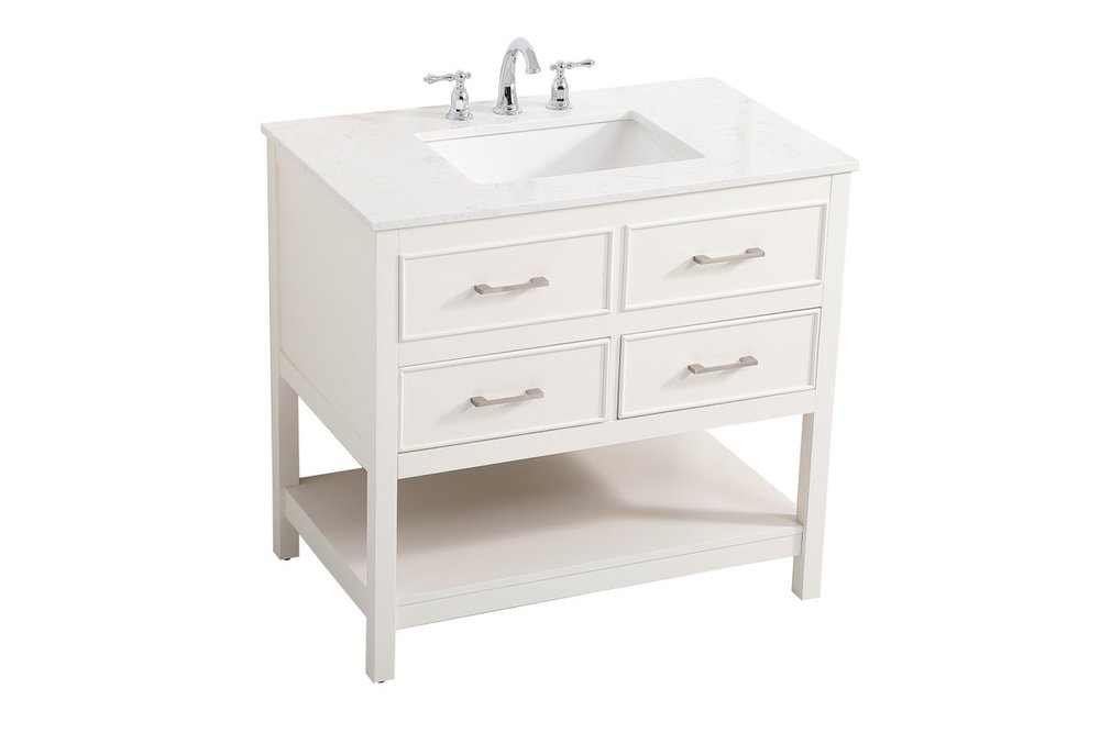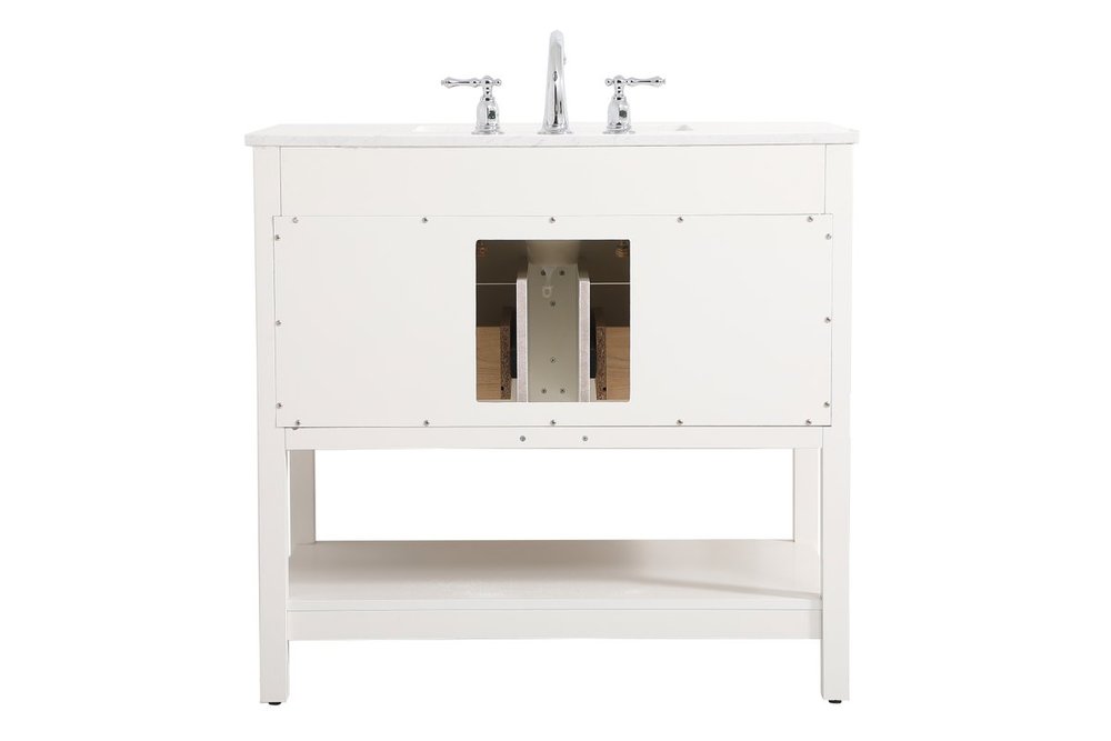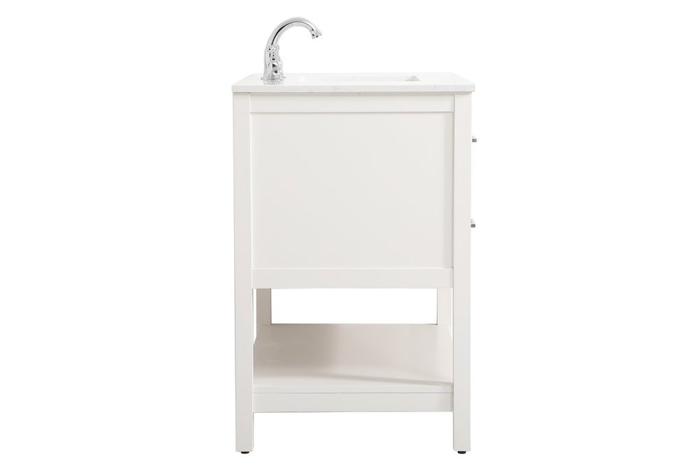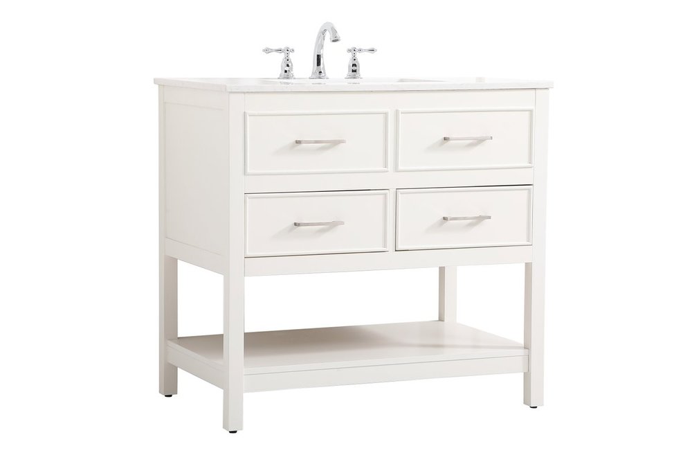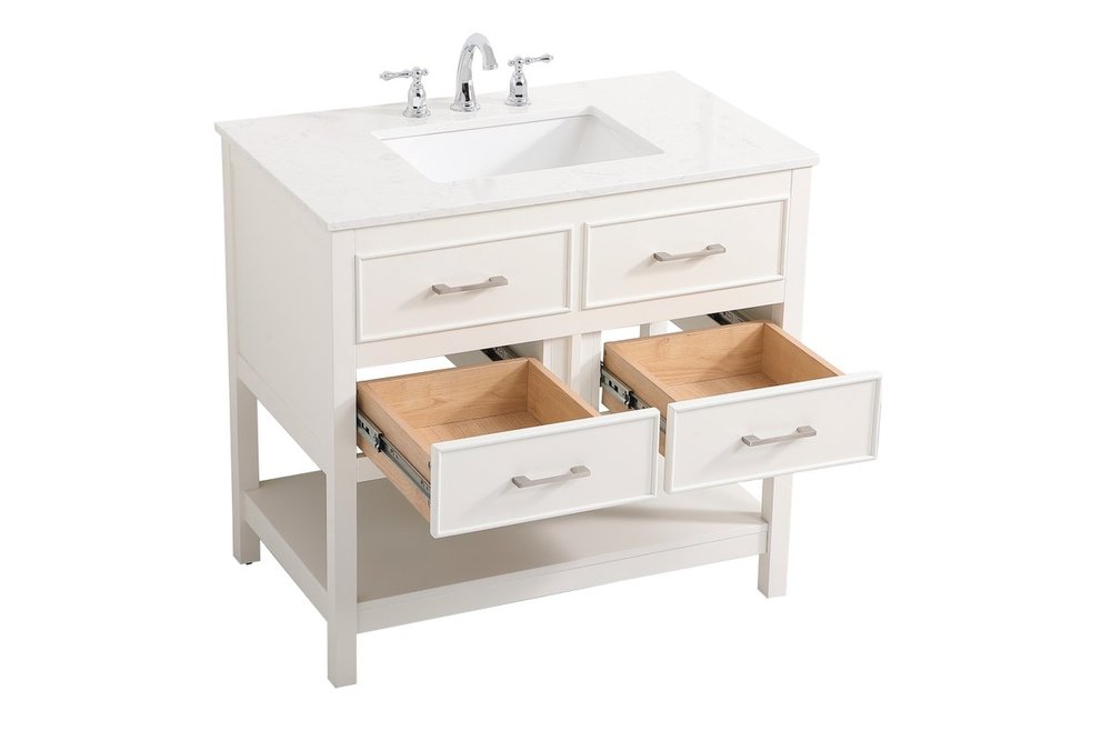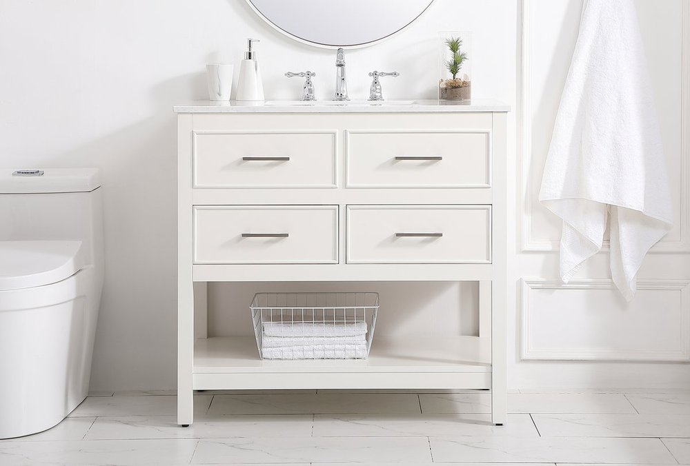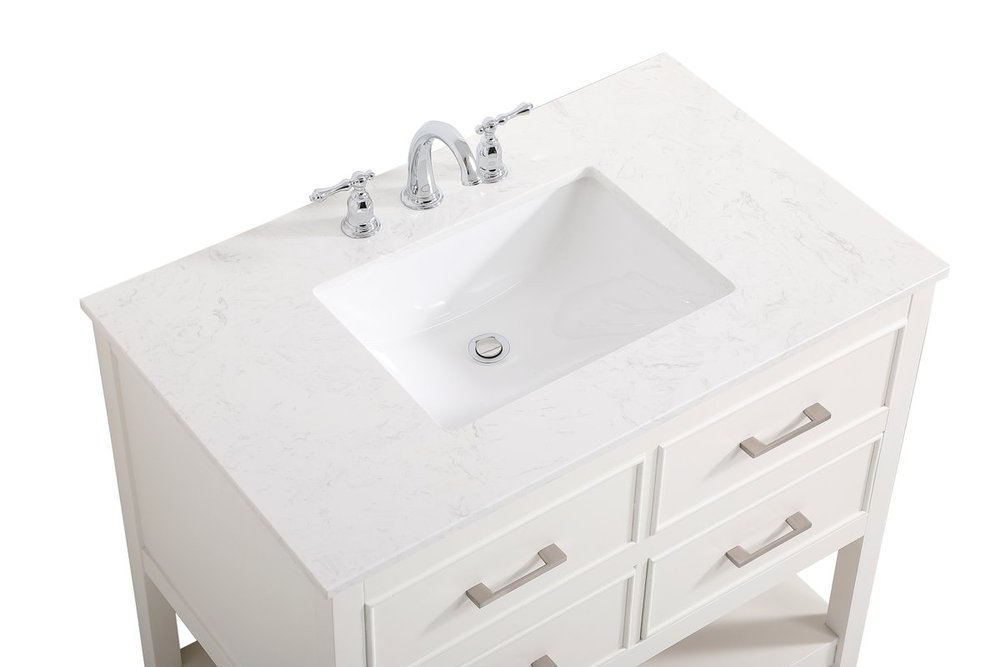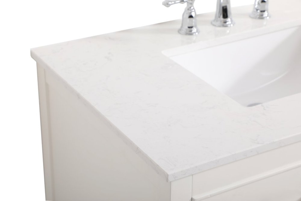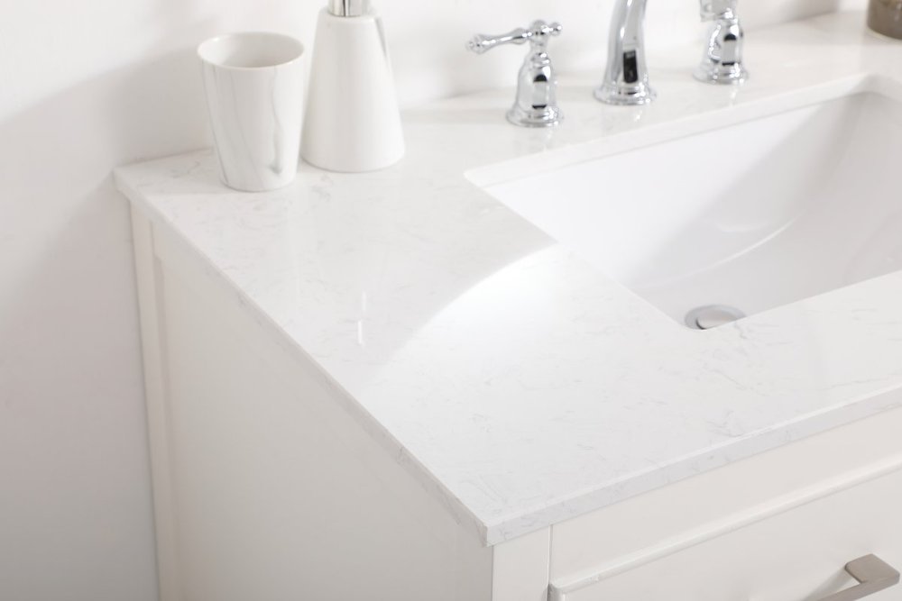 Make the most of your space with this traditional style bathroom vanity. Complements well with many aesthetics with its beautiful finish, calacatta engineered marble countertop, and the contemporary slender handle bar that sits on two upper false drawer and two lower u-shaped drawer, allowing you to store an assortment of bathroom essentials. The lower shelf makes it the perfect space to hold new towels for your guests. This compact vanity ensures both form and function in your bathroom or powder room for you and your guests.
