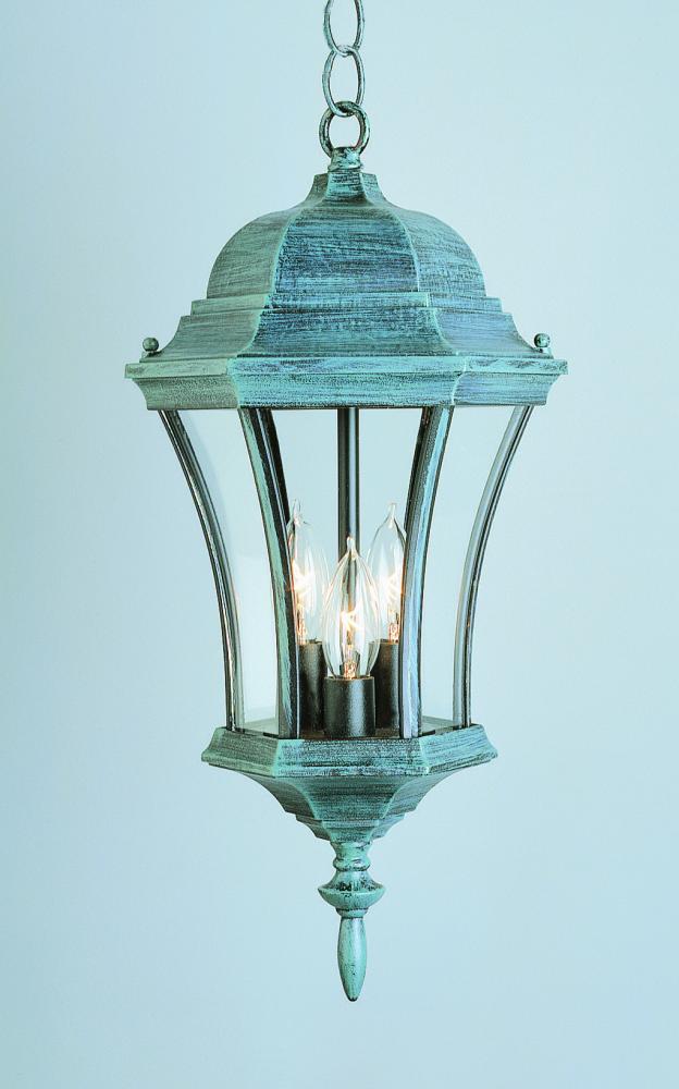 The Burlington Collection brings suspended decor to an outdoor area with a hanging lantern. The Burlington 19.5" Hanging Lantern brings unobtrusive lighting to any outdoor living area while boasting an eye-catching design. It combines Traditional design themes with functionality. The slim incurved eye-catching shape is a new look for old fashioned outdoor decor. Three candelabra bulbs brightly shine through the Clear Glass sides. Bulbs are not included. A matching chain is included for hanging. Featuring several finish options, The Burlington Collection will accommodate a variety of outdoor decor styles and will not disappoint.