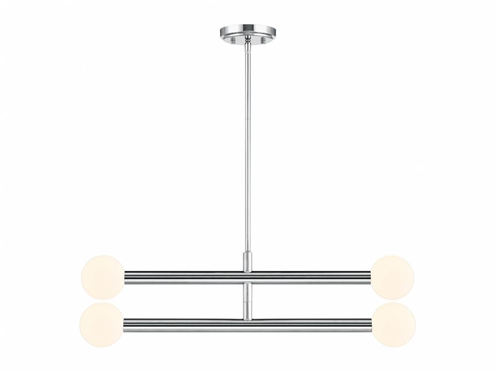 This perky, peppy 4-light chandelier has an understated style that makes a big impact! The light shines from inside orbs of white opal glass and the Chrome finish works beautifully with any decor. You can even rotate the arms for a customized look! This chandelier is 30" in width and has an adjustable height ranging from 8" to 62". It comes with four 12" downrods and one 6" downrod. Uses four G9 LED bulbs of up to 3.5 watts per bulb. Bulbs not included.