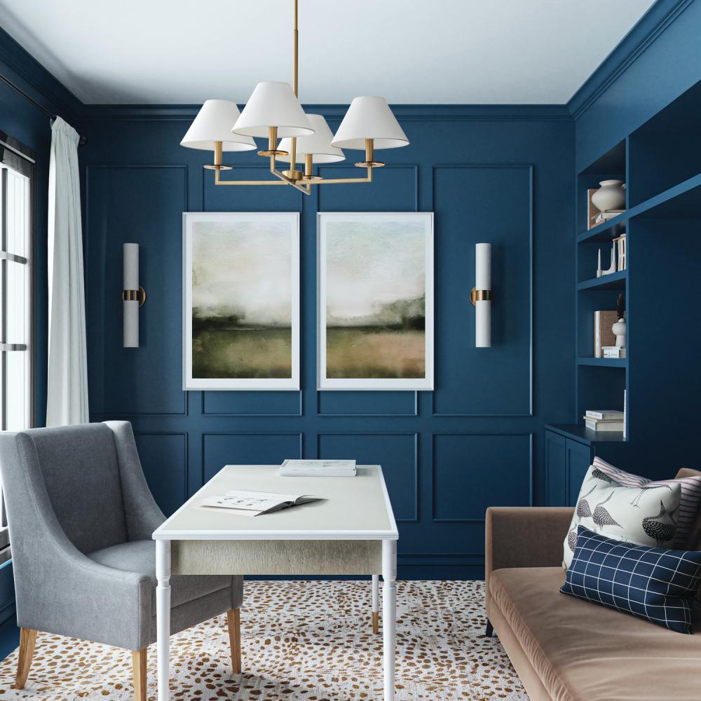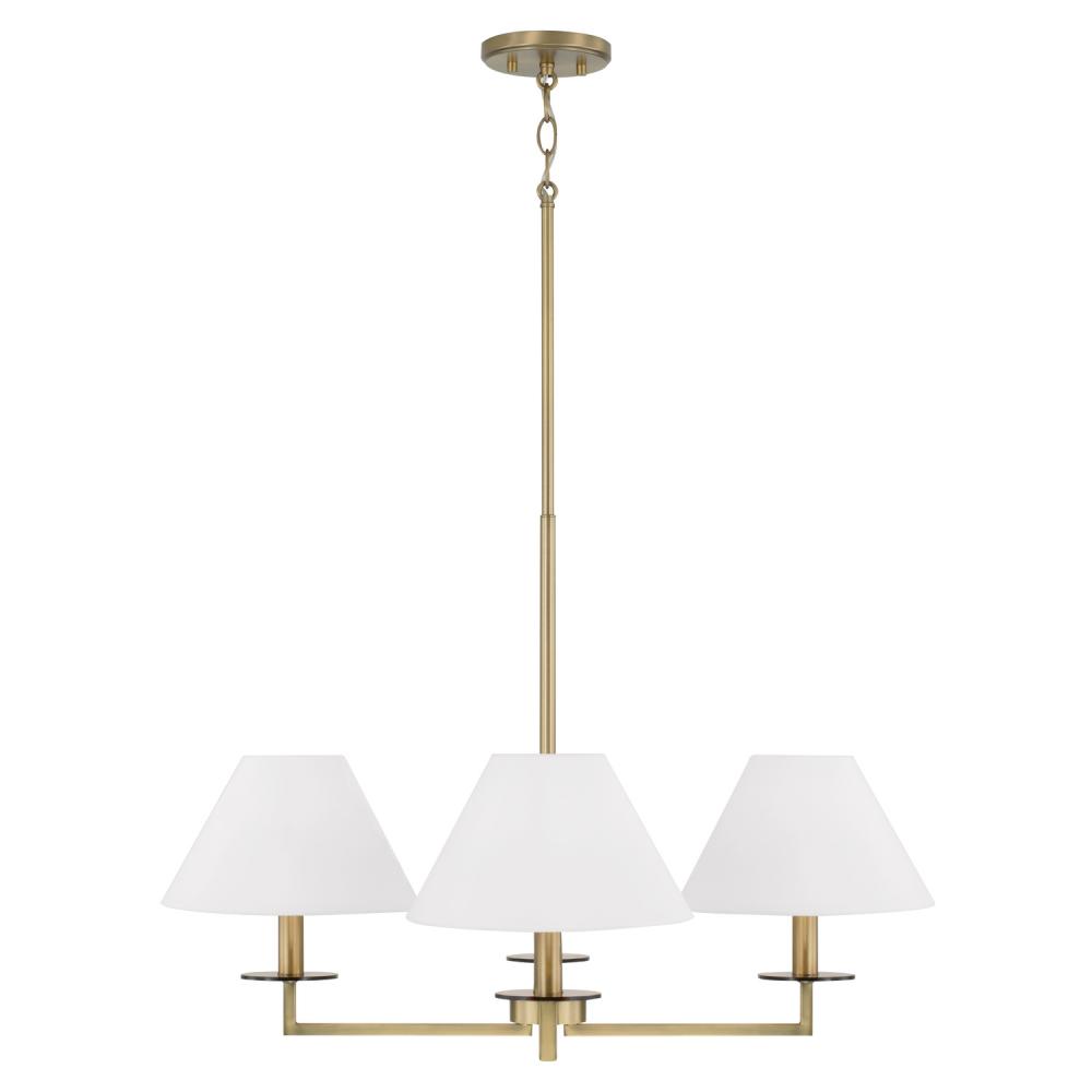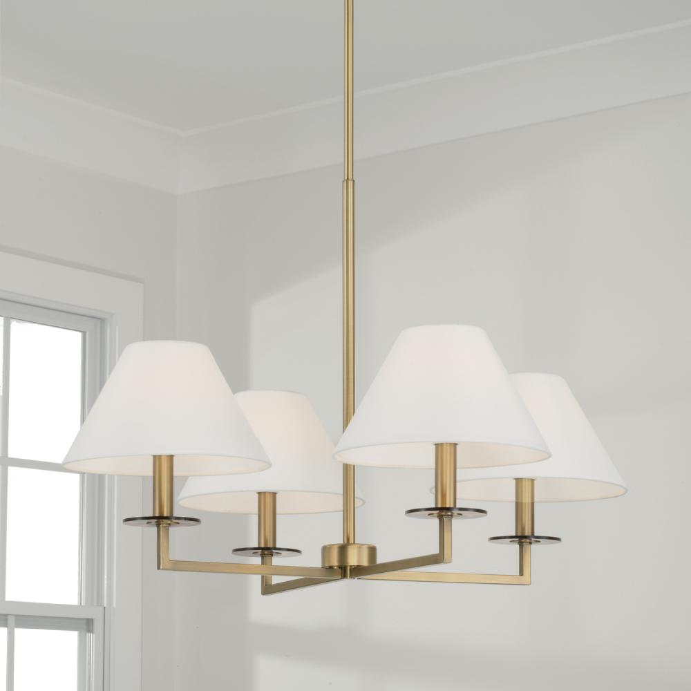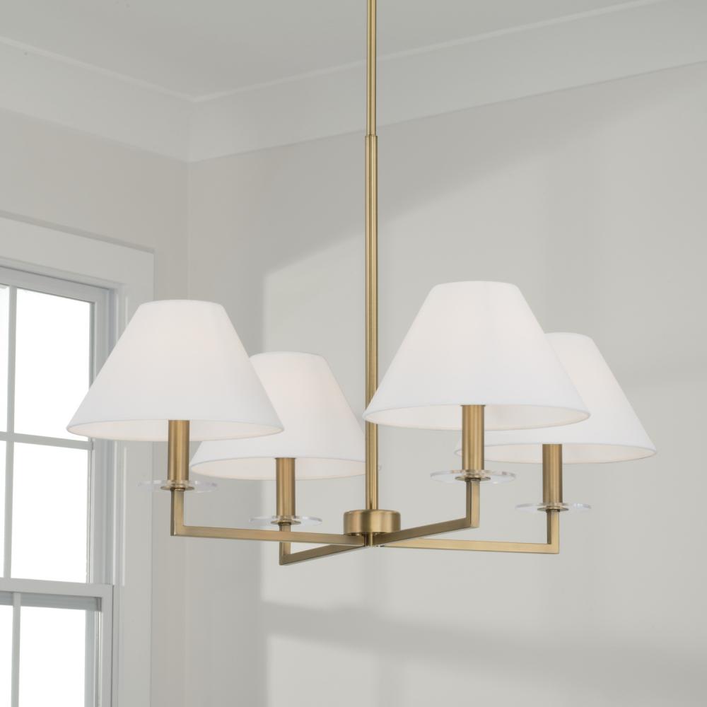 Decadence is in the details. The Gilda Small Chandelier brings the glamour with interchangeable tortoise shell or clear acrylic bobeches. The Aged Brass finish adds a warm tone, while the tapered White fabric stay-straight shades and squared arms create a crisp, classic aesthetic.