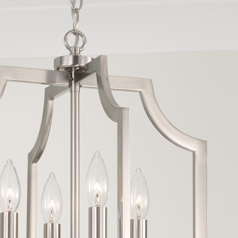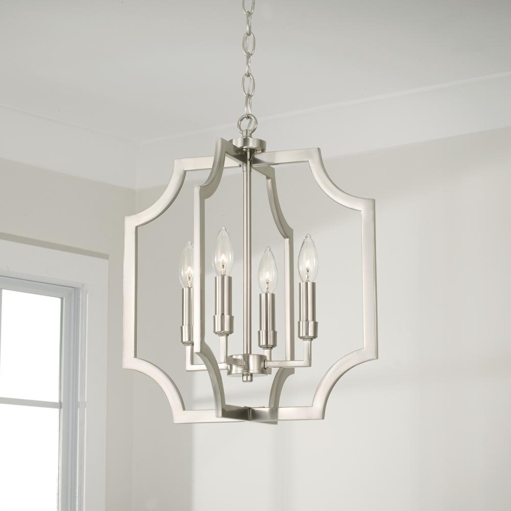 With the open, airy silhouette, the Courtney Lantern Foyer Pendant brings charming style that doesn't overpower. The curved corners add chic appeal, while the Brushed Nickel finish pairs seamlessly with any aesthetic.