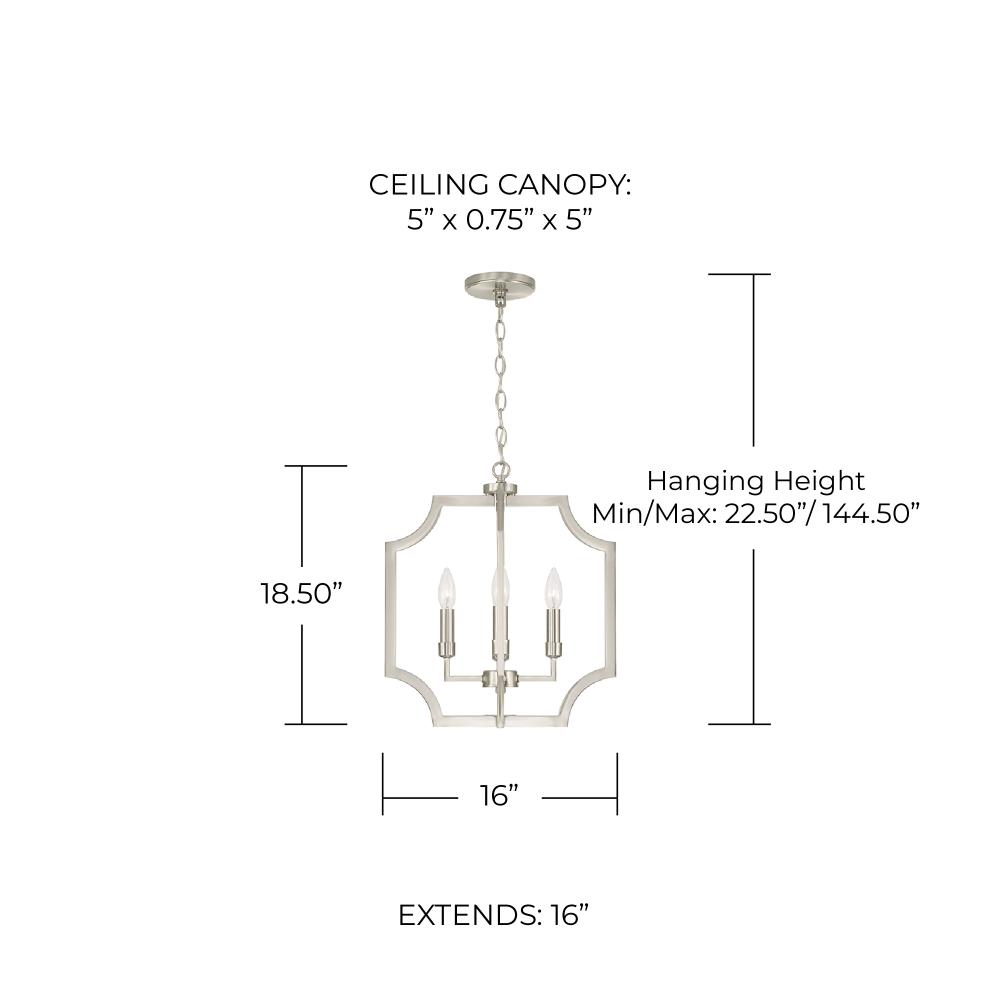 DIMENSIONS: Overall: 16"W x 18.5"H; Adjustable Hanging Height: 22.5" - 144.5"; Includes 120" Chain; 180" Wire