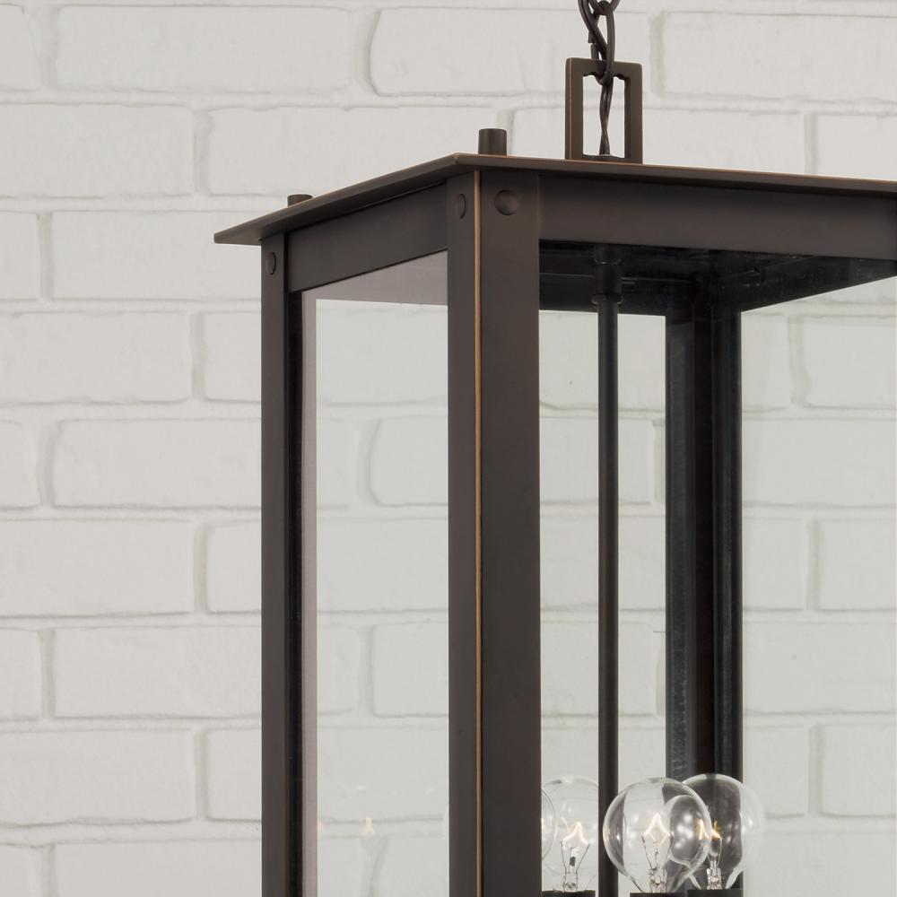 Clean and contemporary, the Hunt Hanging Lantern takes a modern approach to traditional style. The Oiled Bronze finish accents the striking frame and makes a statement in any outdoor space. Part of our Rain or Shine Collection and backed by our five-year warranty against rusting and fading.