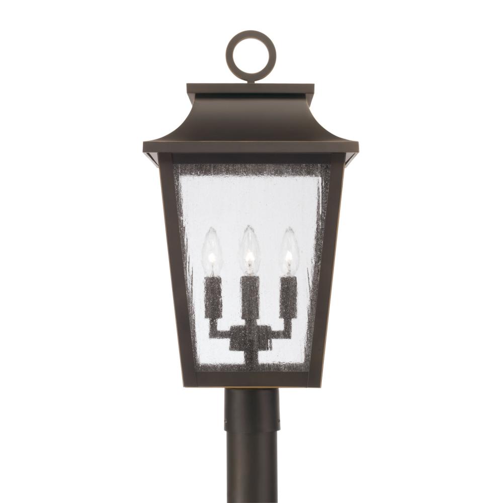Take the charm outside with the Chandler Outdoor Post Lantern. The Oiled Bronze finish accents the curved lines and ring detail atop the tapered frame, while the Antiqued Glass creates a unique glow. Part of our Rain or Shine Series and backed by our five-year warranty.