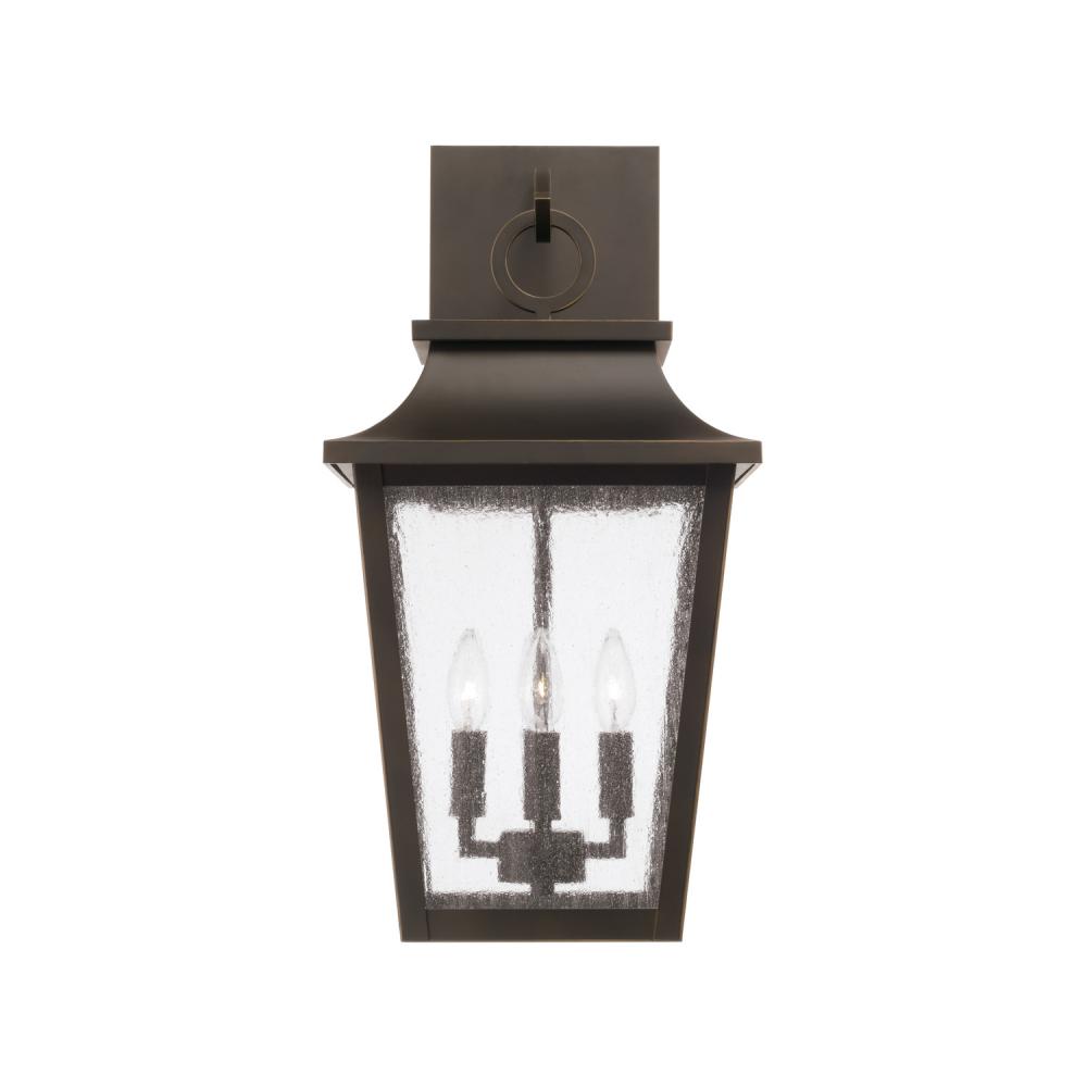 Take the charm outside with the Chandler Outdoor Wall Lantern. The Oiled Bronze finish accents the curved lines and ring detail atop the tapered frame, while the Antiqued Glass creates a unique glow. Part of our Rain or Shine Series and backed by our five-year warranty.
