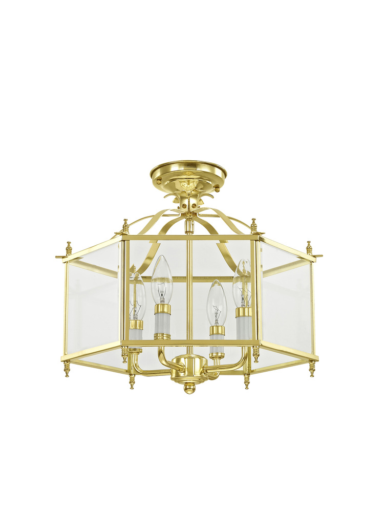 The Livingston Collection Features A Classic Six-Sided Lantern Silhouette. Polished Brass Finish With Clear Beveled Glass Gives The Fixture Charming Style And The Candelabra Bulbs Will Fill Your Home With Generous Amounts Of Illumination That Welcomes Your Guests. The Versatile Ixture Can Be Transformed Into Semi-Flush Ceiling Mounts.