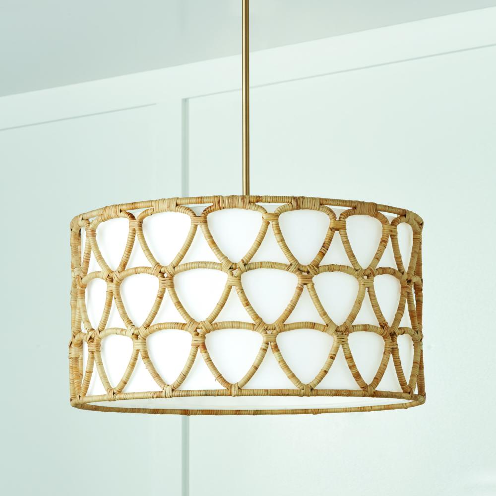 24.5"W x 24"H 4-Light Pendant in Matte Brass with White Fabric Shade and Hand-Wrapped Natural Rattan