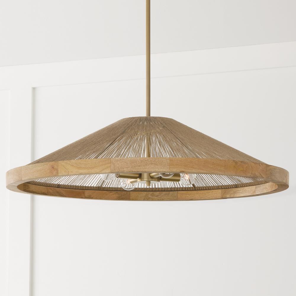 Earthy and elegant with a modern cone silhouette, the Maya Open Pendant uses natural materials to enhance any space. The combination of Light stained mango wood and hand-wrapped Natural Jute Rope creates high design with artisan appeal, while the Matte Brass finish adds a touch of shine.