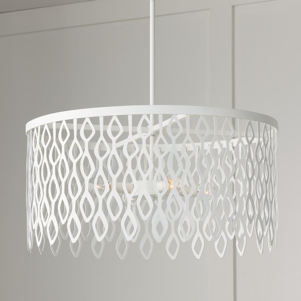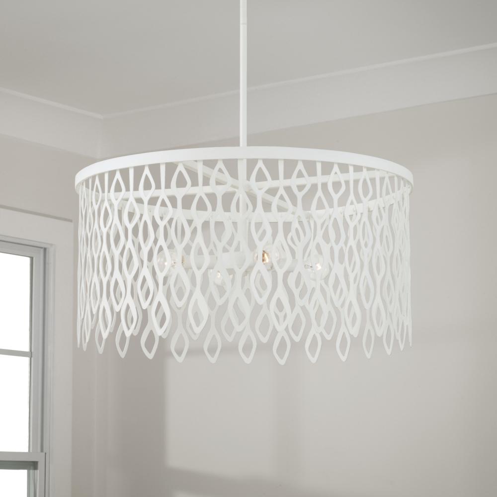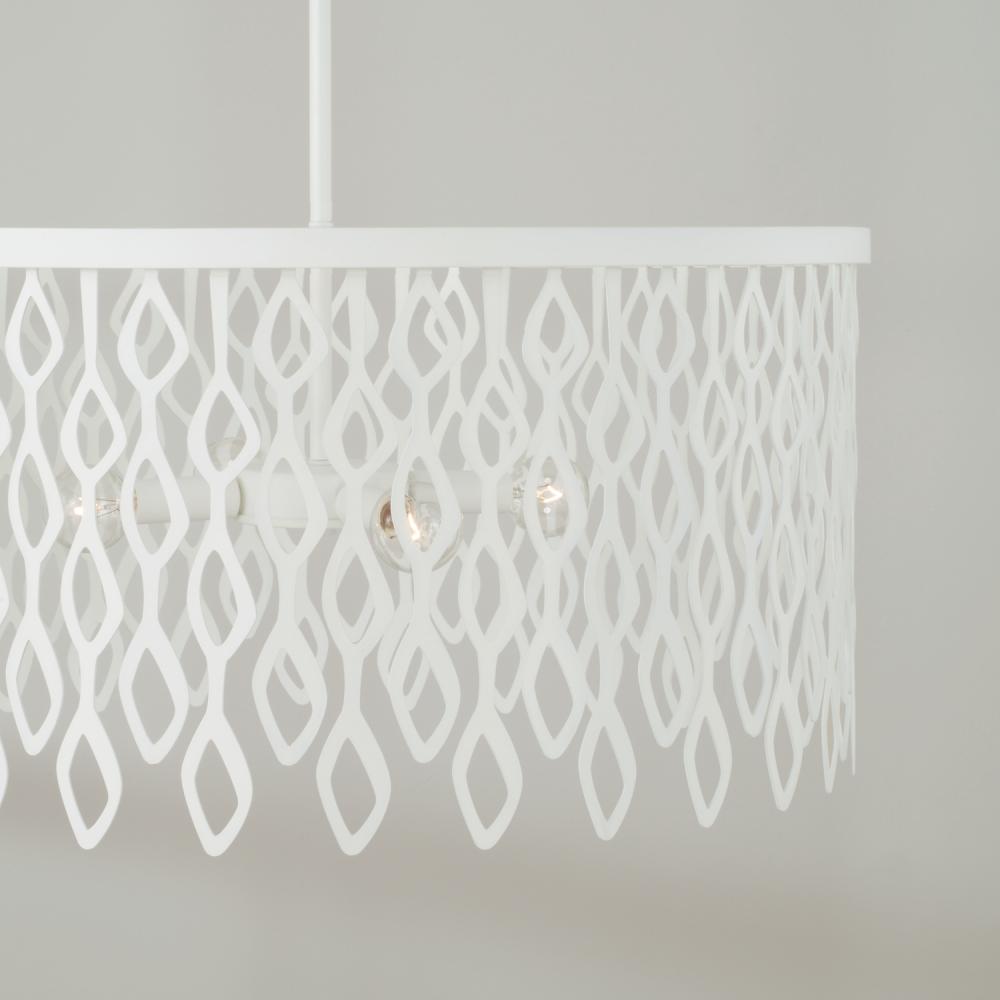 Invite modern glamour with the Matte White metal beauty of the Phoebe Pendant. With the cascading laser-cut motif, this luminaire evokes a lace-like effect that lights up from within.