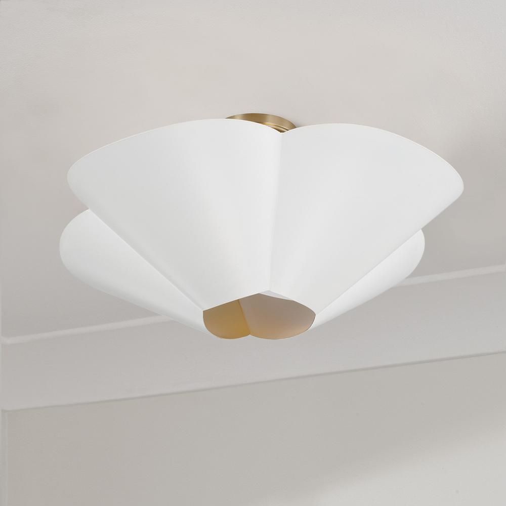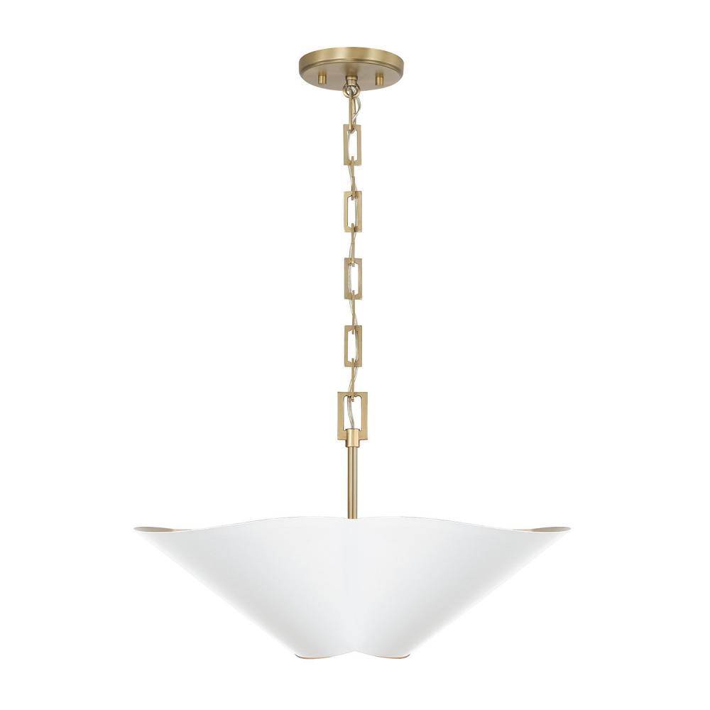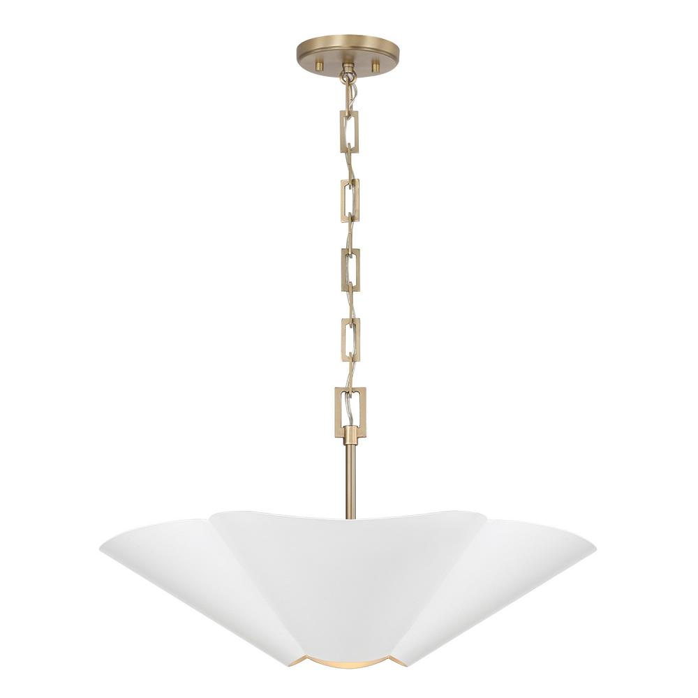 Invite all-around chic style with the 23.5 inch wide Maeve Medium Dual Mount Pendant or Semi-Flush. Whether hung as a pendant or semi flush, the subtle curvature of the petal-like shade evokes a botanical feel, enhanced by the rectangular-shaped designer chain and sophisticated two-tone finish of smooth Matte White and painted Matte Brass interior.